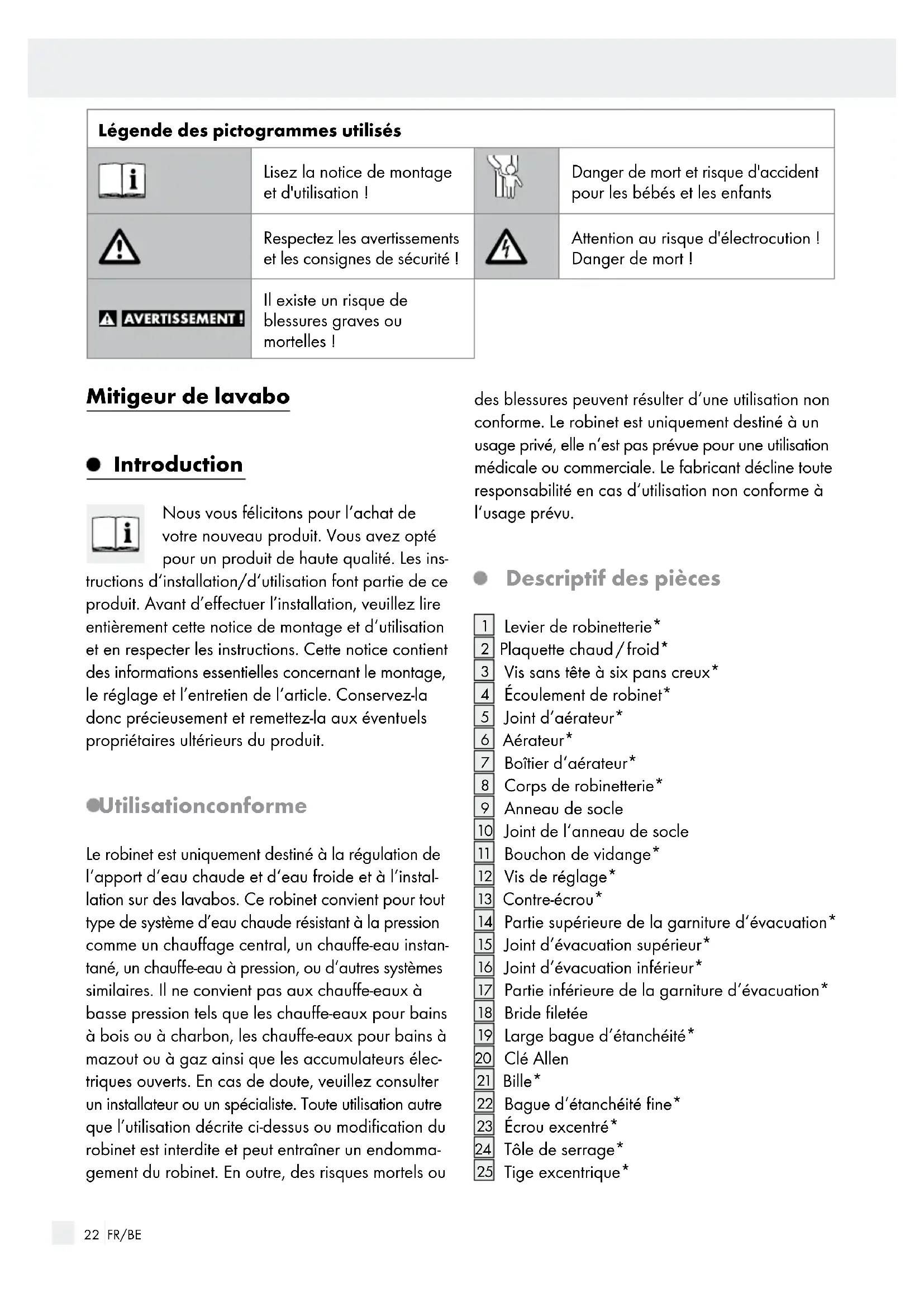 L‘EAU BOUILLANTE! Assurez-vous que la vignette froide/chaude est installée dans la bonne position pour éviter des brûlures accidentelles. En ouvrant, placez le levier de robinet sur un niveau froid et adaptez seulement ensuite la température de l‘eau. ATTENTION ! DOMMAGES MATÉRIELS ! Des dommages matériels peuvent être causés du fait d‘un montage et d‘une manipulation inappropriée du robinet. Faites réaliser le mon- tage par un spécialiste. Avant le montage, coupez l‘arrivée d‘eau de votre habitation. Lors du montage, veillez à placer correctement tous les joints sur les surfaces de joint. N‘utilisez pas le robinet sur des réservoirs basse pression et des petits ballons électriques. Utilisez le robinet uniquement lorsque la tempé- rature ambiante dépasse 0 °C. Coupez l‘arrivée d‘eau en cas de gel et vidan- gez la robinetterie. N‘utilisez pas le robinet s‘il présente des dom- mages ou son fonctionnement est entravé. Les fuites et ruptures de conduites d‘eau peuvent occasionner d‘importants dégâts matériels des bâtiments ou des appareils ménagers. Veuillez donc contrôler soigneusement l‘étanchéité de tous les raccords. Avant l‘installation, familiarisez-vous avec toutes les particularités sur place, par ex. avec les raccords d‘eau existants et les dispositifs d‘arrêt.24 FR/BE N‘entreprenez pas de réparations seul, mais mais faites appel à un spécialiste. Remplacez uniquement des pièces défectueuses par des pièces de rechange originales. Montage ATTENTION ! Avant de commencer le mon- tage, fermez l‘arrivée d‘eau chaude et l‘arrivée d‘eau froide. ATTENTION ! Ne tordez pas les tuyaux de raccordement et ne les soumettez pas à une tension. ATTENTION ! Vissez les tuyaux de raccorde- ment uniquement à la main. N‘utilisez pas de pince ou de clé plate, vous pouvez ainsi endom- mager les tuyaux de raccordement. Indication : pour le montage vous avez besoin d‘un tournevis plat et d‘une clé plate SW 10 mm. Monter le robinet Desserrez l‘écrou de fixation