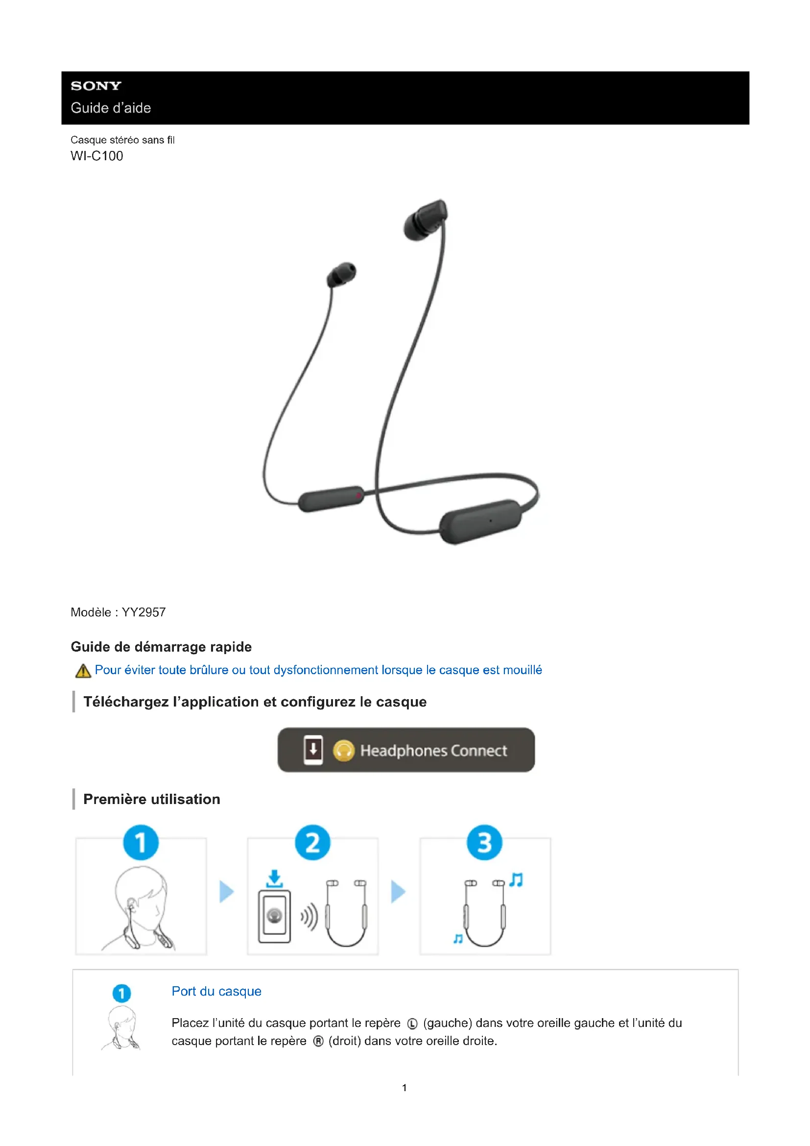 Guide d’aide Casque stéréo sans fil WI-C100 Modèle : YY2957 Guide de démarrage rapide Pour éviter toute brûlure ou tout dysfonctionnement lorsque le casque est mouillé Téléchargez l’application et configurez le casque Première utilisation Port du casque Placez l’unité du casque portant le repère (gauche) dans votre oreille gauche et l’unité du casque portant le repère (droit) dans votre oreille droite. 1Utiliser l’ensemble des fonctions et améliorer les performances Mettez à jour le logiciel du casque et de l’application « Sony | Headphones Connect » à la dernière version. Pour plus d’informations, consultez le site Web suivant : https://www.sony.net/elesupport/ Informations associées Établissement d’une connexion BLUETOOTH® manuellement Chargement du casque Mise sous tension du casque Maintenez la touche enfoncée pendant 2 secondes environ jusqu’à ce que le témoin (bleu) commence à clignoter. Le casque est mis sous tension. Suivez les instructions de l’application « Sony | Headphones Connect » téléchargée. Utilisation avec le casque Utilisez le périphérique audio. Appuyez une fois : lecture/pause + ( ) Appuyez une fois : augmenter le volume + ( ) Appuyez et maintenez enfoncé : passer au début de la piste suivante – ( ) Appuyez une fois : baisser le volume – ( ) Appuyez et maintenez enfoncé : passer au début de la piste précédente (ou de la piste actuelle au cours de la lecture) Mise en route Utilisation de la fonction Bluetooth À propos du guidage vocal Accessoires fournis Vérification du contenu de l’emballage Remplacement des embouts d’oreillettes Pièces et commandes Emplacement et fonctions des pièces À propos du témoin Port du casque 2Alimentation/Chargement Chargement du casque Durée de fonctionnement disponible Vérification du niveau de charge restant de la batterie Mise sous tension du casque Mise hors tension du casque Raccordements Établissement d’une connexion sans fil avec des périphériques Bluetooth Configuration aisée avec l’application Connexion à l’aide de l’application « Sony | Headphones Connect » Smartphone Android Pairage et connexion à un smartphone Android Connexion à un smartphone Android apparié iPhone (périphériques iOS) Pairage et connexion à un iPhone Connexion à un iPhone apparié Ordinateurs Pairage et connexion à un ordinateur (Windows® 10) Pairage et connexion à un ordinateur (Windows 8.1) Pairage et connexion à un ordinateur (Mac) Connexion à un ordinateur apparié (Windows 10) Connexion à un ordinateur apparié (Windows 8.1) Connexion à un ordinateur apparié (Mac) Autres périphériques Bluetooth Pairage et connexion à un périphérique Bluetooth Connexion à un périphérique Bluetooth apparié Écoute de musique Écoute de musique via une connexion Bluetooth Écoute de musique à partir d’un périphérique connecté via une connexion Bluetooth 3Commande du périphérique audio (connexion Bluetooth) Coupure de la connexion Bluetooth (après utilisation) À propos de 360 Reality Audio Mode de qualité sonore À propos du mode de qualité sonore Codecs pris en charge À propos de la fonction DSEE Communications téléphoniques Réception d’un appel Émission d’un appel Fonctions pour un appel téléphonique Passer un appel vidéo sur votre ordinateur Coupure de la connexion Bluetooth (après utilisation) Utilisation de la fonction d’assistance vocale Utilisation de la fonction d’assistance vocale (Google app) Utilisation de la fonction d’assistance vocale (Siri) Utilisation des applications Utilisation de l’application « Sony | Headphones Connect » Installation de l’application « Sony | Headphones Connect » Accès aux informations de support à partir de l’application « Sony | Headphones Connect » Comment conserver le logiciel à jour (pour une utilisation confortable du casque) Informations importantes Précautions Pour éviter toute brûlure ou tout dysfonctionnement lorsque le casque est mouillé Si le casque est mouillé Licences Marques Sites Web d’assistance à la clientèle 4Pour plus d’informations sur la conformité aux lois sur l’accessibilité du Web en France, reportez-vous à la page suivante. Accessibilité en France : conformité partielle Dépannage Que puis-je faire pour résoudre un problème ? Alimentation/Chargement Impossible de mettre le casque sous tension. Le chargement est impossible. La durée de chargement est trop longue. La durée de fonctionnement disponible est courte (l’autonomie de la batterie est courte). Son Aucun son n’est émis Le niveau du son est bas La qualité du son est faible, un bruit ou un son inhabituel est perçu. Le son saute fréquemment. Connexion Bluetooth Le pairage est impossible. Impossible d’établir une connexion Bluetooth. Le casque ne fonctionne pas correctement. Impossible d’entendre une personne pendant un appel/la voix de l’appelant est quasiment inaudible, votre voix ne parvient pas à la personne pendant l’appel/votre voix est quasiment inaudible pour l’appelant. Autres Les embouts d’oreillettes sont endommagés ou ont été perdus. En cas de douleur à l’oreille. Réinitialisation ou initialisation du casque Réinitialisation du casque Initialisation du casque pour restaurer les paramètres d’usine Spécifications Spécifications https://helpguide.sony.net/accessibility/france/v1/fr/index.html 55-036-709-21(2) Copyright 2022 Sony Corporation 6Guide d’aide Casque stéréo sans fil WI-C100 Utilisation de la fonction Bluetooth Le casque utilise la technologie sans fil Bluetooth qui vous permet de réaliser les actions suivantes. Écoute de musique Vous pouvez écouter de la musique à partir d’un smartphone ou d’un lecteur audio, etc. Conversation téléphonique Vous pouvez passer et recevoir des appels mains libres, tout en laissant votre smartphone ou téléphone portable dans votre sac ou votre poche. 5-036-709-21(2) Copyright 2022 S