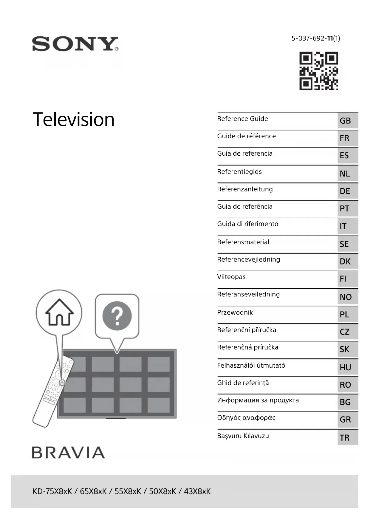 - Le « x »/« xx » qui apparaît dans le nom de modèle correspond à un chiffre qui désigne la présentation, la couleur ou la norme de télévision. Avis concernant les équipements radio Le soussigné, Sony Corporation, déclare que les équipements radioélectriques de type KD-75X82K, KD-75X81K, KD-65X82K, KD-65X81K, KD-65X80K, KD-55X82K, KD-55X81K, KD-55X80K, KD-50X82K, KD-50X81K, KD-50X80K, KD-43X82K, KD-43X81K, KD-43X80K sont conformes à la directive 2014/53/UE. Le texte complet de la déclaration UE de conformité est disponible à l’adresse internet suivante : https://compliance.sony.euPour cet équipement radio, les restrictions de mise en service ou de demandes d’autorisation d’utilisation suivantes s’appliquent en AT, BE, HR, CY, CZ, DK, EE, FI, FR, DE, EL, HU, IE, IT, LV, LT, LU, MT, NL, PL, PT, SK, SI, ES, SE, UK, UK (NI), IS, LI, NO, CH, BG, RO, TR, AL, BA, MK, MD, RS, ME, Kosovo :La bande 5150 - 5350 MHz est limitée aux utilisations en intérieur uniquement. Transport