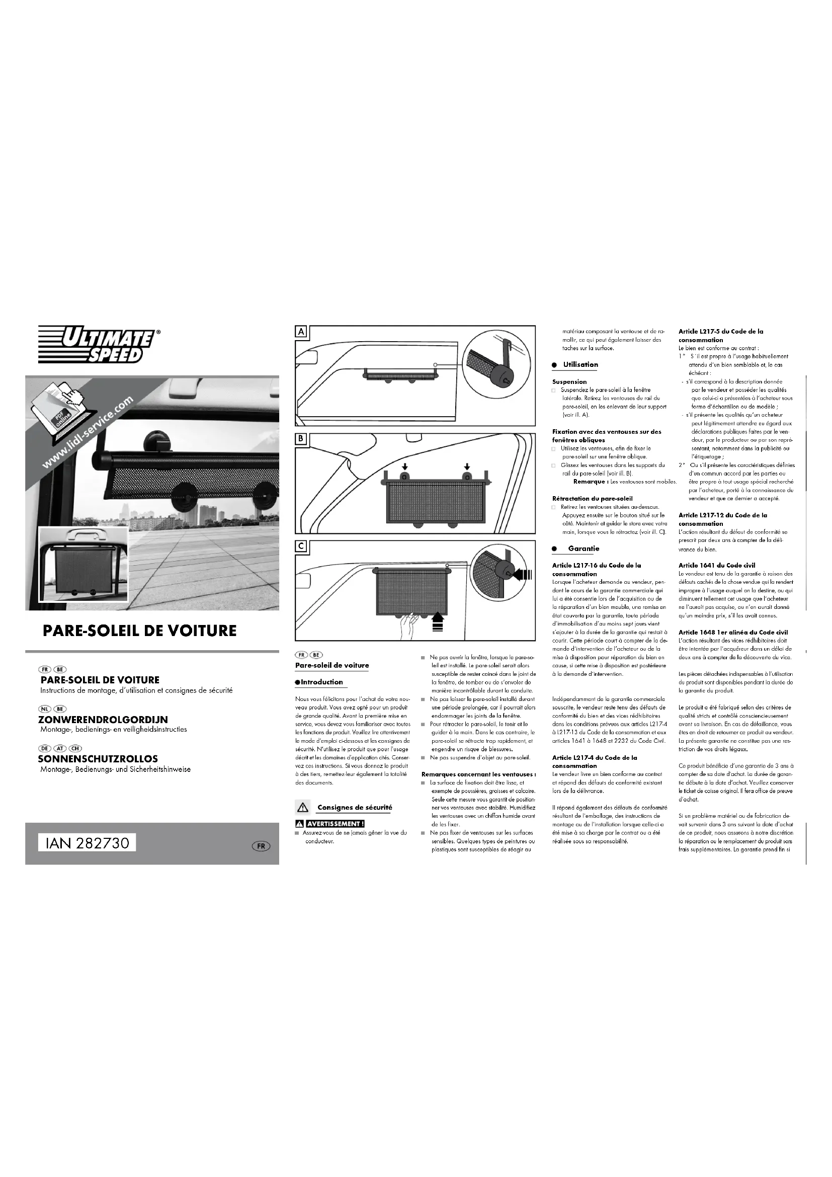 matériau composant la ventouse et de ra-mollir, ce qui peut également laisser des taches sur la surface. UtilisationSuspension Suspendez le pare-soleil à la fenêtre latérale. Retirez les ventouses du rail du pare-soleil, en les enlevant de leur support (voir ill. A).Fixation avec des ventouses sur des fenêtres obliques Utilisez les ventouses, afin de fixer le pare-soleil sur une fenêtre oblique. Glissez les ventouses dans les supports du rail du pare-soleil (voir ill. B). Remarque : Les ventouses sont mobiles.Rétractation du pare-soleil Retirez les ventouses situées au-dessous. Appuyez ensuite sur le bouton situé sur le côté. Maintenir et guider le store avec votre main, lorsque vous le rétractez (voir ill. C). GarantieArticle L217-16 du Code de la consommation Lorsque l‘acheteur demande au vendeur, pen-dant le cours de la garantie commerciale qui lui a été consentie lors de l‘acquisition ou de la réparation d‘un bien meuble, une remise en état couverte par la garantie, toute période d‘immobilisation d‘au moins sept jours vient s‘ajouter à la durée de la garantie qui restait à courir. Cette période court à compter de la de-mande d‘intervention de l‘acheteur ou de la mise à disposition pour réparation du bien en cause, si cette mise à disposition est postérieure à la demande d‘intervention.Indépendamment de la garantie commerciale souscrite, le vendeur reste tenu des défauts de conformité du bien et des vices rédhibitoires dans les conditions prévues aux articles L217-4 à L217-13 du Code de la consommation et aux articles 1641 à 1648 et 2232 du Code Civil.Article L217-4 du Code de la consommation Le vendeur livre un bien conforme au contrat et répond des défauts de conformité existant lors de la délivrance.Il répond également des défauts de conformité résultant de l‘emballage, des instructions de montage ou de l‘installation lorsque celle-ci a été mise à sa charge par le contrat ou a été réalisée sous sa responsabilité.Article L217-5 du Code de la consommationLe bien est conforme au contrat :1° S´il est propre à l‘usage habituellement attendu d‘un bien semblable et, le cas échéant : - s‘il correspond à la description donnée par le vendeur et posséder les qualités que celui-ci a présentées à l‘acheteur sous forme d‘échantillon ou de modèle ; - s‘il présente les qualités qu‘un acheteur peut légitimement attendre eu égard aux déclarations publiques faites par le ven-deur, par le producteur ou par son repré-sentant, notamment dans la publicité ou l‘étiquetage ;2° Ou s‘il présente les caractéristiques définies d‘un commun accord par les parties ou être propre à tout usage spécial recherché par l‘acheteur, porté à la connaissance du vendeur et que ce dernier a accepté.Article L217-12 du Code de la consommation L‘action résultant du défaut de conformité se prescrit par deux ans à compter de la déli-vrance du bien.Article 1641 du Code civil Le vendeur est tenu de la garantie à raison des défauts cachés de la chose vendue qui la renden impropre à l‘usage auquel on la destine, ou qui diminuent tellement cet usage que l‘acheteur ne l‘aurait pas acquise, ou n‘en aurait donné qu‘un moindre prix, s‘il les avait connus.Article 1648 1er alinéa du Code civilL‘action résultant des vices rédhibitoires doit être intentée par l‘acquéreur dans un délai de deux ans à compter de la découverte du vice.Les pièces détachées indispensables à l’utilisatio du produit sont disponibles pendant la durée de la garantie du produit. Le produit a été fabriqué selon des critères de qualité stricts et contrôlé consciencieusement avant sa livraison. En cas de défaillance, vous êtes en droit de retourner ce produit au vendeur. La présente garantie ne constitue pas une res-triction de vos droits légaux.Ce produit bénéficie d‘une garantie de 3 ans à compter de sa date d’achat. La durée de garan-tie débute à la date d’achat. Veuillez conserver e ticket de caisse original. Il fera office de preu d’achat.Si un problème matériel ou de fabrication de-vait survenir dans 3 ans suivant la date d‘achat de ce produit, nous assurons à notre discrétion réparation ou le remplacement du produit san frais supplémentaires. La garantie prend fin si