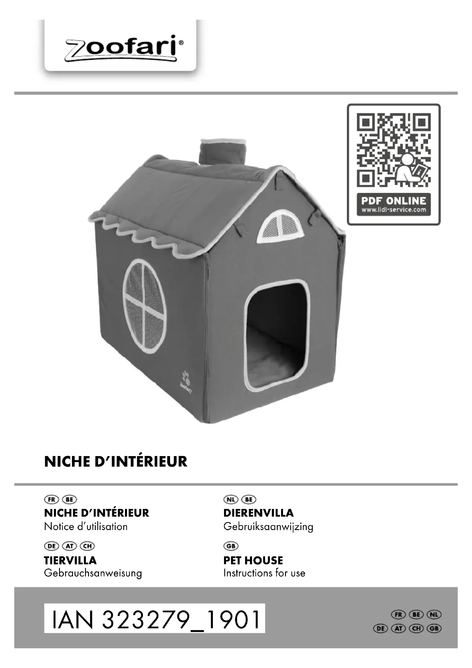 1b4 FR/BE Félicitations ! Vous venez d’acquérir un article de grande qualité. Avant la première utilisation, familiari- sez-vous avec l’article. Pour cela, veuillez lire attentive- ment la notice d’utilisation suivante. Utilisez l’article uniquement comme indiqué et pour les domaines d’utilisation mentionnés. Conservez bien cette notice d’utilisation. Si vous cédez l’article à un tiers, veillez à lui remettre l’ensemble de la documentation. Étendue de la livraison 1 support (1) 1 toit (2) 1 coussin (3) 1 étagère (4) 1 notice d’utilisation Caractéristiques techniques Date de fabrication (mois/année) : 08/2019 Utilisation conforme à sa destination L’article sert de surface de couchage pour les chats et les petits chiens à l’intérieur. L’article n’est pas prévu pour une utilisation commerciale. Consignes de sécurité Important : lisez attentivement cette notice d’utilisation et conservez-la abso- lument ! Danger de mort !