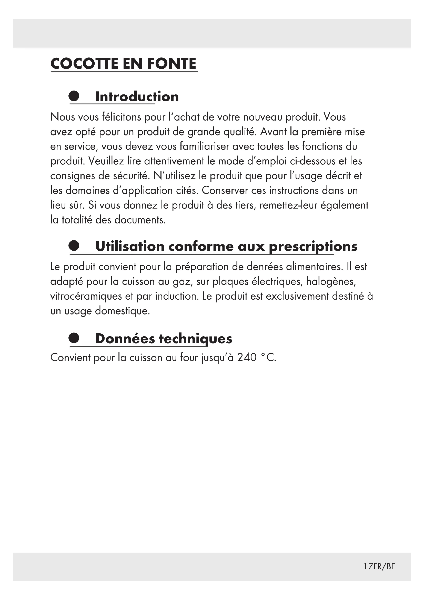 Introduction Nous vous félicitons pour l‘achat de votre nouveau produit. Vous avez opté pour un produit de grande qualité. Avant la première mise en service, vous devez vous familiariser avec toutes les fonctions du produit. Veuillez lire attentivement le mode d’emploi ci-dessous et les consignes de sécurité. N’utilisez le produit que pour l’usage décrit et les domaines d’application cités. Conserver ces instructions dans un lieu sûr. Si vous donnez le produit à des tiers, remettez-leur également la totalité des documents. Utilisation conforme aux prescriptions Le produit convient pour la préparation de denrées alimentaires. Il est adapté pour la cuisson au gaz, sur plaques électriques, halogènes, vitrocéramiques et par induction. Le produit est exclusivement destiné à un usage domestique. Données techniques Convient pour la cuisson au four jusqu’à 240 °C.18 FR/BE Consignes de sécurité CONSERVEZ TOUTES LES CONSIGNES DE SÉCURITÉ ET INSTRUCTIONS POUR VOUS Y REPORTER ULTÉRIEUREMENT!