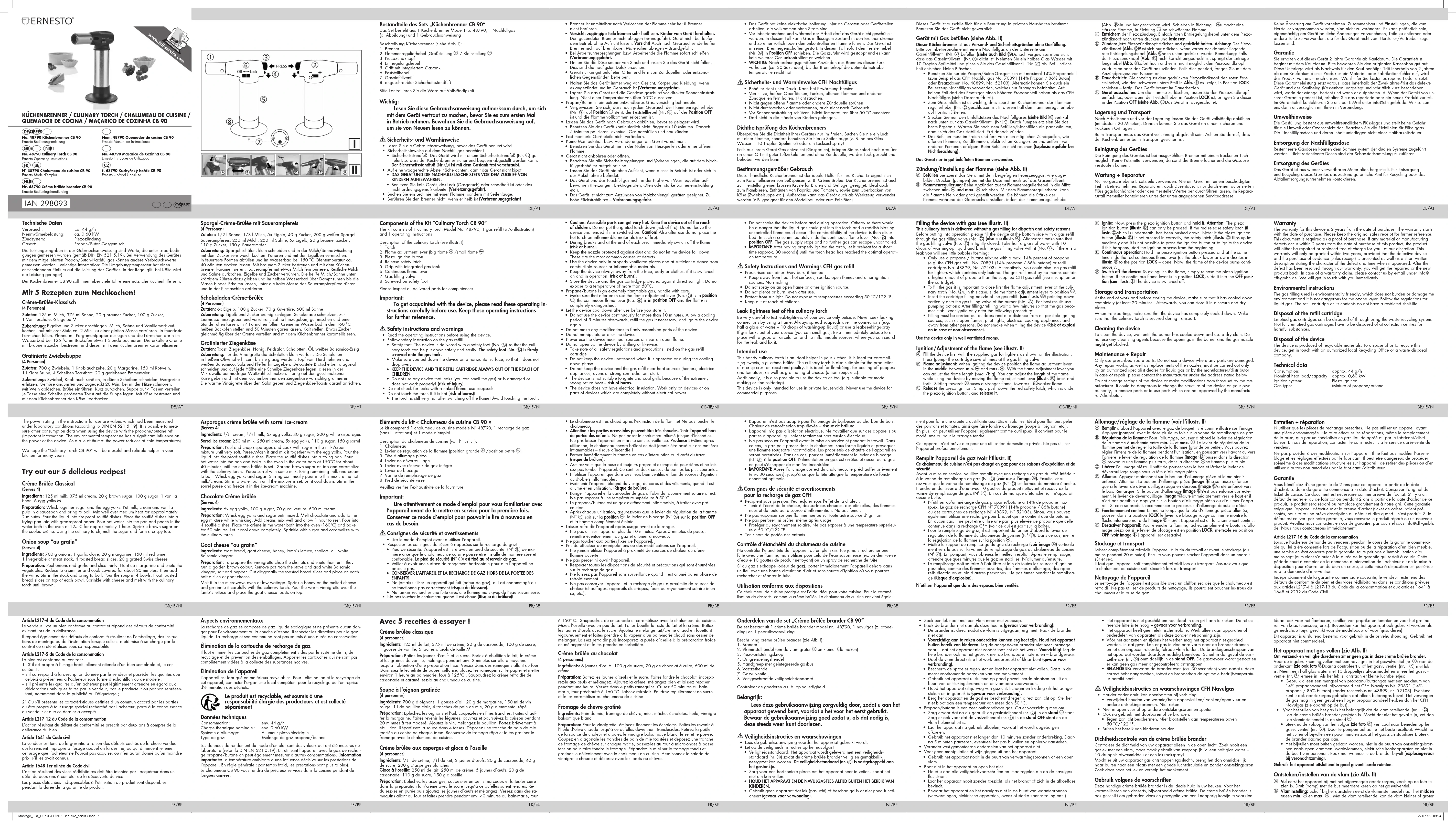 l de lait, 5 jaunes d’œufs, 20 g de cassonade, 40 g de sucre, 200 g d’asperges blanchesGlace à l’oseille: 250 ml de lait, 250 ml de crème, 5 jaunes d’œufs, 20 g de cassonade, 110 g de sucre, 150 g d’oseillePréparation: Épluchez les asperges, coupez-les en petits morceaux et faites-les cuire dans la préparation lait/crème avec le sucre jusqu’à ce qu’elles soient tendres. Ré-duisez-les en purée puis ajoutez les jaunes d’œufs et mélangez. Versez dans des ra-mequins allant au four et faites prendre pendant env. 40 minutes au bain-marie, four FR/BE 2141_FR_cc2017.indd 9 14.05.18 17:19 à 150° C. Saupoudrez de cassonade et caramélisez avec le chalumeau de cuisine. Mixez l’oseille avec un peu de lait. Faites bouillir le reste de lait et la crème. Battez les jaunes d’œufs avec le sucre. Ajoutez le mélange lait/crème chaud en fouettant vigoureusement et faites prendre à la vapeur d‘un bain-marie chaud sans cesser de mélanger. Laissez refroidir puis incorporez la purée d’oseille à la préparation froide en mélangeant et faites prendre en sorbetière. Crème brûlée au chocolat (4 personnes)Ingrédients: 6 jaunes d’œufs, 100 g de sucre, 70 g de chocolat à cuire, 600 ml de crèmePréparation: Battez les jaunes d’œufs et le sucre. Faites fondre le chocolat, incorpo-rez-le aux œufs et mélangez. Ajoutez la crème, mélangez bien et laissez reposer pendant une heure. Versez dans 4 petits ramequins. Cuisez 50 minutes au bain- marie, four préchauffé à 160 °C. Laissez refroidir. Poudrez régulièrement de sucre et faites caraméliser au chalumeau de cuisine Fromage de chèvre gratiné Ingrédients: Pain de mie, fromage de chèvre, miel, mâche, échalotes, huile, vinaigre balsamique blancPréparation: Pour la vinaigrette, émincez finement les échalotes. Faites-les revenir à l’huile d’olive chaude jusqu’à ce qu’elles deviennent translucides. Retirez la poêle de la source de chaleur et ajoutez le vinaigre balsamique blanc, le sel et le poivre. Coupez en diagonale les tranches de pain de mie toastées et déposez une tranche de fromage de chèvre sur chaque moitié, passez-les au four à micro-ondes à basse tension pour faire fondre le fromage. Répandez le miel sur le fromage fondu et gratinez-le délicatement avec le chalumeau de cuisine. Assaisonnez la salade de vinaigrette chaude et décorez avec les toasts au chèvre.FR/BE 2141_FR_cc2017.indd 10 14.05.18 17:19 Onderdelen van de set „Crème brûlée brander CB 90“ De set bestaat uit 1 crème brûlée brander model nr. 48790, 1 navulgas (z. afbeel-ding) en 1 gebruiksaanwijzing Beschrijving crème brûlée brander (zie Afb. I):1. Brander2. Vlaminstelhendel (om de vlam groter en kleiner te maken)3. Piëzo-ontstekingsknop 4. Ontgrendelingshendel 5. Handgreep met geïntegreerde gasbus 6. Vastzethendel 7. Gasvulventiel8. Vastgeschroefde veiligheidsstandaard Controleer de goederen a.u.b. op volledigheid. Belangrijk: Lees deze gebruiksaanwijzing zorgvuldig door, zodat u aan het apparaat gewend bent, voordat u het voor het eerst gebruikt. Bewaar de gebruiksaanwijzing goed zodat u, als dat nodig is, deze steeds weer kunt doorlezen. Veiligheidsinstructies en waarschuwingen