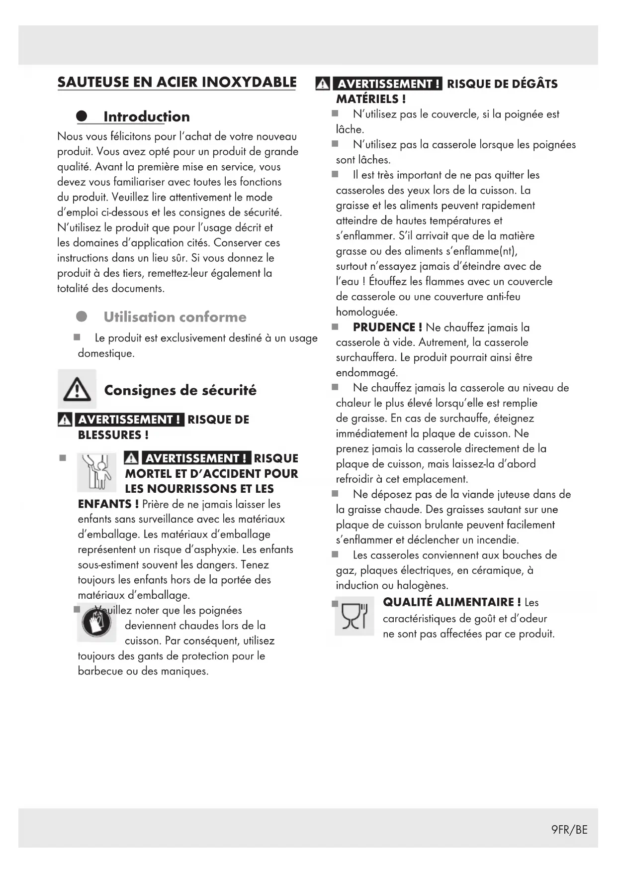 MATÉRIELS! N’utilisez pas le couvercle, si la poignée est lâche. N’utilisez pas la casserole lorsque les poignées sont lâches. Il est très important de ne pas quitter les casseroles des yeux lors de la cuisson. La graisse et les aliments peuvent rapidement atteindre de hautes températures et s’enflammer. S’il arrivait que de la matière grasse ou des aliments s’enflamme(nt), surtout n’essayez jamais d’éteindre avec de l’eau! Étouffez les flammes avec un couvercle de casserole ou une couverture anti-feu homologuée. PRUDENCE! Ne chauffez jamais la casserole à vide. Autrement, la casserole surchauffera. Le produit pourrait ainsi être endommagé. Ne chauffez jamais la casserole au niveau de chaleur le plus élevé lorsqu’elle est remplie de graisse. En cas de surchauffe, éteignez immédiatement la plaque de cuisson. Ne prenez jamais la casserole directement de la plaque de cuisson, mais laissez-la d’abord refroidir à cet emplacement. Ne déposez pas de la viande juteuse dans de la graisse chaude. Des graisses sautant sur une plaque de cuisson brulante peuvent facilement s’enflammer et déclencher un incendie. Les casseroles conviennent aux bouches de gaz, plaques électriques, en céramique, à induction ou halogènes.