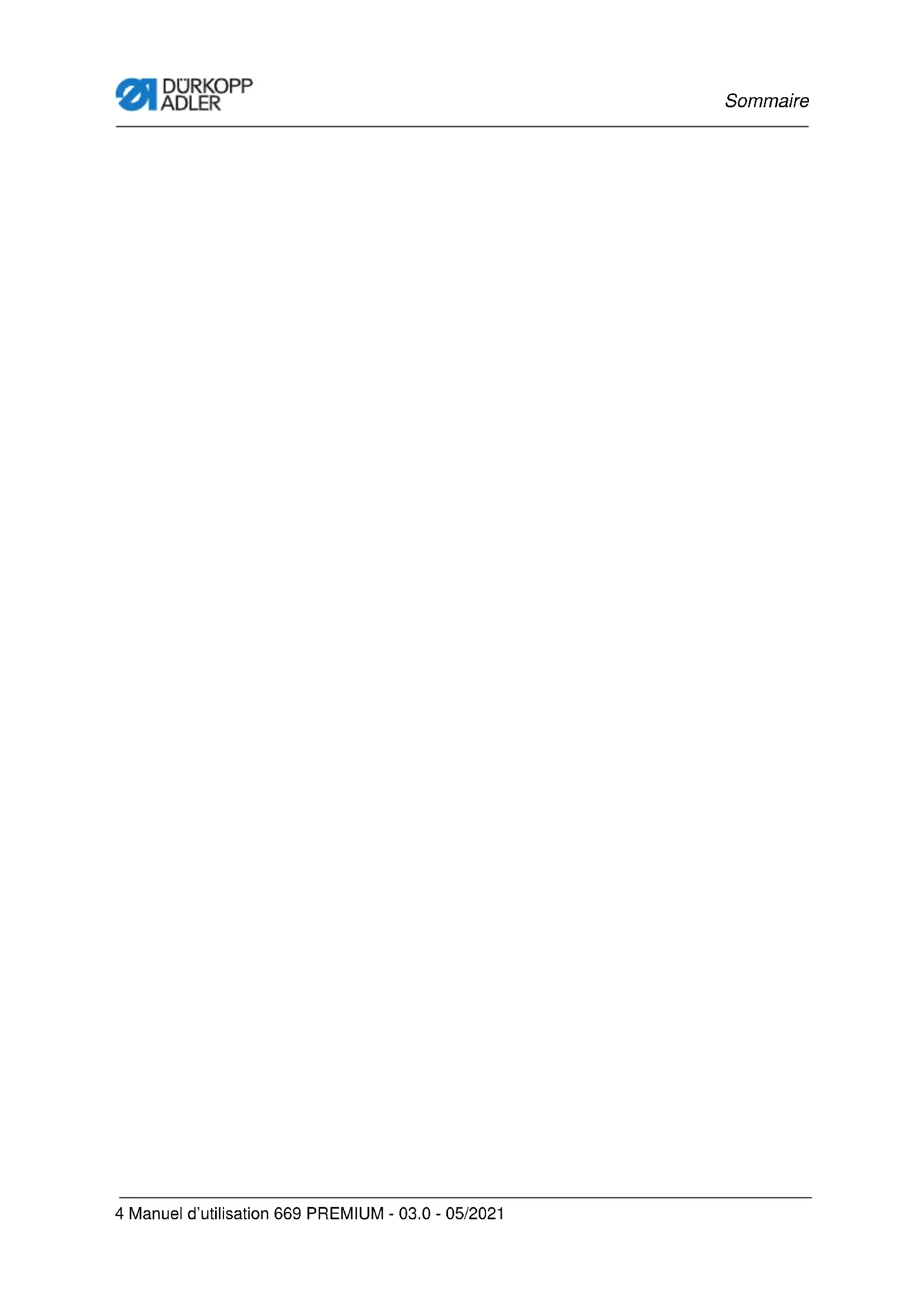 669 PREMIUM Manuel d’utilisationTous droits réservés. Propriété de Dürkopp Adler GmbH et protection par les droits d’auteur. Toute réutilisation, même partielle, de ces contenus est interdite sans l’autorisation écrite préalable de Dürkopp Adler GmbH. Copyright © Dürkopp Adler GmbH 2021 IMPORTANT