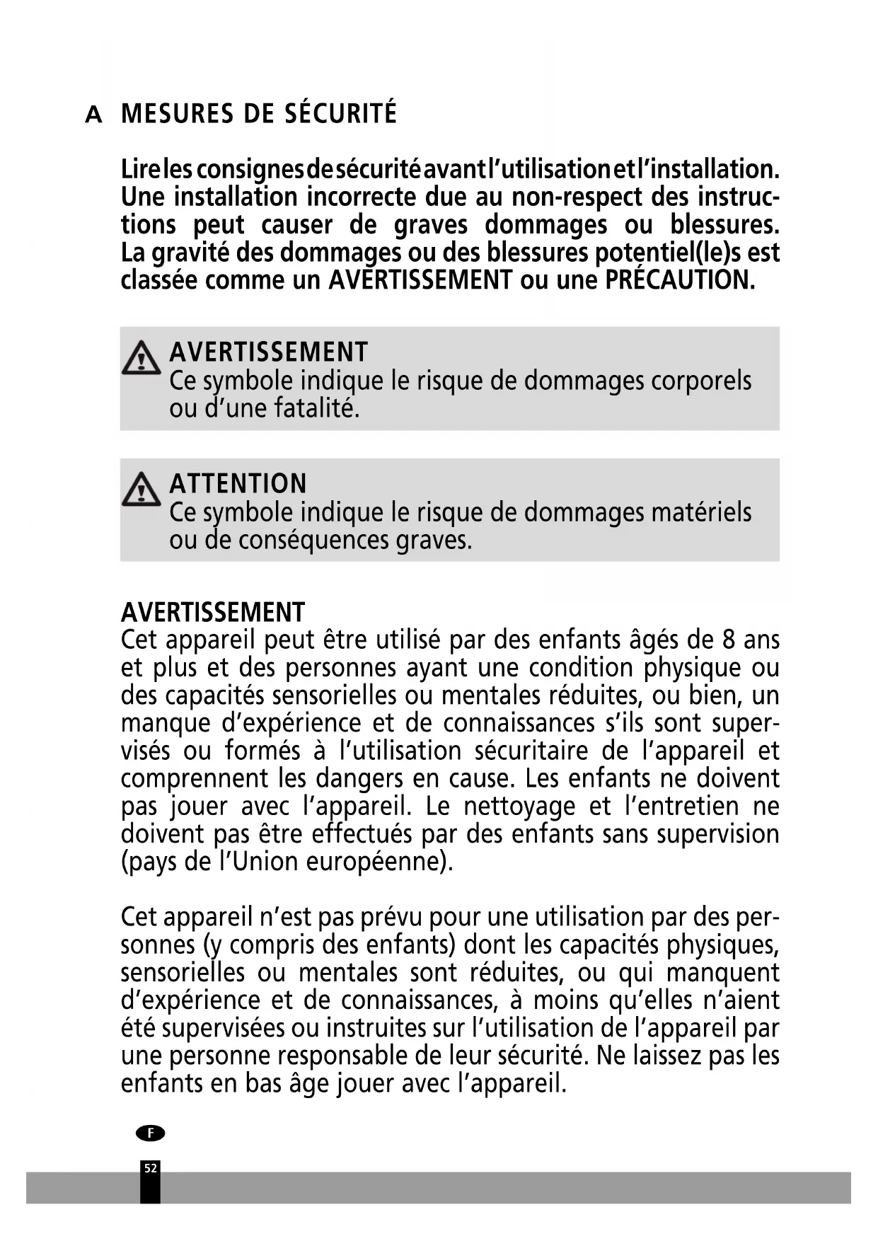 Lire les consignes de sécurité avant l’utilisation et l’installation. Une installation incorrecte due au non-respect des instruc- tions peut causer de graves dommages ou blessures. La gravité des dommages ou des blessures potentiel(le)s est classée comme un AVERTISSEMENT ou une PRÉCAUTION. AVERTISSEMENT Ce symbole indique le risque de dommages corporels ou d’une fatalité. ATTENTION Ce symbole indique le risque de dommages matériels ou de conséquences graves. AVERTISSEMENT Cet appareil peut être utilisé par des enfants âgés de 8 ans et plus et des personnes ayant une condition physique ou des capacités sensorielles ou mentales réduites, ou bien, un manque d’expérience et de connaissances s’ils sont super- visés ou formés à l’utilisation sécuritaire de l’appareil et comprennent les dangers en cause. Les enfants ne doivent pas jouer avec l’appareil. Le nettoyage et l’entretien ne doivent pas être effectués par des enfants sans supervision (pays de l’Union européenne). Cet appareil n’est pas prévu pour une utilisation par des per- sonnes (y compris des enfants) dont les capacités physiques, sensorielles ou mentales sont réduites, ou qui manquent d’expérience et de connaissances, à moins qu’elles n’aient été supervisées ou instruites sur l’utilisation de l’appareil par une personne responsable de leur sécurité. Ne laissez pas les enfants en bas âge jouer avec l’appareil.