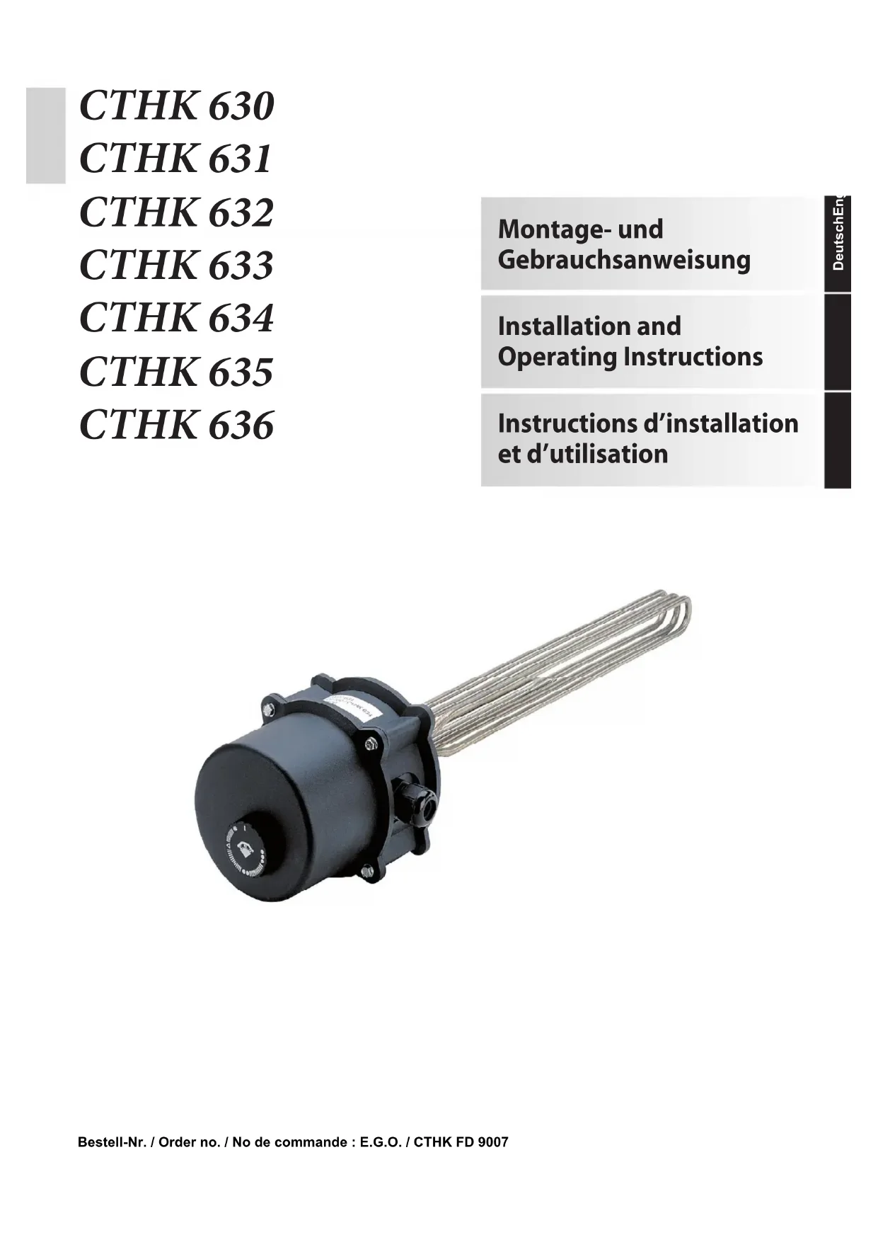8 Caractéristiques techniques Tous les matériaux utilisés ont de bonnes propriétés thermiques, électriques et mécaniques et offrent une excellente protection contre la corrosion. Les chauffages vissés comportent un manteau en acier inoxydable (Ø 6,5 mm, matériau 2.4858 / INCOLOY 825) avec une masse isolante très condensée dans laquelle un enroulement de chauffage est encastré. La tête vissée avec filetage d'implantation G 1 ½“ est fabriquée à partir d'acier inoxydable (matériau 1.4301 / AISI 304). Le boîtier de raccordement peut, après fixation du filetage d'implantation, être monté dans quatre positions différentes (décalées de 90°). Hauteur du capot de protection : 120 mm Plage de réglage du régulateur de température : Diamètre du capot de protection 120 mm (sans collier de fixation ni vissage) Chauffage vissé réglable de 30 °C à 80 °C environ, position antigel également prévue. La bride du chauffage vissé est fournie avec son joint. Régulateur de température (RT) avec limiteur de température de sécurité (LTS) suivant DIN EN 60335-2-21 Niveau de protection antigel 11 °C +/- 7K Degré de protection IP54 Le chauffage vissé est testé jusqu'à une pression statique de 10 bars. La pression de service ne doit pas dépasser 10 bars. ATTENTION ! Lors du raccordement électrique : les chauffages vissés CTHK 630 - 636 sont raccordés au gestionnaire de pompe à chaleur au moyen de contacteurs. Tenir compte du schéma de branchement du gestionnaire. CTHK 630 et CTHK 631 : modèles monophasés pour branchement direct 1 ~ 230 V CTHK 632 - CTHK 636 : modèles triphasés pour branchement direct 3 ~ 400 V Type Puissance nominale en KW Tension nominale en V Nombre de chauffages vissés Groupe commutateur 1 en KW Profondeur d’immersion en mm Longueur non chauffée en mm Possibilité de montage horizontale Raccord fileté Homologatio n DVGW et KTW Certification VDE CTHK 630 4,5 ~230 1 4,5 400 95 x R 1 1/2“ x x CTHK 631 2,0 ~230 1 2,0 250 95 x R 1 1/2“ x x CTHK 632 2,9 3~400 3 2,9 250 95 x R 1 1/2“ x x CTHK 633 4,5 3~400 3 4,5 350 110 x R 1 1/2“ x x CTHK 634 6,0 3~400 3 6,0 450 110 x R 1 1/2“ x x CTHK 635 7,5 3~400 3 7,5 550 110 x R 1 1/2“ x x CTHK 636 9,0 3~400 3 9,0 650 110 x R 1 1/2“ x xGDD GmbH D-95326 Kulmbach Irrtümer und Änderungen vorbehalten. Subject to alterations and errors. Sous réserve d’erreurs et modifications.