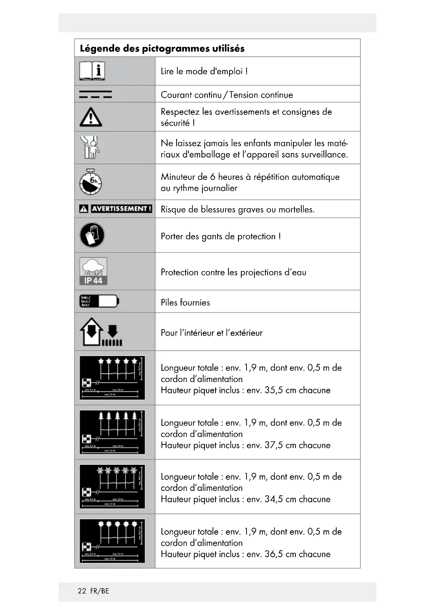 Légende des pictogrammes utilisés ..................... Page 22 Introduction ..............................................................................Page 23 Utilisation conforme ....................................................................... Page 23 Descriptif des éléments .................................................................. Page 23 Caractéristiques techniques ...........................................................Page 23 Contenu de la livraison ..................................................................Page 24 Consignes de sécurité ......................................................Page 24 Mise en service ...................................................................... Page 25 Planter les bâtons LED dans le sol .................................................Page 25 Insérer / remplacer les piles ...........................................................Page 25 Allumer / éteindre les bâtons lumineux LED ..................................Page 26 Nettoyage et entretien ...................................................Page 26 Mise au rebut ..........................................................................Page 26 Garantie et service après-vente .............................Page 27 Adresse du service après-vente .....................................................Page 29 Fabricant .........................................................................................Page 2922 FR/BE Légende des pictogrammes utilisés Lire le mode d'emploi! Courant continu / Tension continue Respectez les avertissements et consignes de sécurité ! Ne laissez jamais les enfants manipuler les maté- riaux d'emballage et l’appareil sans surveillance. Minuteur de 6 heures à répétition automatique au rythme journalier Risque de blessures graves ou mortelles. Porter des gants de protection! Protection contre les projections d’eau Piles fournies Pour l‘intérieur et l‘extérieur Longueur totale : env. 1,9 m, dont env. 0,5 m de cordon d’alimentation Hauteur piquet inclus : env. 35,5 cm chacune Longueur totale : env. 1,9 m, dont env. 0,5 m de cordon d’alimentation Hauteur piquet inclus : env. 37,5 cm chacune Longueur totale : env. 1,9 m, dont env. 0,5 m de cordon d’alimentation Hauteur piquet inclus : env. 34,5 cm chacune Longueur totale : env. 1,9 m, dont env. 0,5 m de cordon d’alimentation Hauteur piquet inclus : env. 36,5 cm chacune23 FR/BE Pollution de l’environnement par la mise au rebut incorrecte des piles / piles rechargeables !