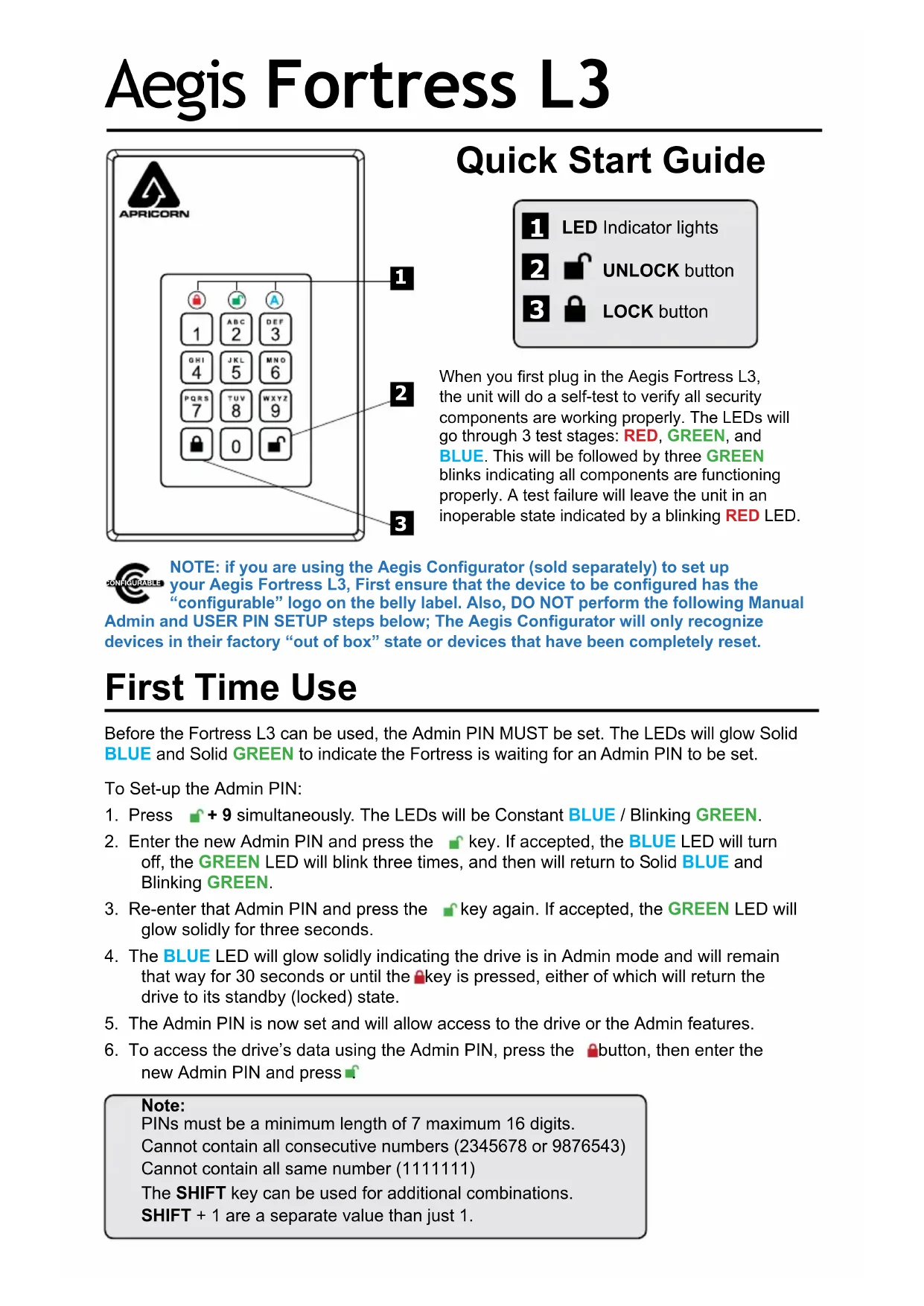 UNLOCK BoutonVoyants LEDLOCK BoutonLorsque vous branchez pour la première fois la Aegis Fortress L3, l’unité effectuera un test automatique pour vérier que tous les composants de sécurité fonctionnent correctement. Les voyants passent par 3 étapes de test: ROUGE, VERT et BLEU. Cela sera suivi de trois clignotements VERT indiquant que tous les composants fonctionnent correctement. Un échec de test laissera l’appareil dans un état inutilisable, indiqué par une LED ROUGE clignotante. Première utilisation Avant de pouvoir utiliser la Fortress L3, le code PIN administrateur DOIT être déni. Les voyants s’allumeront en BLEU et VERT en continu pour indiquer que la Forteresse attend qu’un code PIN administrateur soit déni.Pour congurer le code PIN administrateur:1. Appuyez sur + 9 simultanément. Les voyants seront bleu xe / vert clignotant.2. Entrez le nouveau code PIN administrateur et appuyez sur la touche . Si elle est acceptée, le voyant bleu s’éteindra, le voyant vert clignotera trois fois, puis reviendra à bleu xe et vert clignotant.3. Entrez à nouveau ce code PIN administrateur et appuyez à nouveau sur la touche Si elle est acceptée, la DEL VERTE reste allumée pendant trois secondes.4. La DEL BLEUE reste allumée, indiquant que le lecteur est en mode Admin. Elle le restera pendant 30 secondes ou jusqu’à ce que vous appuyiez sur la touche ;5. Le code PIN de l’administrateur est maintenant déni et permettra l’accès au lecteur ou aux fonctionnalités de l’administrateur.6. Pour accéder aux données du lecteur à l’aide du code PIN administrateur, appuyez sur le bouton , puis entrez le nouveau code PIN Admin et appuyez sur . Remarque : Si vous utilisez le congurateur Aegis (vendu séparément) pour congurer votre Fortress L3, commencez par vérier que le périphérique à congurer porte le logo «congurable» sur l’étiquette du ventre. Si vous utilisez le con gurateur pour installer vos produits sécurisés Aegis, NE suivez PAS les étapes ci-dessous ; les produits sécurisés Aegis peuvent être reconnus par l’Aegis Con gurator uniquement en Mode prêt à l’emploi. CONFIGURABLERemarque:Les codes condentiels doivent avoir une longueur minimale de 7 maximum et 16 chiffres.Ne peut pas contenir tous les numéros consécutifs (2345678 ou 9876543)Ne peut pas contenir tous le même numéro (1111111)La touche SHIFT peut être utilisée pour des combinaisons supplémentaires.MAJ + 1 sont une valeur distincte de 1