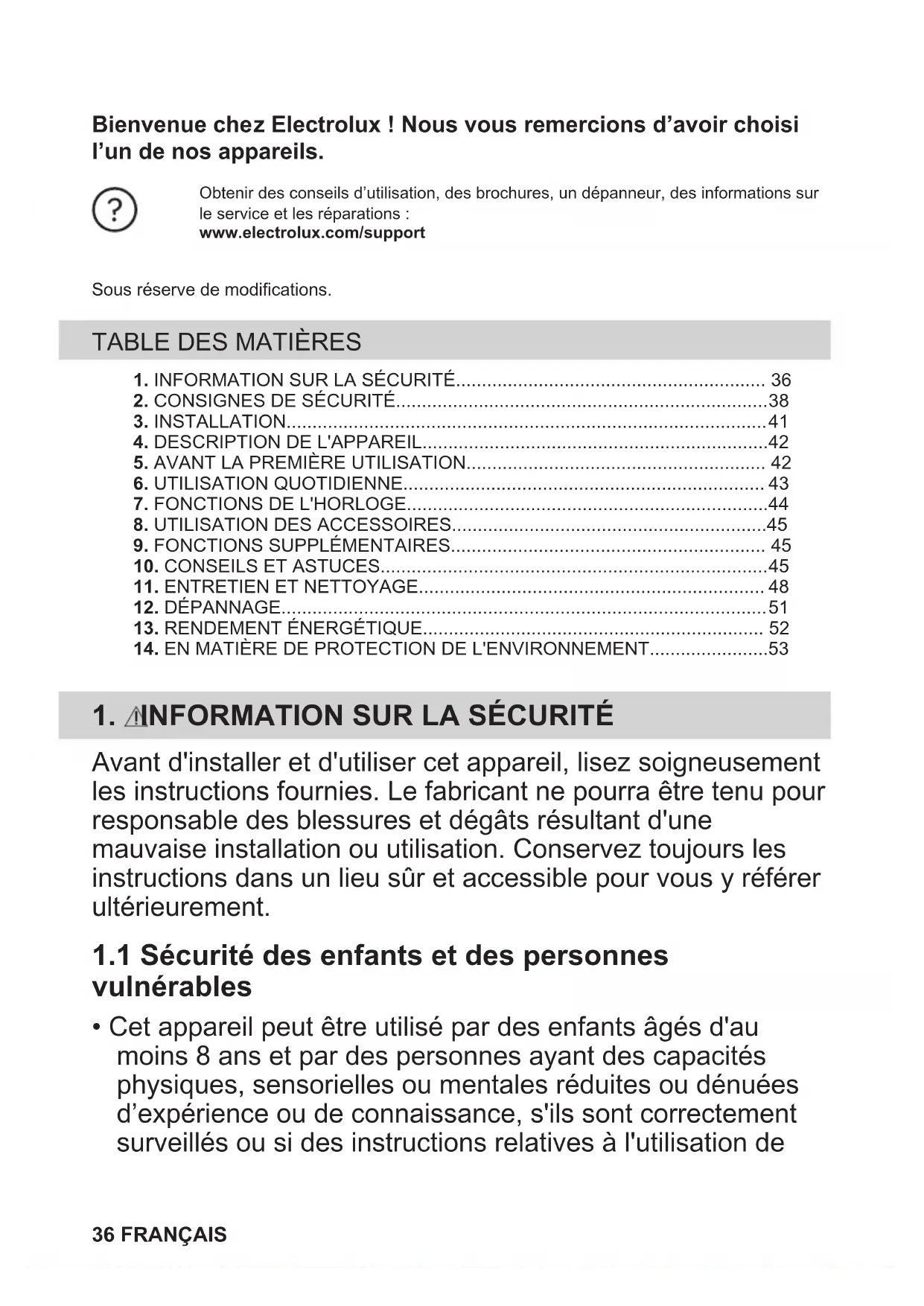 Recyclez les matériaux portant le symbole . Déposez les emballages dans les conteneurs prévus à cet effet. Contribuez à la protection de l'environnement et à votre sécurité, recyclez vos produits électriques et électroniques. Ne jetez pas les appareils portant le symbole avec les ordures ménagères. Emmenez un tel produit dans votre centre local de recyclage ou contactez vos services municipaux. Concerne la France uniquement : FRANÇAIS 53Willkommen bei Electrolux! Danke, dass Sie sich für unser Gerät entschieden haben. Holen Sie sich Anwendungshinweise, Prospekte, Fehlerbehebungs-, Service- undReparatur-Informationen unter electrolux.com/supportÄnderungen vorbehalten. INHALTSVERZEICHNIS