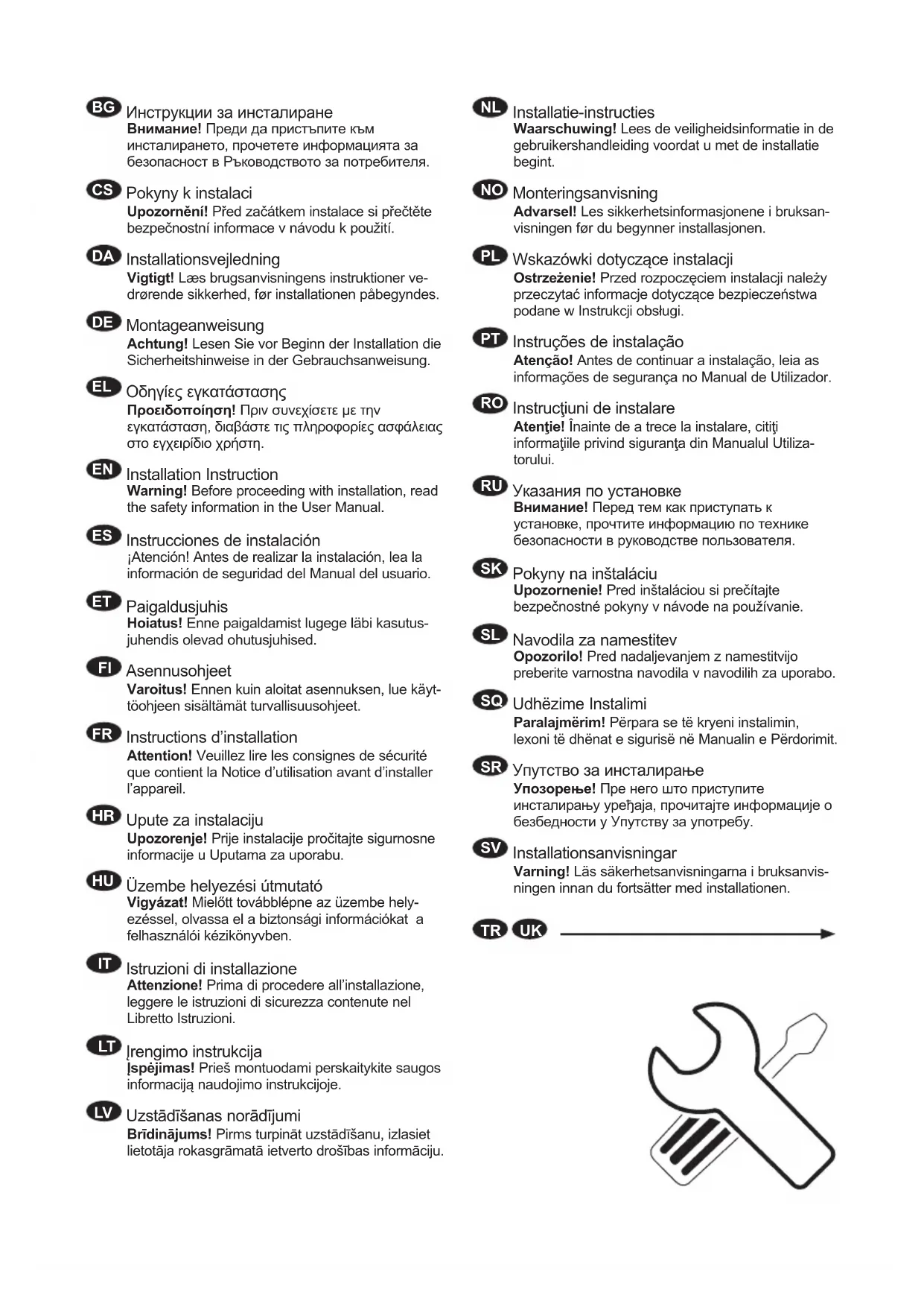 Instructions d’installation Attention! Veuillez lire les consignes de sécurité que contient la Notice d’utilisation avant d’installer l’appareil.