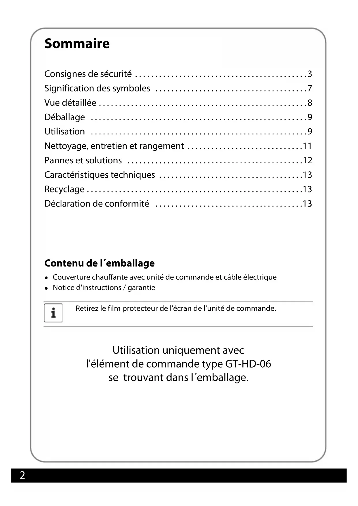 - Déclaration de conformité Contenu de l´emballage Couverture chauffante avec unité de commande et câble électrique Notice d'instructions / garantie Retirez le film protecteur de l'écran de l'unité de commande. Utilisation uniquement avec l'élément de commande type GT-HD-06 se trouvant dans l´emballage.3 INSTRUCTIONS IMPORTANTES. p. 13
