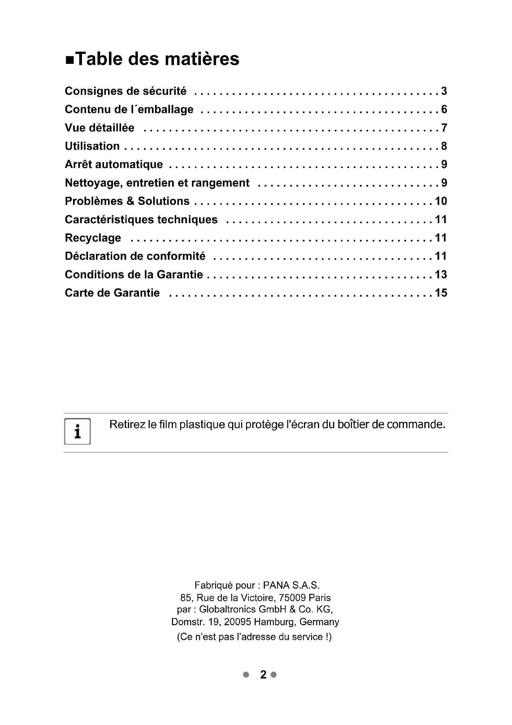 - Carte de Garantie Fabriqué pour : PANA S.A.S. 85, Rue de la Victoire, 75009 Paris par : Globaltronics GmbH & Co. KG, Domstr. 19, 20095 Hamburg, Germany (Ce n’est pas l’adresse du service !) Retirez le film plastique qui protège l'écran du boîtier de commande. 3 p. 15