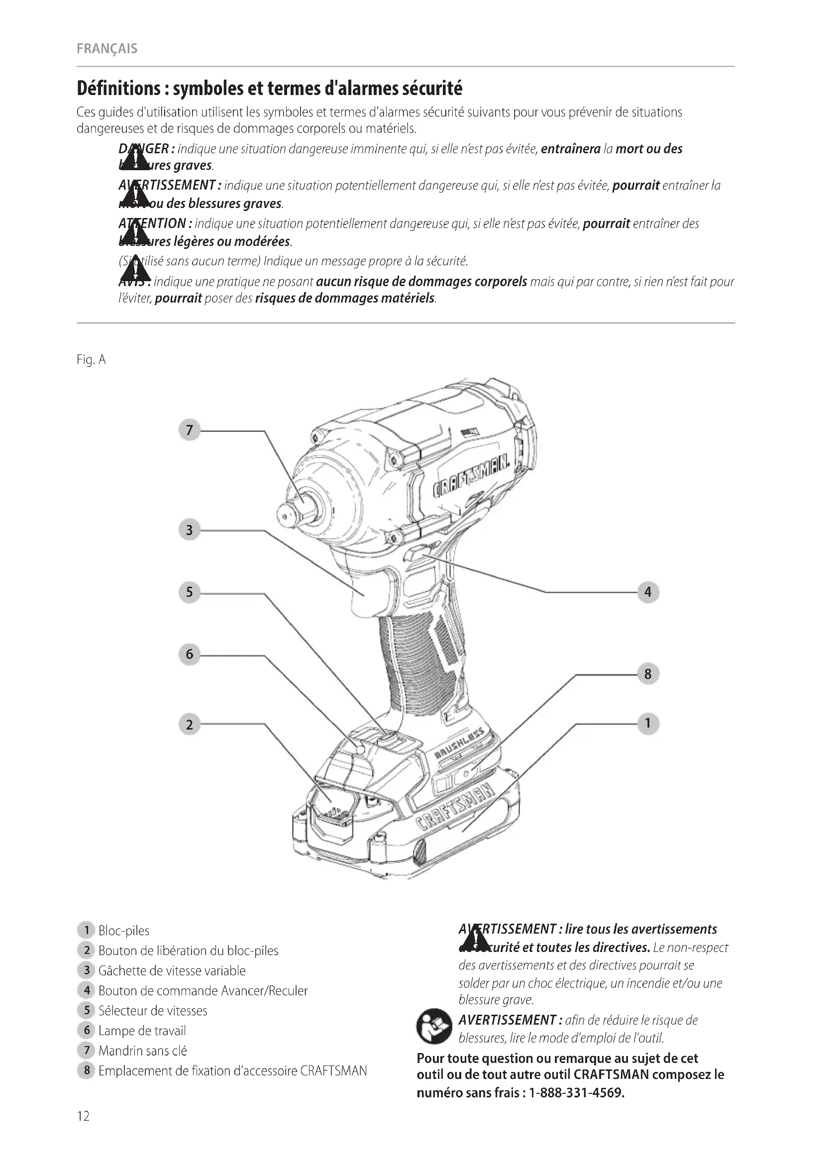 blessures, lire le mode d’emploi del’outil. Pour toute question ou remarque au sujet de cet outil ou de tout autre outil CRAFTSMAN composez le numéro sans frais : 1-888-331-4569.