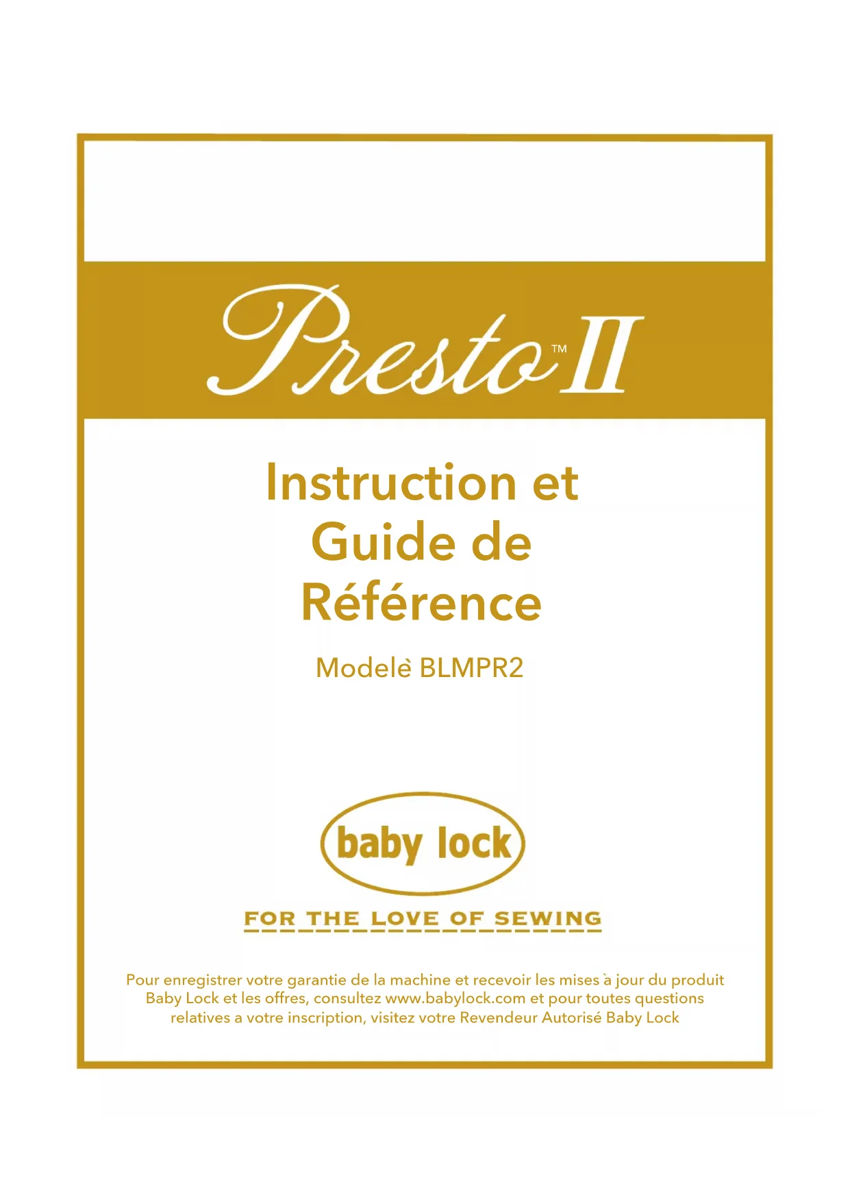 Modele BLMPR2 Pour enregistrer votre garantie de la machine et recevoir les mises a jour du produit Baby Lock et les offres, consultez www.babylock.com et pour toutes questions relatives a votre inscription, visitez votre Revendeur Autorisé Baby Lock Instruction et Guide de Référence TMNouvelles fonctionnalités de Presto à Presto II
