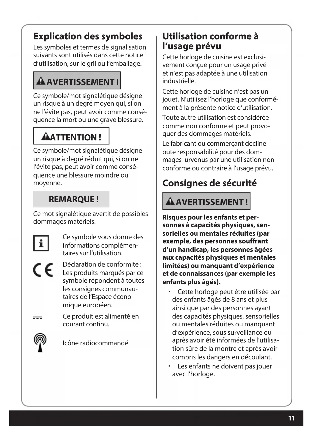 Explication des symboles Les symboles et termes de signalisation suivants sont utilisés dans cette notice d’utilisation, sur le gril ou l’emballage. AVERTISSEMENT ! Ce symbole/mot signalétique désigne un risque à un degré moyen qui, si on ne l’évite pas, peut avoir comme consé- quence la mort ou une grave blessure. ATTENTION ! Ce symbole/mot signalétique désigne un risque à degré réduit qui, si on ne l’évite pas, peut avoir comme consé- quence une blessure moindre ou moyenne. REMARQUE ! Ce mot signalétique avertit de possibles dommages matériels. Ce symbole vous donne des informations complémen- taires sur l’utilisation. Déclaration de conformité : Les produits marqués par ce symbole répondent à toutes les consignes communau- taires de l’Espace écono- mique européen. Ce produit est alimenté en courant continu. Icône radiocommandé Utilisation conforme à l‘usage prévu Cette horloge de cuisine est exclusi- vement conçue pour un usage privé et n’est pas adaptée à une utilisation industrielle. Cette horloge de cuisine n‘est pas un jouet. N’utilisez l’horloge que conformé- ment à la présente notice d’utilisation. Toute autre utilisation est considérée comme non conforme et peut provo- quer des dommages matériels. Le fabricant ou commerçant décline oute responsabilité pour des dom- mages urvenus par une utilisation non conforme ou contraire à l’usage prévu. Consignes de sécurité AVERTISSEMENT ! Risques pour les enfants et per- sonnes à capacités physiques, sen- sorielles ou mentales réduites (par exemple, des personnes souffrant d’un handicap, les personnes âgées aux capacités physiques et mentales limitées) ou manquant d’expérience et de connaissances (par exemple les enfants plus âgés). Cette horloge peut être utilisée par des enfants âgés de 8 ans et plus ainsi que par des personnes ayant des capacités physiques, sensorielles ou mentales réduites ou manquant d’expérience, sous surveillance ou après avoir été informées de l’utilisa- tion sûre de la montre et après avoir compris les dangers en découlant. Les enfants ne doivent pas jouer avec l’horloge. Druckbuch BEL.indb 11 22.11.2019 08:52:4312 Les enfants ne sont pas autorisés à nettoyer et à entretenir l‘appareil sans être surveillés par une per- sonne responsable. Ne laissez pas les enfants jouer avec les emballages, éliminez-les immé- diatement. ATTENTION ! Risque d’explosion et de brûlures ! Une utilisation inappropriée de la pile peut provoquer des blessures. Ne remplacez la pile que par le même type ou un type de piles équi- valent (voir les « Caractéristiques techniques »). Ne rechargez pas les piles et ne les réactivez pas par d’autres moyens. Lorsque vous insérez les piles, veillez à respecter la polarité (+/-). Nettoyez, si nécessaire, les contacts des piles et de l‘appareil avant d‘in- sérer les piles. Ne démontez pas les piles et conser- vez-les dans un endroit frais et sec. Ne court-circuitez pas les piles. N’exposez pas les piles à une chaleur excessive (par ex. à la lumière directe du soleil) et ne les jetez pas dans le feu. Ne conservez pas les piles dans un environnement à très faible pres- sion atmosphérique. Si le compartiment à piles ne se ferme plus correctement, n’utilisez plus l’horloge. Évitez de mettre le liquide des piles en contact avec la peau, les yeux et les muqueuses. En cas de contact, rincez les endroits concernés immé- diatement à l’eau claire et consultez un médecin. Les piles peuvent être dangereuses. C’est pourquoi les piles doivent être conservées hors de la vue et de la portée des enfants en bas âge. Si une pile est avalée ou si elle arrive dans le corps d’une façon ou d’une autre, demandez immédiatement l’assistance d’un médecin. Retirez les piles vides de leur com- partiment. Le liquide contenu dans les piles risque de s’écouler. Il est également recommandé de retirer les piles dans les cas suivants : - Si vous n’utilisez pas le produit pendant un certain temps, - avant d’éliminer le produit. REMARQUE ! Risque d‘endommagement ! Une utilisation incorrecte de l’horloge peut entraîner des dommages. Protégez l’horloge de la chaleur extrême, des rayons du soleil, de la poussière ainsi que des champs magnétiques, des produits chimiques et de l’abrasion méca- nique. N’approchez pas l’horloge d’une amme, notamment de bougies. Ne faites pas tomber l’horloge et ne la soumettez à aucun impact important. Ne plongez pas l’horloge dans l’eau ni dans aucun autre liquide et proté- gez-la de l’humidité. Contenu de la livraison Horloge de cuisine 1 pile LR6/R6 (AA) Document de garantie Druckbuch BEL.indb 12 22.11.2019 08:52:43Vue détaillée