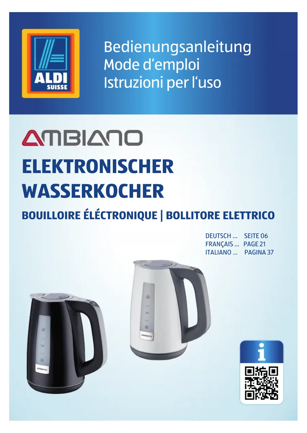Aller rapidement et facilement au but avec les codes QR Si vous avez besoin d’informations sur les produits, de pièces de rechange ou d’accessoires, de données sur les garanties fabricant ou sur les unités de service ou si vous souhaitez regarder confortablement des instructions en vidéo – avec nos codes QR, vous parvenez au but en toute facilité. Les codes QR, qu’est-ce? Les codes QR (QR = Quick Response) sont des codes graphiques qui peuvent être lus à l’aide d’un appareil photo du smartphone et qui contiennent par exemple un lien vers un site Internet ou des données de contact. Votre avantage: plus de frappe contraignante d’adresses Internet ou de données de contact! Comment faire? Pour scanner les codes QR, vous avez simplement besoin d’un smartphone, d’un lecteur de codes QR installé ainsi que d’une connexion Internet. Vous trouverez généralement un lecteur de codes QR gratuitement dans l’App Store de votre smartphone. Testez dès maintenant Scannez simplement le code QR suivant avec votre smartphone pour en savoir plus sur votre nouveau produit ALDI. Votre portail de services ALDI Toutes les informations mentionnées plus haut sont également disponibles sur Internet via le portail de services ALDI sous www.aldi-service.ch. 03_Digitaler Wasserkocher CH FR INNEN.indd 23 09.11.2017 10:41:00Généralités