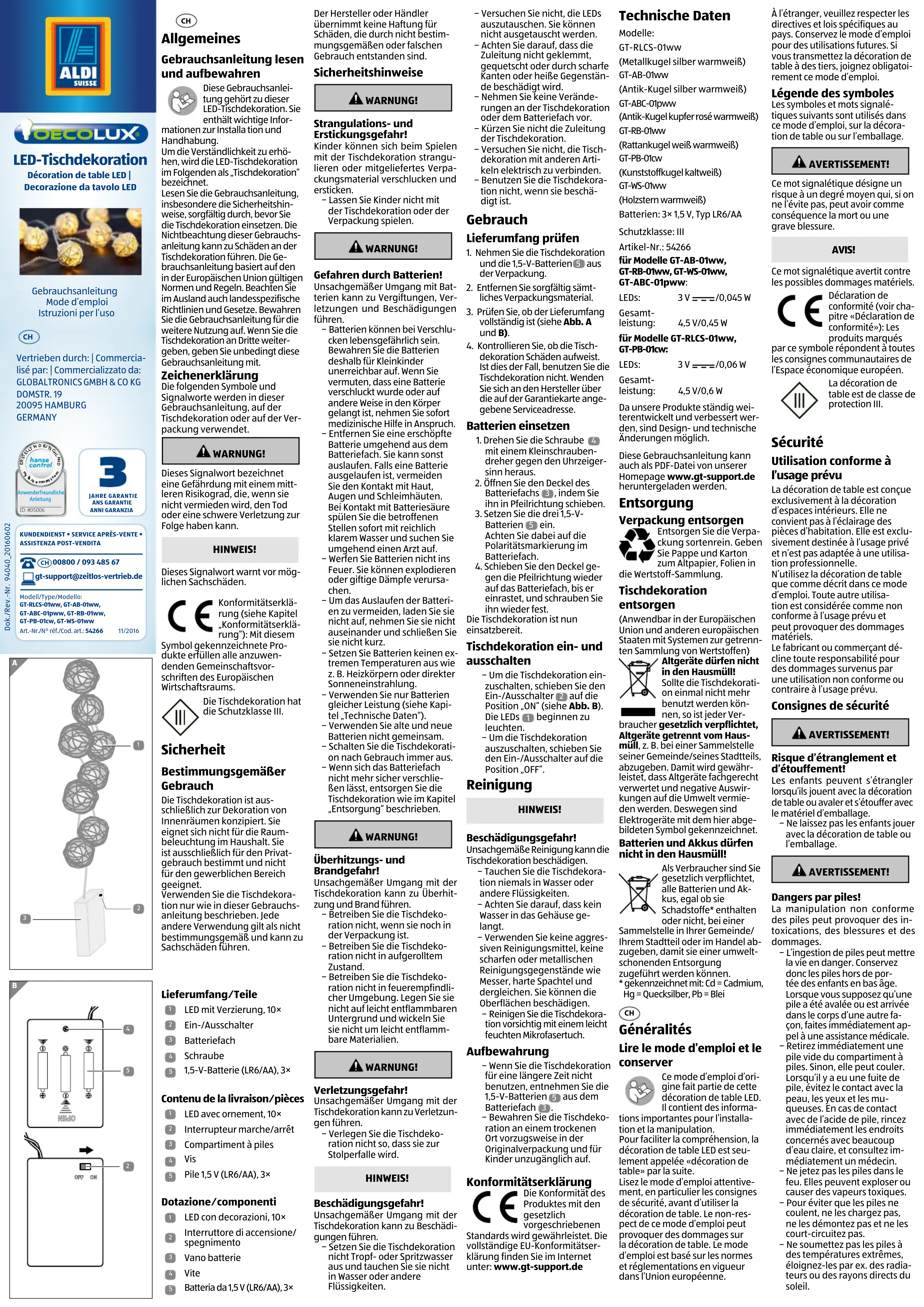− Rangez la décoration de table dans un endroit sec, de préférence dans l’emballage d’origine et hors de portée des enfants. Déclaration de conformité La conformité du produit aux stan- dards prescrits par la loi est garantie. La déclaration de conformité UE complète peut être consultée sur Internet à l’adresse: www.gt-support.de Données techniques Modèles: GT-RLCS-01ww (sphère métallique argent blanc chaud) GT-AB-01ww (sphère antique argent blanc chaud) GT-ABC-01pww (sphère antique cuivre rose blanc chaud) GT-RB-01ww (sphère rotin blanc blanc chaud) GT-PB-01cw (sphère plastique blanc froid) GT-WS-01ww (étoile bois blanc chaud) Piles: 3× 1,5 V, type LR6/AA Classe de protection: III