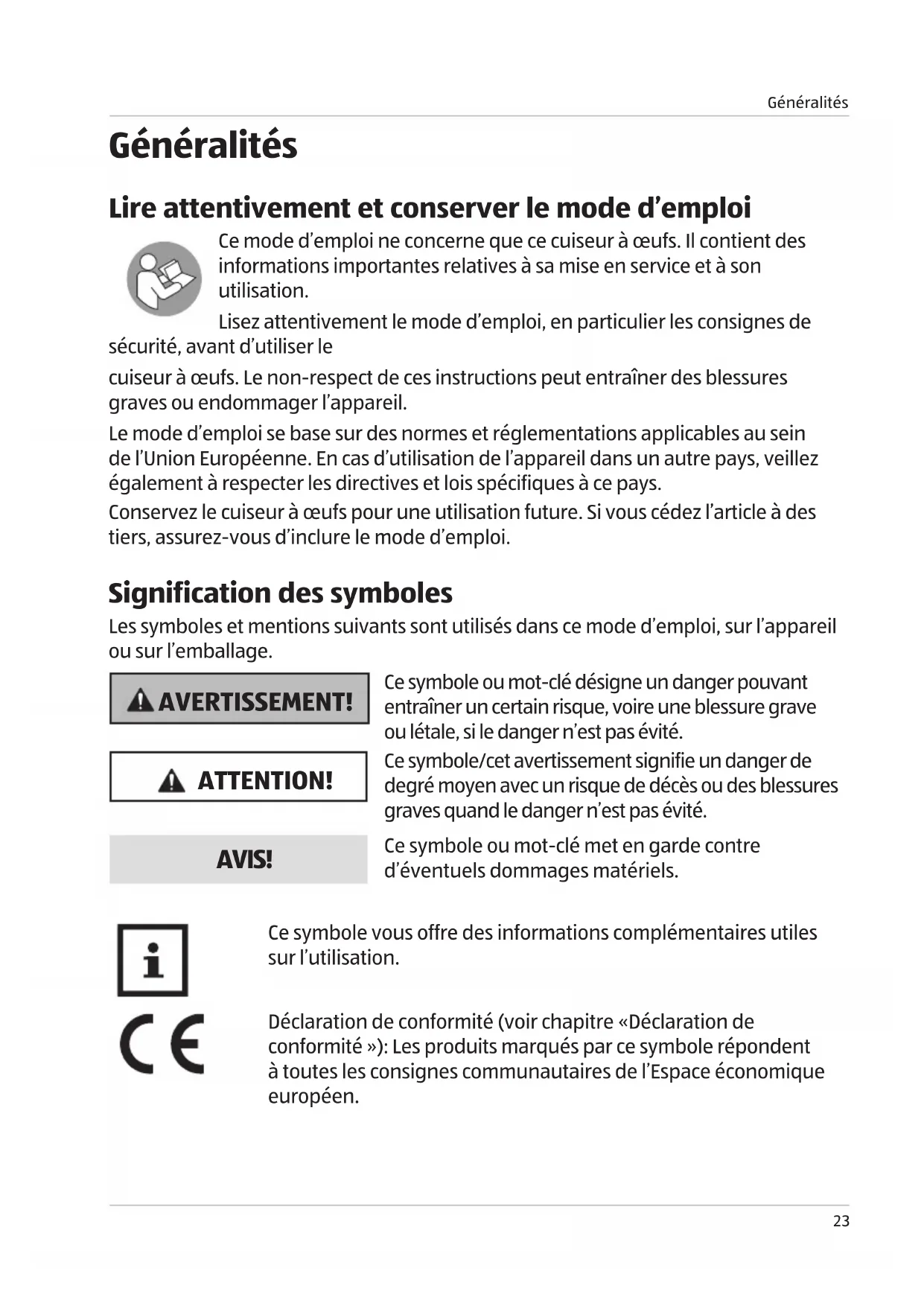 Généralités Lire attentivement et conserver le mode d’emploi Ce mode d’emploi ne concerne que ce cuiseur à œufs. Il contient des informations importantes relatives à sa mise en service et à son utilisation. Lisez attentivement le mode d’emploi, en particulier les consignes de sécurité, avant d’utiliser le cuiseur à œufs. Le non-respect de ces instructions peut entraîner des blessures graves ou endommager l’appareil. Le mode d’emploi se base sur des normes et réglementations applicables au sein de l’Union Européenne. En cas d’utilisation de l’appareil dans un autre pays, veillez également à respecter les directives et lois spécifiques à ce pays. Conservez le cuiseur à œufs pour une utilisation future. Si vous cédez l’article à des tiers, assurez-vous d’inclure le mode d’emploi. Signification des symboles Les symboles et mentions suivants sont utilisés dans ce mode d’emploi, sur l’appareil ou sur l’emballage. AVERTISSEMENT! Ce symbole ou mot-clé désigne un danger pouvant entraîner un certain risque, voire une blessure grave ou létale, si le danger n’est pas évité. ATTENTION! Ce symbole/cet avertissement signifie un danger de degré moyen avec un risque de décès ou des blessures graves quand le danger n’est pas évité. AVIS! Ce symbole ou mot-clé met en garde contre d’éventuels dommages matériels. Ce symbole vous offre des informations complémentaires utiles sur l’utilisation. Déclaration de conformité (voir chapitre «Déclaration de conformité »): Les produits marqués par ce symbole répondent à toutes les consignes communautaires de l’Espace économique européen. Buch_CH_Eierkocher.indb 23Buch_CH_Eierkocher.indb 23 20.09.2022 11:49:3120.09.2022 11:49:31Sécurité