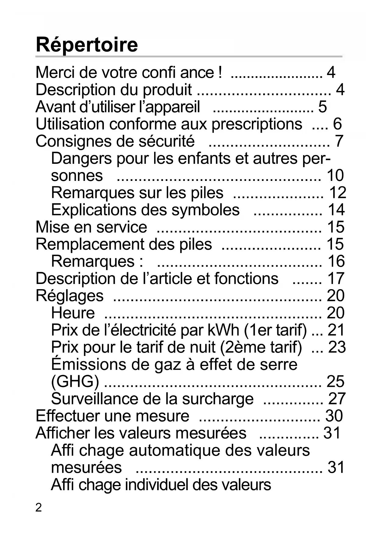 - Bon de garantie Carte de garantie4 Merci de votre confi ance ! Nous vous félicitons pour l’achat de votre nouvel appareil de mesure des frais d’électricité et nous sommes convaincus que cet appareil moderne vous donnera entière satisfaction. Cet appareil vous aide à déterminer les frais d’électricité des appareils branchés. Nous espérons que vous trouverez tous les « dévoreurs de courant » et que, de ce fait, vous pourrez diminuer votre fac- ture d’électricité ! Description du produit Cet appareil de mesure de l’électri- cité vous fournit des indications sur la consommation de courant des appareils branchés. En appuyant sur un bouton, vous pouvez rapidement affi cher les valeurs actuelles. D’autres valeurs mesurées sont affi chées, comme la tension, la puissance du cou- rant, la puissance absorbée, la fréquence5 du réseau et les valeurs de surcharge. Vous pouvez également rentrer votre tarif d’électricité et affi cher ensuite les frais effectifs. L’affi chage de l’équivalent en émission de CO2 en kg est une information écolo- gique supplémentaire. De plus, l’appareil de mesure vous montre la consommation totale durant une période de mesure, jusqu’à sept mois ainsi que la durée de fonctionnement correspondante. Avant d’utiliser l’appareil Après le déballage et avant chaque utilisation, veuillez vérifi er si l’article ne présente pas de dommage. Si c’était le cas, n’utilisez pas l’appareil, mais veuillez en informer votre revendeur. Le mode d’emploi se base sur les normes et règles en vigueur dans l’Union européenne. À l’étranger, veuillez respecter les directives et lois spécifi ques au pays ! Avant d’utiliser votre appareil, veuillez lire d’abord les consignes de sécurité et le6 mode d’emploi avec attention. Ce n’est que de cette manière que vous pourrez uti- liser en toute sécurité et fi abilité l’appareil. Conservez le mode d’emploi ainsi que le ticket de caisse et si possible aussi l’emballage. Si vous prêtez, offrez ou vendez l’appa- reil, veuillez remettre aussi le mode emploi. Utilisation conforme aux prescriptions L’appareil sert à déterminer la consom- mation d’électricité de consommateurs branchés ainsi que les frais en résultant. L’article est uniquement destiné à un usage privé mais pas à un usage com- mercial. Utilisez l’article uniquement comme la description du mode d’emploi. Toute autre utilisation est considérée comme non conforme aux prescriptions et peut provoquer des dommages matériels voire corporels. Le fabricant n’est en rien responsable des7 dommages causés par une utilisation non conforme aux prescriptions. Consignes de sécurité Avant de mettre en ser- vice votre appareil de mesure des frais d’électri- cité, veuillez tenir compte des points suivants : p. 46