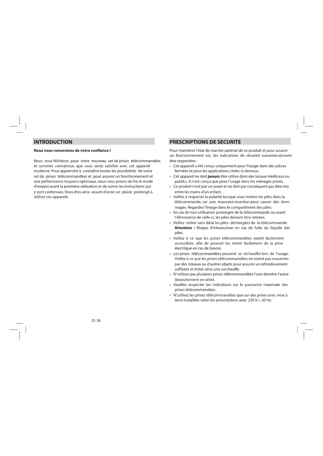 Nous vous remercions de votre confiance ! Nous vous félicitons pour votre nouveau set de prises télécommandées et sommes convaincus que vous serez satisfait avec cet appareil moderne. Pour apprendre à connaître toutes les possibilités de votre set de prises télécommandées et pour assurer un fonctionnement et une performance toujours optimaux, nous vous prions de lire le mode d'emploi avant la première utilisation et de suivre les instructions qui y sont contenues. Vous êtes ainsi assuré d'avoir un plaisir prolongé à utiliser ces appareils INTRODUCTION27 28 Contenu de la livraison