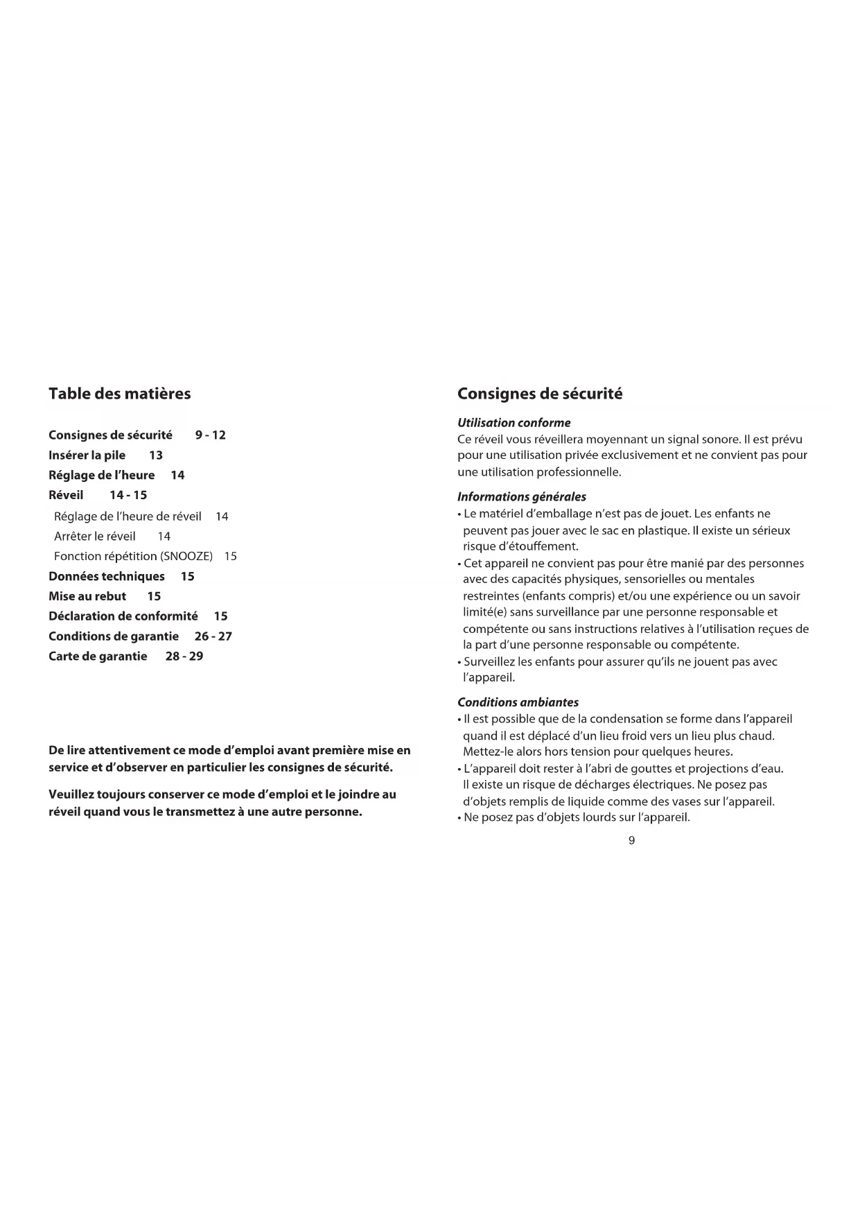 - Poussez l’interrupteur „OFF/ON ALARM“ sur „OFF“ pour le mettre hors tension. Fonction répétition (SNOOZE) Appuyez sur la touche „SNOOZE“ quand le réveil sonne pour l’éteindre là l’aide de la fonction répétition. Le signal sonore sera interrompu pendant environ neuf minutes avant de sonner à nouveau. Données techniques Modèle: WM-120 Tension: 230V ~ 50Hz Pile: Pile bloc 9 V (seulement pour back-up) Mise au rebut Veuillez conserver l’emballage jusqu’au terme de la période de garantie et l’éliminer de manière conforme par la suite. L’appareil doit être mis au rebut selon la régulation en vigueur. Les éléments en plastique et électroniques doivent être apportés aux points de recyclage. Elimination des piles Les piles et accus ne doivent pas être jetés avec les déchets ménagers! Chaque utilisateur a l’obligation légale de déposer les piles et accus auprès des points de ramassage de son domicile. Tous les piles et accus peuvent ainsi être recyclés de manière écologique. Les piles et accus contenant des substances nocives sont caractérisés par ce signe accompagné de symboées chimiques (Cd pour Cadmium, Hg pour le mercure, Pb pour plomb). Déclaration de conformité La conformité de cet appareil avec les normes prévues par la loi est garantie. Vous trouverez la déclaration de conformité complète sur Internet sous www.gt-support.de. 1514Inhalt Sicherheitshinweise 17 - 20 Batterie einlegen 21 Uhrzeit einstellen 22 Wecker 22 - 23 Weckzeit einstellen 22 Wecker ausschalten 22 Schlummerfunktion (SNOOZE) 23 Technische Daten 23 Entsorgen 23 Konformitätserklärung 23 Lesen Sie vor der ersten Inbetriebnahme diese Bedienungsan- leitung gründlich durch und befolgen Sie vor allen Dingen die Sicherheitshinweise. Bewahren Sie diese Anleitung auf. Falls Sie den Wecker einmal weitergeben, legen Sie bitte diese Bedienungsanleitung dazu. Sicherheitshinweise Bestimmungsgemäße Verwendung Das Gerät ist zum Wecken durch Alarmton vorgesehen. Das Gerät ist für den privaten Gebrauch konzipiert und nicht für die gewerbliche Nutzung geeignet. Allgemeine Hinweise