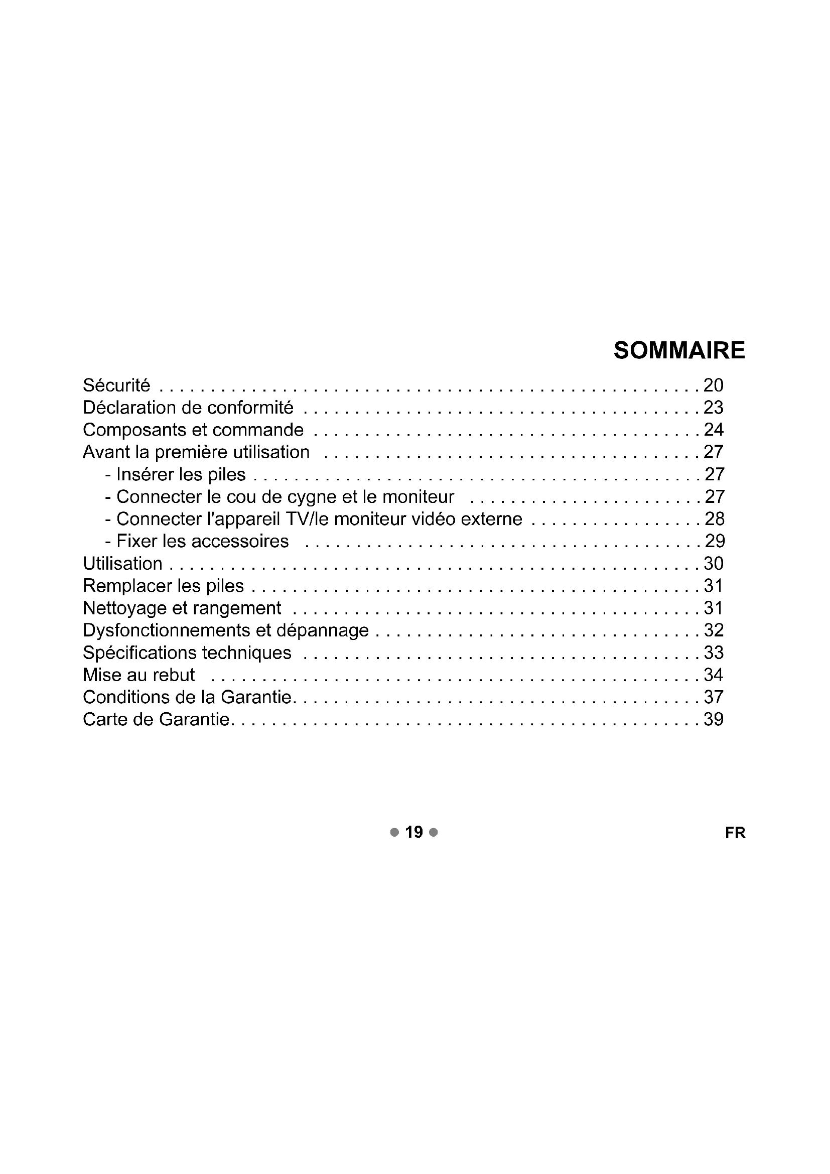 Utilisation 30 Remplacer les piles 31 Nettoyage et rangement 31 Dysfonctionnements et dépannage 32 Spécifications techniques 33 Mise au rebut 34 Conditions de la Garantie 37 Carte de Garantie 39