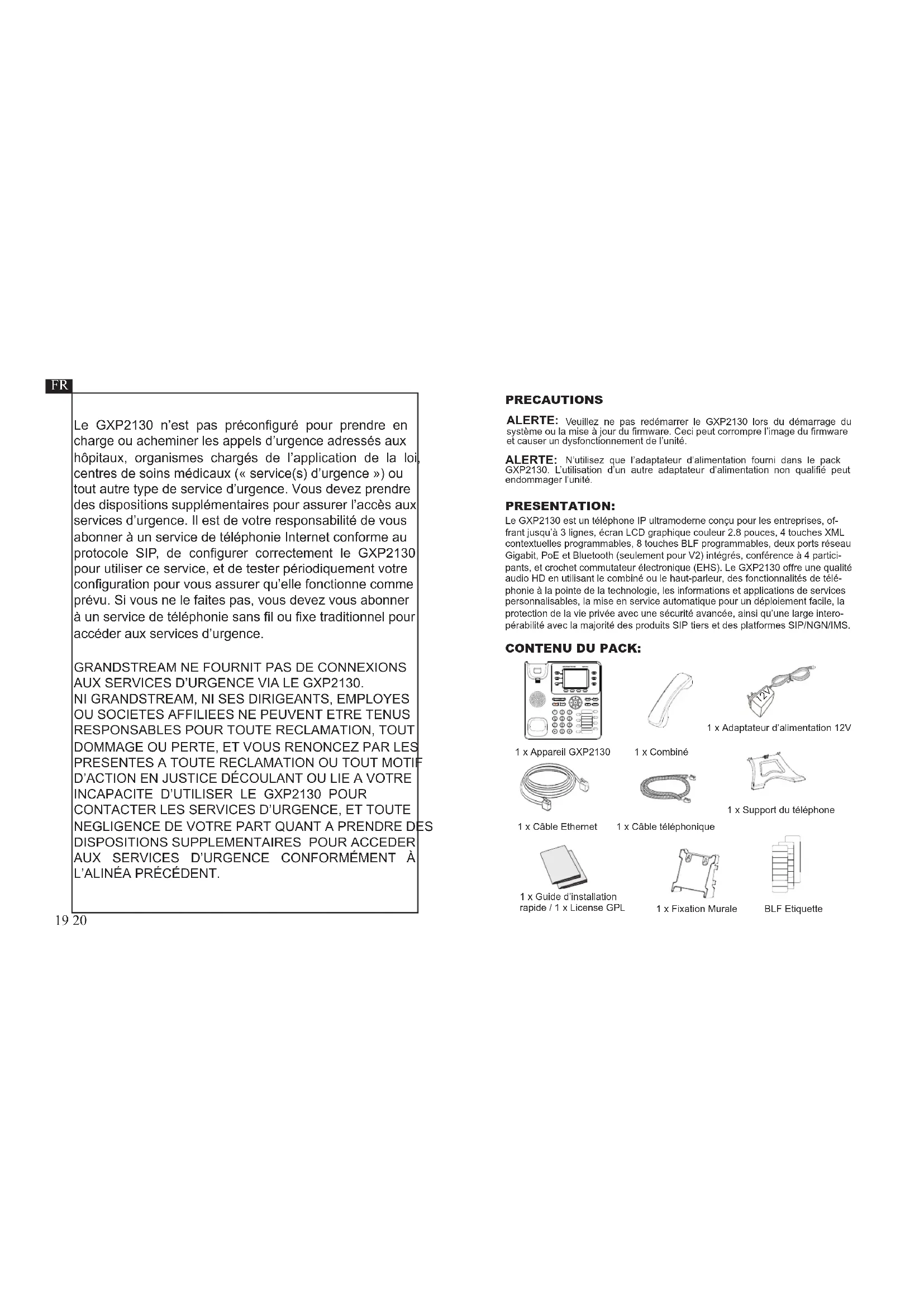1 x Combiné Le GXP2130 n’est pas préconfiguré pour prendre en charge ou acheminer les appels d’urgence adressés aux hôpitaux, organismes chargés de l’application de la loi, centres de soins médicaux (« service(s) d’urgence ») ou tout autre type de service d’urgence. Vous devez prendre des dispositions supplémentaires pour assurer l’accès aux services d’urgence. Il est de votre responsabilité de vous abonner à un service de téléphonie Internet conforme au protocole SIP, de configurer correctement le GXP2130 pour utiliser ce service, et de tester périodiquement votre configuration pour vous assurer qu’elle fonctionne comme prévu. Si vous ne le faites pas, vous devez vous abonner à un service de téléphonie sans fil ou fixe traditionnel pour accéder aux services d’urgence.