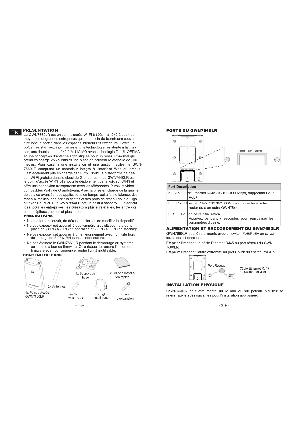 - Ne pas éteindre le GWN7660LR pendant le démarrage du système ou la mise à jour du rmware. Cela risque de rompre l’image du rmware et en conséquence rendre l’unité inutilisable. Port Description NET/POE Port Ethernet RJ45 (10/100/1000Mbps) supportant PoE/ PoE+. NET Port Ethernet RJ45 (10/100/1000Mbps) connecter à votre router ou à un autre GWN76xx. RESET Bouton de réinitialisation. Appuyez pendant 7 secondes pour réinitialiser les paramètres d'usine. GWN7660LR peut être alimenté avec un switch PoE/PoE+ en suivant les étapes ci-dessous. Etape 1: Brancher un câble Ethernet RJ45 au port réseau du GWN- 7660LR. Etape 2: Brancher l’autre extrémité au port Uplink du Switch PoE/PoE+. Le GWN7660LR est un point d’accès Wi-Fi 6 802.11ax 2×2:2 pour les moyennes et grandes entreprises qui ont besoin de fournir une couver- ture longue portée dans les espaces intérieurs et extérieurs. Il ore un boîtier résistant aux intempéries et une technologie résistante à la chal- eur, une double bande 2×2:2 MU-MIMO avec technologie DL/UL OFDMA et une conception d’antenne sophistiquée pour un réseau maximal qui prend en charge 256 clients et une plage de couverture étendue de 250 mètres. Pour garantir une installation et une gestion faciles, le GWN- 7660LR comprend un contrôleur intégré à l’interface Web du produit. Il est également pris en charge par GWN.Cloud, la plate-forme de ges- tion Wi-Fi gratuite dans le cloud de Grandstream. Le GWN7660LR est le point d’accès Wi-Fi idéal pour le déploiement de la voix sur Wi-Fi et ore une connexion transparente avec les téléphones IP voix et vidéo compatibles Wi-Fi de Grandstream. Avec la prise en charge de la qualité de service avancée, des applications en temps réel à faible latence, des réseaux maillés, des portails captifs et des ports de réseau double Giga- bit avec PoE/PoE+, le GWN7660LR est un point d’accès Wi-Fi extérieur idéal pour les entreprises, les bureaux à plusieurs étages, les entrepôts et les hôpitaux , écoles et plus encore.~21~ ~22~