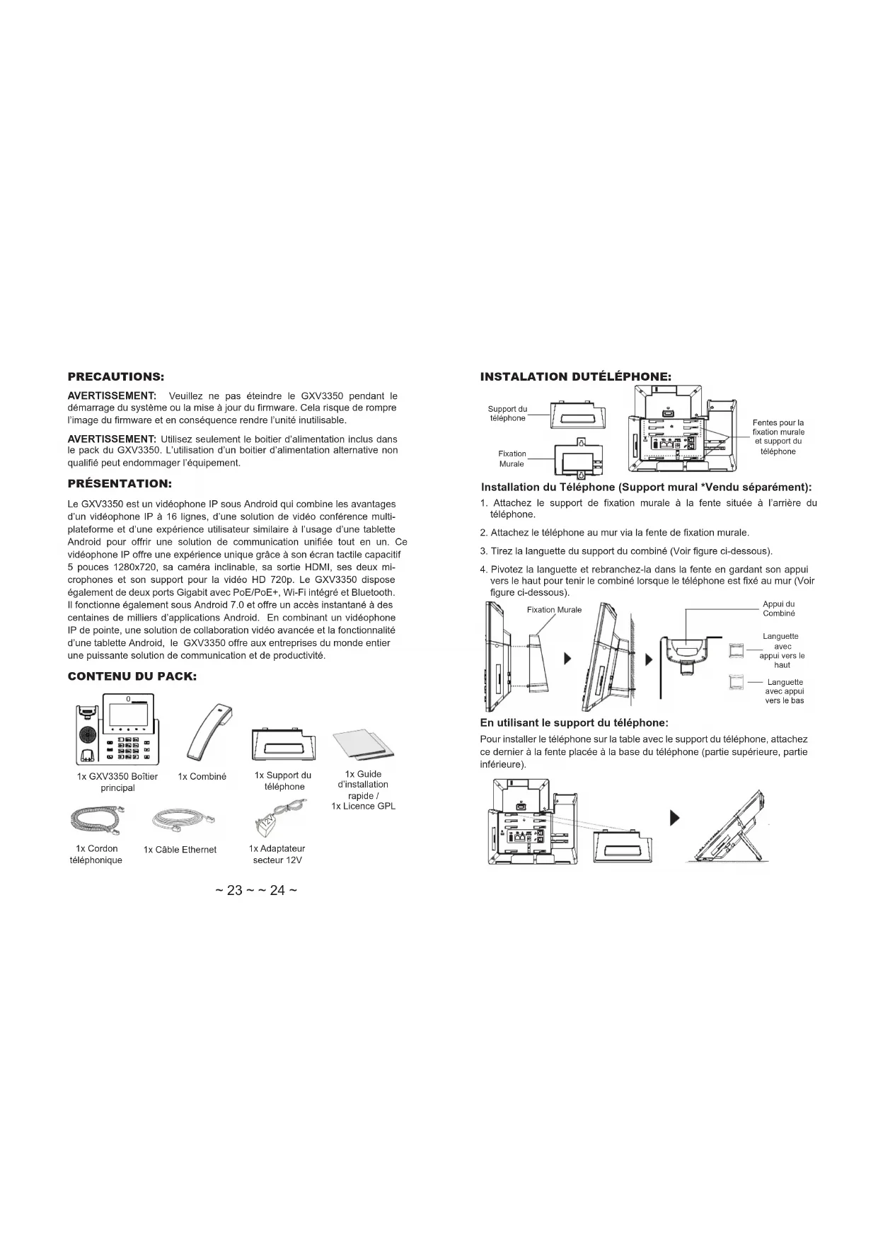 le pack du GXV3350. L’utilisation d’un boitier d’alimentation alternative non qualifié peut endommager l’équipement.1x GXV3350 Boîtier principal1x Combiné1x Cordon téléphonique1x Câble Ethernet1x Adaptateur secteur 12V1x Guide d’installation rapide /1x Licence GPL 12V PRÉSENTATION: Le GXV3350 est un vidéophone IP sous Android qui combine les avantages d’un vidéophone IP à 16 lignes, d’une solution de vidéo conférence multi-plateforme et d’une expérience utilisateur similaire à l’usage d’une tablette Android pour offrir une solution de communication unifiée tout en un. Ce vidéophone IP offre une expérience unique grâce à son écran tactile capacitif 5 pouces 1280x720, sa caméra inclinable, sa sortie HDMI, ses deux mi-crophones et son support pour la vidéo HD 720p. Le GXV3350 dispose également de deux ports Gigabit avec PoE/PoE+, Wi-Fi intégré et Bluetooth. Il fonctionne également sous Android 7.0 et offre un accès instantané à des centaines de milliers d’applications Android. En combinant un vidéophone IP de pointe, une solution de collaboration vidéo avancée et la fonctionnalité d’une tablette Android, le GXV3350 offre aux entreprises du monde entier une puissante solution de communication et de productivité.1x Support du téléphone INSTALATION DUTÉLÉPHONE: 1. Attachez le support de fixation murale à la fente située à l’arrière du téléphone.2. Attachez le téléphone au mur via la fente de fixation murale.3. Tirez la languette du support du combiné (Voir figure ci-dessous).4. Pivotez la languette et rebranchez-la dans la fente en gardant son appui vers le haut pour tenir le combiné lorsque le téléphone est fixé au mur (Voir figure ci-dessous). Installation du Téléphone (Support mural *Vendu séparément): Fentes pour la fixation murale et support du téléphonePour installer le téléphone sur la table avec le support du téléphone, attachez ce dernier à la fente placée à la base du téléphone (partie supérieure, partie inférieure). En utilisant le support du téléphone: Support du téléphoneFixation MuraleFixation MuraleAppui du CombinéLanguette avec appui vers le haut Languette avec appui vers le bas~ 25 ~ ~ 26 ~ CONNECTER LE TÉLÉPHONE: