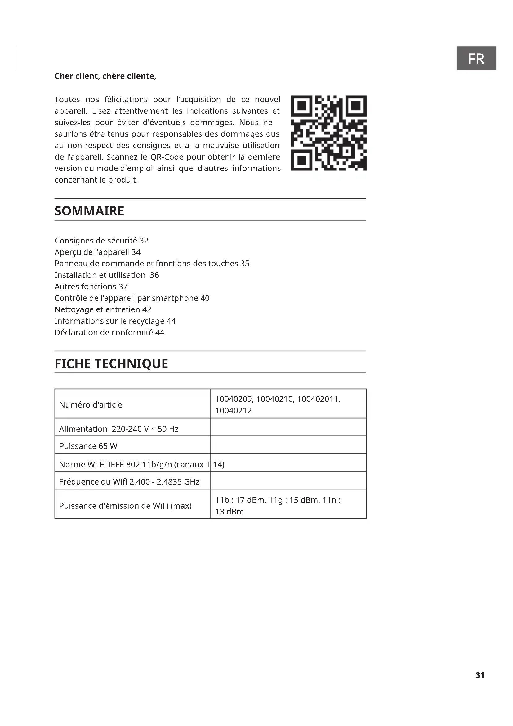 Cher client, chère cliente, Toutes nos félicitations pour l’acquisition de ce nouvel appareil. Lisez attentivement les indications suivantes et suivez-les pour éviter d'éventuels dommages. Nous ne saurions être tenus pour responsables des dommages dus au non-respect des consignes et à la mauvaise utilisation de l’appareil. Scannez le QR-Code pour obtenir la dernière version du mode d'emploi ainsi que d'autres informations concernant le produit. SOMMAIRE Consignes de sécurité 32 Aperçu de l’appareil 34 Panneau de commande et fonctions des touches 35 Installation et utilisation 36 Autres fonctions 37 Contrôle de l’appareil par smartphone 40 Nettoyage et entretien 42 Informations sur le recyclage 44 Déclaration de conformité 44 FICHE TECHNIQUE Numéro d'article 10040209, 10040210, 100402011,