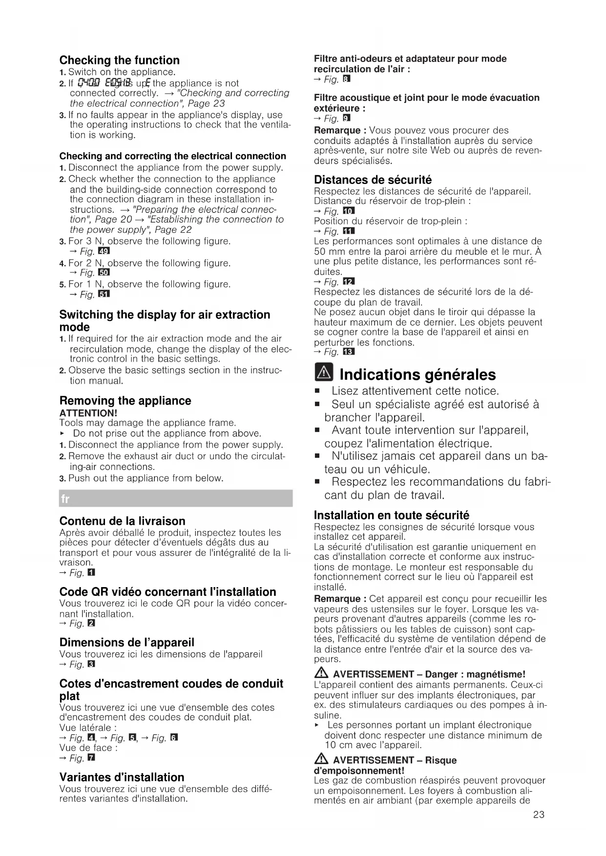 Indications générales ¡ Lisez attentivement cette notice. ¡ Seul un spécialiste agréé est autorisé à brancher l'appareil. ¡ Avant toute intervention sur l'appareil, coupez l'alimentation électrique. ¡ N'utilisez jamais cet appareil dans un ba- teau ou un véhicule. ¡ Respectez les recommandations du fabri- cant du plan de travail. Installation en toute sécurité Respectez les consignes de sécurité lorsque vous installez cet appareil. La sécurité d'utilisation est garantie uniquement en cas d'installation correcte et conforme aux instruc- tions de montage. Le monteur est responsable du fonctionnement correct sur le lieu où l'appareil est installé. Remarque:Cet appareil est conçu pour recueillir les vapeurs des ustensiles sur le foyer. Lorsque les va- peurs provenant d'autres appareils (comme les ro- bots pâtissiers ou les tables de cuisson) sont cap- tées, l'efficacité du système de ventilation dépend de la distance entre l'entrée d'air et la source des va- peurs. AVERTISSEMENT‒Danger: magnétisme! L'appareil contient des aimants permanents. Ceux-ci peuvent influer sur des implants électroniques, par ex. des stimulateurs cardiaques ou des pompes à in- suline. ▶ Les personnes portant un implant électronique doivent donc respecter une distance minimum de 10cm avec l’appareil. AVERTISSEMENT‒Risque d'empoisonnement! Les gaz de combustion réaspirés peuvent provoquer un empoisonnement. Les foyers à combustion ali- mentés en air ambiant (par exemple appareils de24 chauffage au gaz, au fioul, au bois ou au charbon, les chauffe-eaux intégrés sous cuve, les chauffe- eaux accumulateurs) prélèvent l'air de combustion dans la pièce où ils sont installés et rejettent les gaz de fumée à l'extérieur par le biais d'un système spé- cifique (par ex., cheminée). Lorsque la hotte aspi- rante est en marche, elle prélève de l'air dans la cui- sine et dans les pièces voisines. L'absence d'un ap- port d'air suffisant crée une pression négative. Les gaz toxiques provenant de la cheminée ou du conduit d'évacuation sont réaspirés dans les pièces d'habitation. ▶ En cas d'utilisation simultanée de l'appareil en mode évacuation extérieure et d'un foyer à com- bustion alimenté en air ambiant, veillez impérative- ment à ce que l'apport d'air soit toujours suffisant. ▶ Le fonctionnement sûr de l'appareil n'est possible que si la dépression dans la pièce où est installé le foyer ne dépasse pas 4Pa (0,04mbar). Cette valeur n'est réalisable que si l'apport d'air frais né- cessaire à la combustion est assuré par des ou- vertures non obturables, par exemple dans des portes ou fenêtres, associées à un caisson mural d'entrée et de sortie d'air, ou bien par d'autres moyens techniques. Un caisson mural d'entrée et de sortie d'air ne suffit pas à assurer la valeur mi- nimale nécessaire. ▶ Demandez toujours conseil à un maître ramoneur compétent qui pourra évaluer l'ensemble du ré- seau de ventilation de la maison et vous proposer le moyen le mieux adapté pour l'aération. ▶ Si l'appareil est utilisé exclusivement en mode re- circulation de l'air, le fonctionnement est possible sans restriction. AVERTISSEMENT‒Risque d'incendie! Les dépôts de graisse dans le filtre à graisse peuvent s'enflammer. ▶ Ne travaillez jamais avec une flamme nue à proxi- mité de l'appareil (par ex. ne faites rien flamber). ▶ Installez l’appareil à proximité d’un foyer à com- bustibles solides (par ex. bois ou charbon) uni- quement en présence d’un capot fermé et non amovible. Il ne doit pas y avoir de projection d’étincelles. AVERTISSEMENT‒Risque de blessure! Des modifications sur la construction électrique ou mécanique sont dangereuses et peuvent conduire à des dysfonctionnements. ▶ N'effectuez aucune modification sur la construc- tion électrique ou mécanique. Les pièces accessibles lors de l'installation peuvent présenter des arêtes vives et provoquer des cou- pures. ▶ Portez des gants de protection. L'appareil est lourd. ▶ 2personnes sont nécessaires pour déplacer l'ap- pareil. ▶ Utilisez exclusivement des moyens appropriés. AVERTISSEMENT‒Risque d'asphyxie! Les enfants risquent de s’envelopper dans les maté- riaux d’emballage ou de les mettre sur la tête et de s’étouffer. ▶ Conserver les matériaux d’emballage hors de por- tée des enfants. ▶ Ne jamais laisser les enfants jouer avec les em- ballages. AVERTISSEMENT‒Risque d'empoisonnement! Les gaz de combustion réaspirés peuvent provoquer un empoisonnement. ▶ Ne rejetez pas l'air sortant dans un conduit ou une cheminée en fonctionnement. ▶ Ne rejetez pas l’air sortant dans une gaine servant à aérer des locaux où sont installés des foyers à combustion. ▶ Si l’air sortant circule par un conduit ou une che- minée d'évacuation des gaz, vous devez d'abord obtenir l’accord d'un ramoneur compétent. Les gaz de combustion aspirés peuvent conduire à l'empoisonnement. ▶ Lorsqu'une hotte est installée avec un foyer exploi- tant l'air ambiant, l'alimentation électrique de la hotte doit être munie d'un interrupteur de sécurité approprié. Remarques concernant le branchement électrique Respectez ces consignes pour pouvoir effectuer le branchement électrique de l'appareil en toute sécuri- té. AVERTISSEMENT‒Risque d'électrocution! Il doit être à tout moment possible de débrancher l'appareil du réseau électrique. L'appareil doit impé- rativement être raccordé à une boîte de jonction ins- tallée de manière réglementaire. ▶ Dans l'installation électrique fixe, un dispositif de coupure omnipolaire doit être installé conformé- ment aux conditions de la catégorie de surtension III et aux réglementations d'installation. ▶ Seul un électricien qualifié est autorisé à procéder à l'installation électrique fixe. Nous vous recom- mandons d'installer un disjoncteur différentiel (in- terrupteur FI) dans