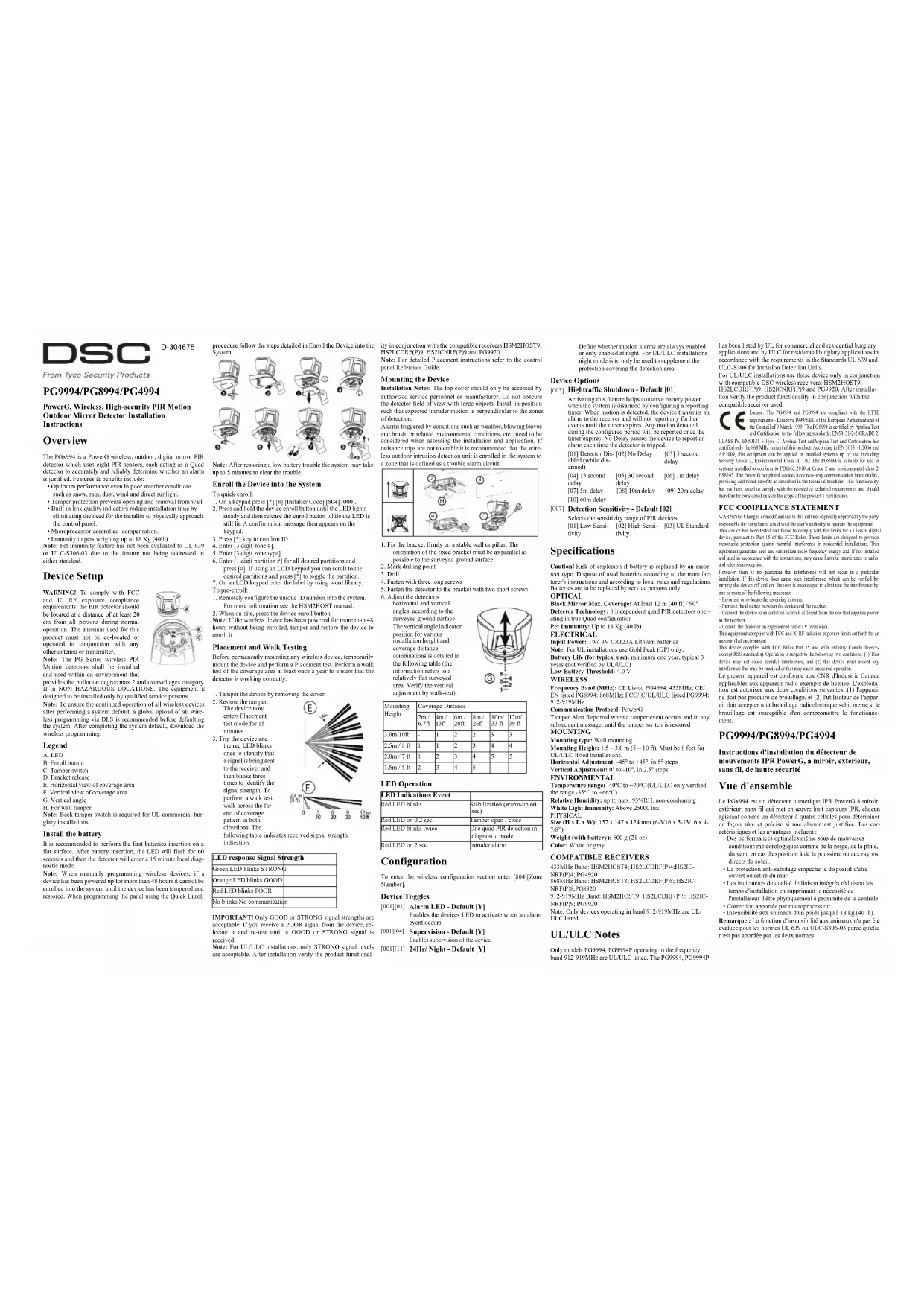 PG9994 - Détecteur de mouvements DSC - Notice d'utilisation et mode d'emploi gratuit
