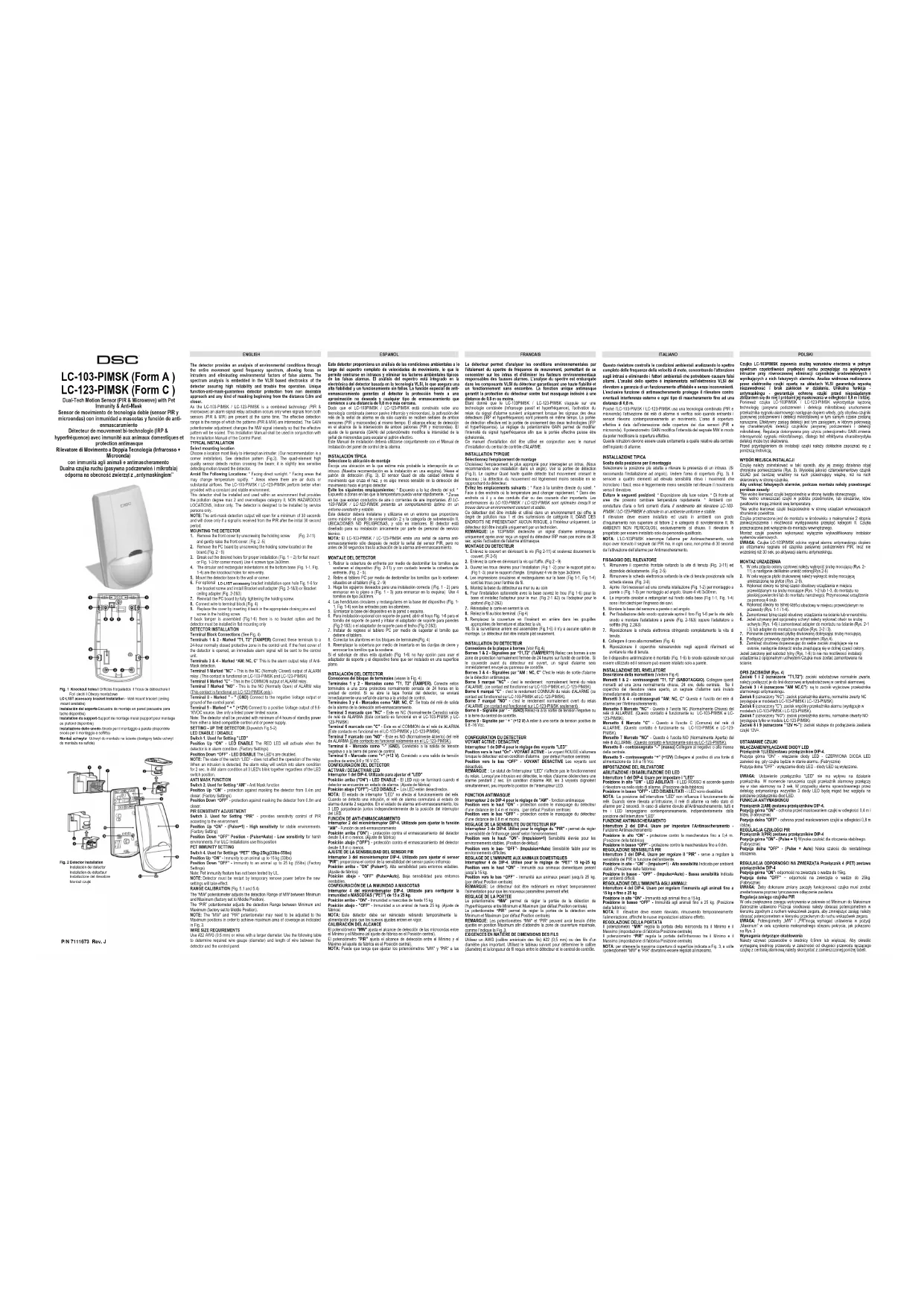 CARACTERISTIQUES TECHNIQUES Méthode de détection Impulsion hyperfréquence à effet Doppler et IRP Quad (quatre éléments Alimentation en entrée 9.6 à 16 Vcc Appel de courant Actif: 25 mA En En veille: 20 mA Compensation de temp. OUI Durée d'alarme 2 ± 1 sec Sortie d'alarme LC-103-PIMSK Format A NC LC-123-PIMSK Format C NC&NO 28Vdc 0.1 A avec 10 Ohm résistances de protection en série Sortie d'antimasque N.F 28 Vcc 0.1 A avec une résistance de protection en série de 10 Ohm - s'ouvre lorsque le couvercle est retiré Interrupteur anti- sabotage N.F 28 Vcc 0.1 A avec une résistance de protection en série de 10 Ohm - s'ouvre lorsque le couvercle est retiré Durée de préchauffage 1 min Voyant rouge Allumé pendant une alarme Voyant vert CANAL IRP Voyant jaune CANAL HYPERFREQUENCE Immunité contre les fréquences radio 10 V/m plus AM 80% de 80 MHz à 2GHz Immunité statique 8kV contact, 15kV air Immunité transitoire 2.4 kV @ 1.2 joules Temp. en fonctionnement -10ºC ~ +55ºC (14ºF ~ 131ºF) Dimensions 118mm x 62.5 mm x 41mm (4.65” x2.46” x1.61”) Poids 102gr. ( 3.6oz.) N'utilisez que des charges résistives sur les sorties de relais Cet appareil numיrique de la classe B est conforme a la norme NMB-003 du Canada.