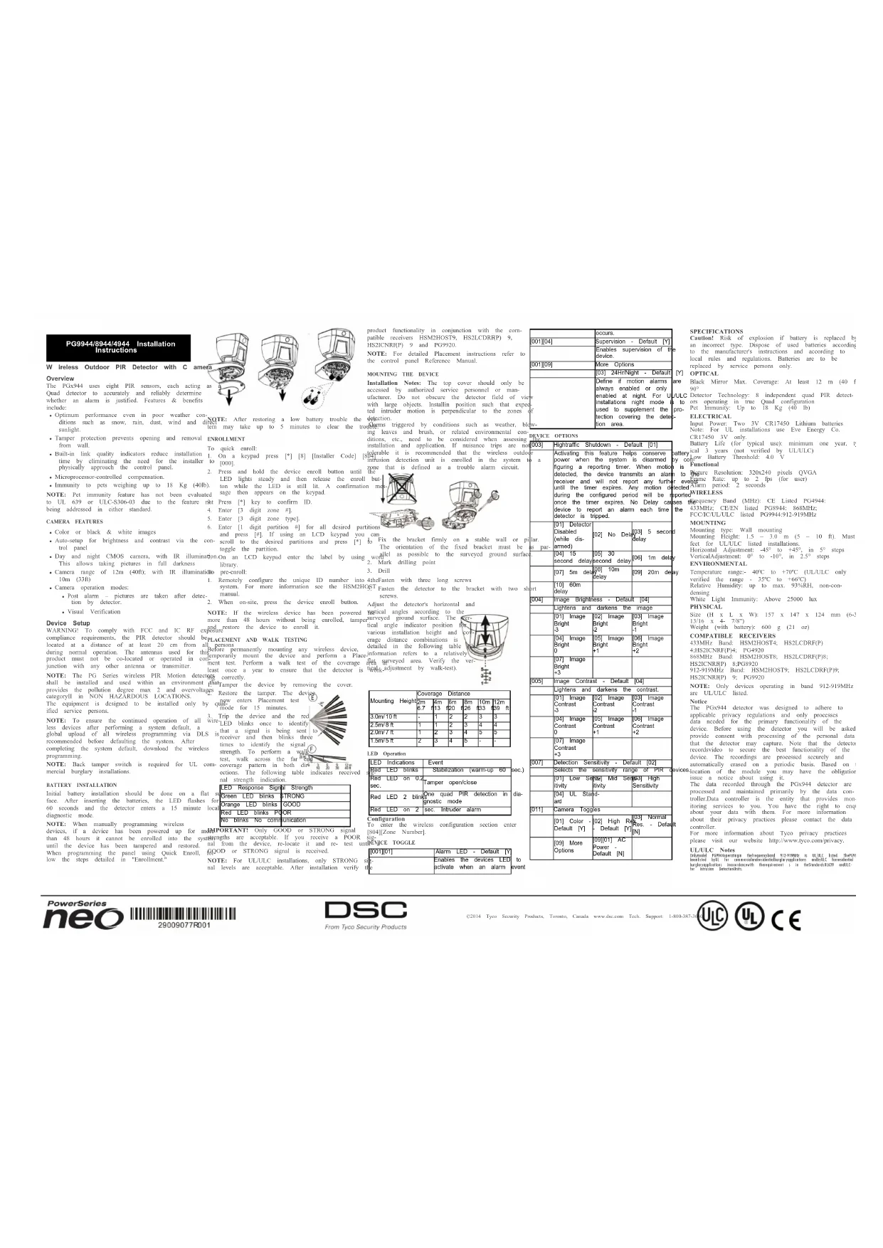 THE SOFTWARE WILLBE UNINTERRUPTED ORERROR- FREE. (b)CHANGES IN OPERATING ENVIRONMENT - DSC shallnot beresponsiblefor problems caused bychanges intheoperatingcharacteristics of the HARDWARE,orforproblems in theinter- actionof theSOFTWARE PRODUCT withnon- DSC-SOFTWARE orHARDWARE PRODUCTS. (c)LIMITATION OF LIABILITY; WARRANTYREFLECTS ALLOCATION OF RISK- IN ANYEVENT, IF ANYSTATUTE IMPLIES WARRANTIESORCONDITIONS NOTSTATED IN THIS LICENSE AGREEMENT,DSC’SENTIRE LIABILITYUNDER ANYPROVISION OFTHIS LICENSE AGREEMENT SHALLBE LIMITED TO THEGREATER OFTHEAMOUNT ACTUALLY PAID BYYOU TO LICENSETHE SOFTWAREPRODUCT AND FIVECANADIAN DOLLARS (CAD$5.00).BECAUSE SOME JURISDICTIONSDONOT ALLOWTHE EXCLUSION ORLIMITATION OFLIABI LITY FOR CONSEQUENTIALORINCIDENTAL DAMAGES,THE ABOVELIMITATION MAY NOTAPPLY TO YOU. (d)DISCLAIMEROF WARRANTIES- THISWARRANTY CONTAINS THEENTIRE WARRANTYAND SHALLBE IN LIEU OF ANYANDALL OTHERWARRANTIES, WHETHEREXPRESSED OR IMPLIED (INCLUDING ALLI MPLIED WARRANTIESOF MERCHANTABILITY ORFITNESS FORA PARTICULAR PURPOSE)AND OF ALL OTHEROBLIGATIONS OR LIABILITIESON THE PARTOF DSC. DSCMAKES NO OTHERWARRANTIES. DSCNEITHER ASSUMES NORAUTHORIZES ANY OTHERPERSON PURPORTING TOACTON I TSBEHALF TO MODIFY ORTOCHANGE THIS WARRANTY,NORTO ASSUMEFOR ITANYOTHERWARRANTYORLIABI LITY CONCERNI NG THIS SOFTWARE PRODUCT. (e)EXCLUSIVEREMEDY AND LIMITATION OFWARRANTY- UNDERNO CIRCUMSTANCESSHALL DSCBELIABLE FORANY SPECIAL, INCIDENTAL,CONSEQUENTIALOR INDIRECT DAMAGES BASEDUPON BREACH OF WARRANTY,BREACHOF CONTRACT, NEGLIGENCE,STRICT LIABILITY, OR ANYOTHER LEGALTHEORY. SUCHDAMAGES INCLUDE,BUT ARENOTLIMITED TO, LOSSOF PROFITS,LOSS OFTHE SOFTWARE PRODUCTOR ANYASSOCIATED EQUIPMENT, COST OF CAPI TAL,COST OF SUBSTITUTE OR REPLACEMENT EQUIPMENT, FACILITIES ORSERVICES,DOWN TIME,PURCHASERS TIME, THECLAIMS OFTHIRD PARTIES,INCLUDING CUSTOMERS, AND INJURY TOPROPERTY. WARNING: DSCrecommends t hat theentire system becompletelytest ed ona regularbasis. However, despitefrequent t esting, anddueto, but not limitedto, criminaltam- peringor electrical disruption,it ispossiblefor thisSOFTWARE PRODUCT tofail t operform as expected. Theterm IC beforethe radiocertification number signifies that the IndustryCanada technical specificationswere met.This ClassBdigitalapparatuscomplies with CanadianICES-003. This devicecomplies with RSS-210of IndustryCanada.Operation is subject tothefollowingtwo con- ditions:(1) thisdevicemaynot causeinterference, and(2) thisdevicemust accept any inter- ference,includinginterference that may causeundesiredoperationof thedevice. Cet appareil numériquedelaclasseBest conformeà lanormeNMB- 003du Canada.Ce dispositif satisfait aux exigences d’IndustrieCanada, prescrites dansledocument CNR- 210.son utilisationest autorisée seulement auxconditionssuivantes:(1) ilnedoit pas produiredebrouillageet (2)l’utilisateur du dispositif doit être prêt àaccepter tout brouillageradioélectriquereçu, même sicebrouillage est susceptibledecompromettre lefonctionnement dudispositif.©2014 Tyco Security ProductsToronto, Canada www.dsc.com PG9944/8944/4944 Instruction s d’installation Dét ect eur PIR sans fil avec caméra pour ext érieur Vue d'ensemble Le TOWERCAM PG2 met en œuvre huit capteurs PIR, chacun agissant comme un détecteur à quatre cel- lules pour déterminer de façon sûre et précise si une alarme est justifiée. Les caractéristiques et les avan- tages incluent: l Des performances optimales même sous de mau- vaises conditions météorologiques comme de la neige, de la pluie, du vent, en cas d'exposition à de la poussière ou aux rayons directs du soleil. l La protection anti-sabotage empêche le dispositif d'être ouvert ou retiré du mur. l Les indicateurs de qualité de liaison intégrés réduisent les temps d'installation en supprimant la nécessité de l'installateur d'être physiquement à proximité de la centrale. l Correction apportée par microprocesseur. l Insensibilité aux animaux d'un poids jusqu'à 18 kg (40 lb). Remarque: La fonction d'insensibilité aux animaux n'a pas été évaluée pour les normes UL 639 ou ULC- S306-03 parce qu'elle n'est pas abordée par les deux normes. Fonctions caméra l Images couleur ou noir et blanc l Réglage automatique du contraste et de la lumi- nosité par la centrale l Caméra jour et nuit à capteur CMOS et éclairage infrarouge. La prise d'image est ainsi possible en pleine nuit. l Portée de la caméra de 12 m (40 pieds); à éclai- rage infrarouge sur 10 m (33 pieds) l Modes de fonctionnement de la caméra: l Post-alarme : les images sont capturées après détection du capteur. l Vérification visuelle Réglage du dispositif AVERTISSEMENT! Pour être en conformité avec la réglementation FFC relative à la norme d'exposition aux radiofréquences IC et FCC, le détecteur IPR doit être placé à une distance d'au moins 20 cm des per- sonnes pendant le fonctionnement normal. Les antennes utilisées avec ce produit ne doivent pas être placéesni utilisées en association avec une autre antenne ou un autre émetteur. Remarque: Les détecteurs de mouvements IPR sans fil PG Series doivent être installés et utilisés dans un environnement d'un degré 2 de pollution au maximum et de catégorie II contre les surtensions, dans des EMPLACEMENTS PRIVÉS DE DANGER. Seuls des agents de service qualifiés sont habilités à installer l'équipement. Remarque: Pour garantir le fonctionnement continu de tous les dispositifs sans fil après avoir réalisé une réinitialisation aux valeurs par défaut, un télé- chargement général de toute la programmation sans fil par DLS est recommandé avant de réinitialiser le système.Après avoir complété la réinitialisation aux valeurspar défaut du système, téléchargez la pro- grammation sans fil. Légende A. Voyant B. Bouton d'attribution C. Contact anti-sabotage D. Libération du support E. Vue horizontale de la zone de couverture F. Vue verticale de la zone de couverture G. Inclinaison vertical H. Pour le con