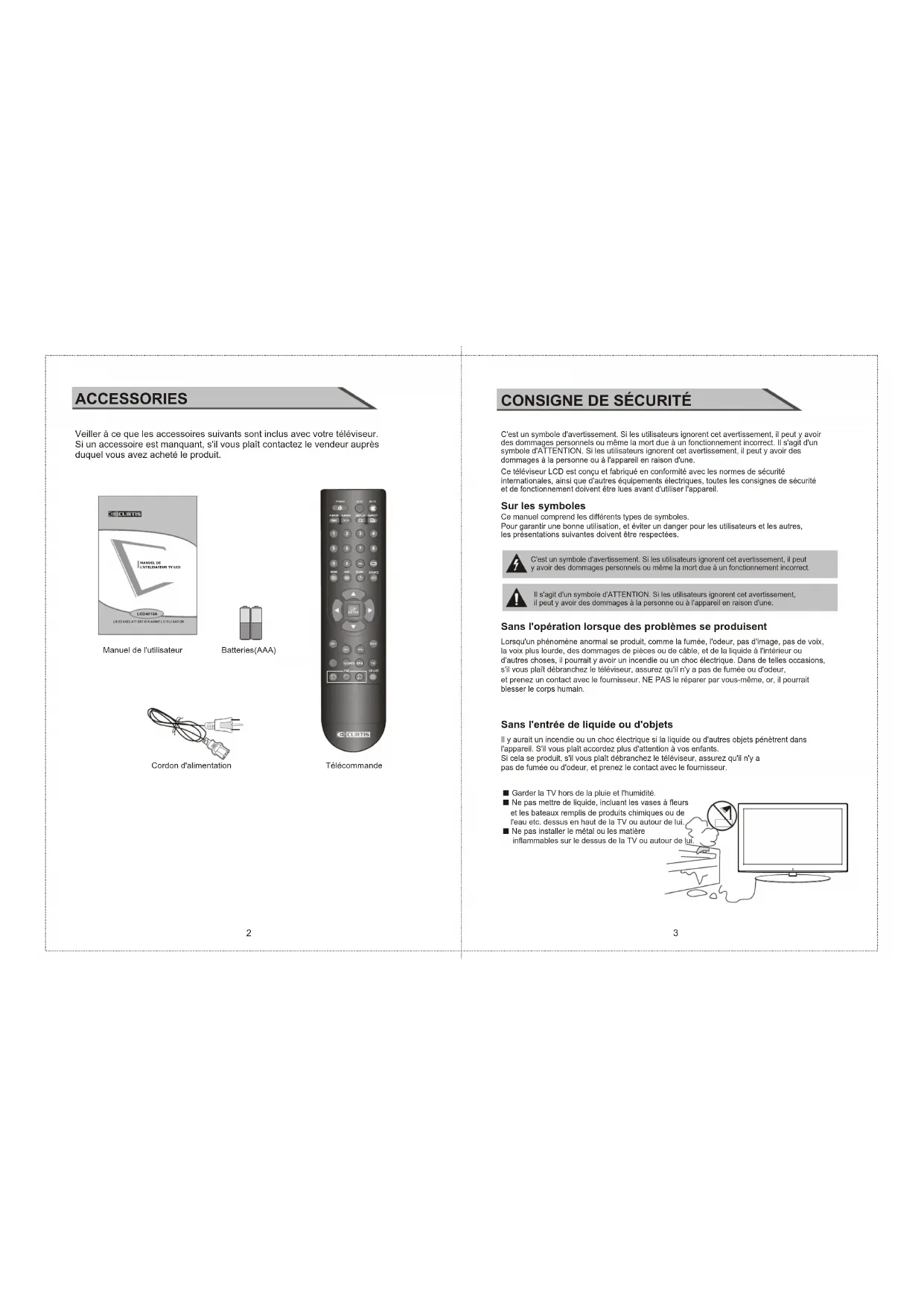Veiller à ce que les accessoires suivants sont inclus avec votre téléviseur. Si un accessoire est manquant, s'il vous plaît contactez le vendeur auprès duquel vous avez acheté le produit. ACCESSORIES Manuel de l'utilisateur Télécommande Batteries(AAA) Cordon d'alimentation