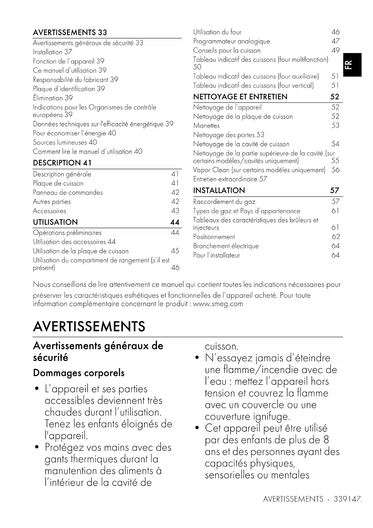 Nettoyage de l’appareil 52Nettoyage de la plaque de cuisson 52Manettes 53Nettoyage des portes 53Nettoyage de la cavité de cuisson 54Nettoyage de la partie supérieure de la cavité (sur certains modèles/cavités uniquement) 55Vapor Clean (sur certains modèles uniquement) 56Entretien extraordinaire 57 INSTALLATION 57 Raccordement du gaz 57Types de gaz et Pays d’appartenance 61Tableaux des caractéristiques des brûleurs et injecteurs 61Positionnement 62Branchement électrique 64Pour l’installateur 64 Nous conseillons de lire attentivement ce manuel qui contient toutes les indications nécessaires pour préserver les caractéristiques esthétiques et fonctionnelles de l’appareil acheté. Pour toute information complémentaire concernant le produit : www.smeg.com AVERTISSEMENTS Avertissements généraux de sécurité Dommages corporels