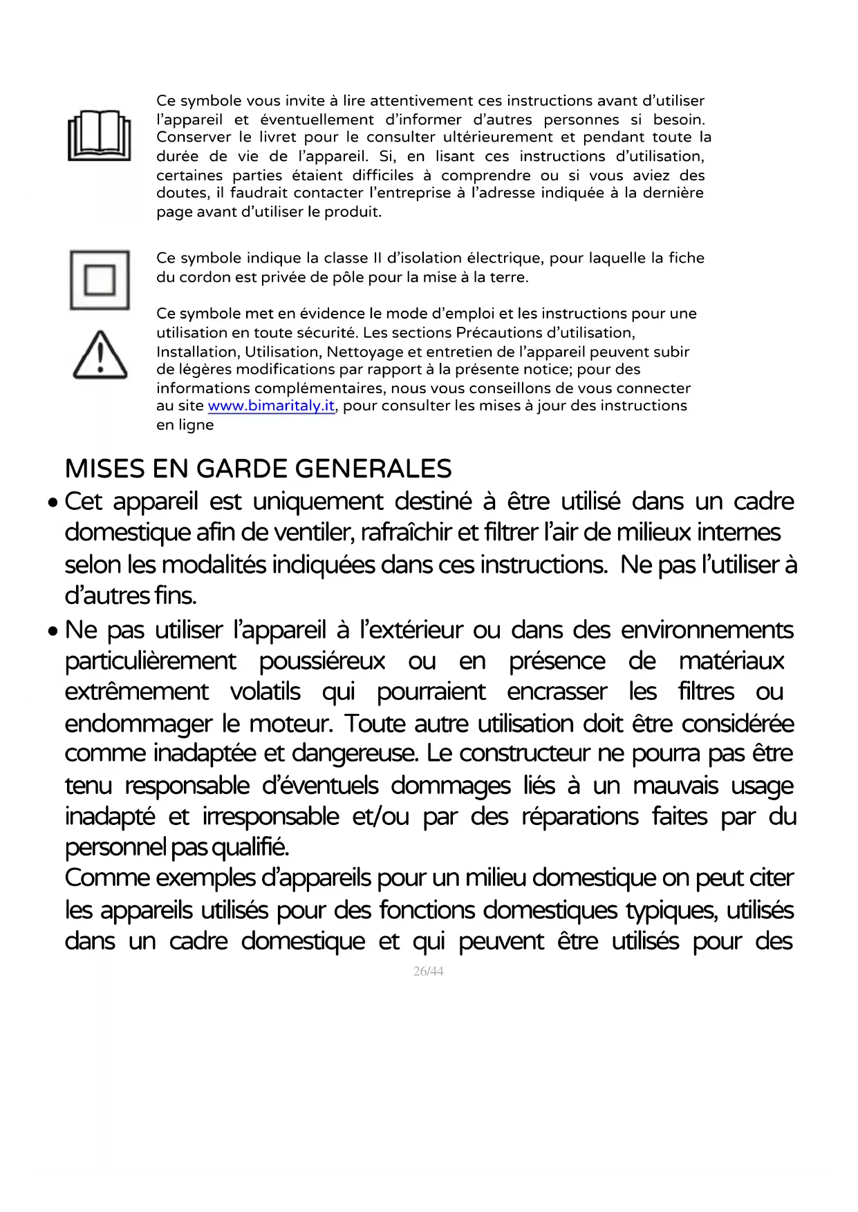 Ce symbole indique la classe II d’isolation électrique, pour laquelle la fiche du cordon est privée de pôle pour la mise à la terre. Ce symbole met en évidence le mode d’emploi et les instructions pour une utilisation en toute sécurité. Les sections Précautions d’utilisation, Installation, Utilisation, Nettoyage et entretien de l’appareil peuvent subir de légères modifications par rapport à la présente notice; pour des informations complémentaires, nous vous conseillons de vous connecter au site www.bimaritaly.it , pour consulter les mises à jour des instructions en ligne