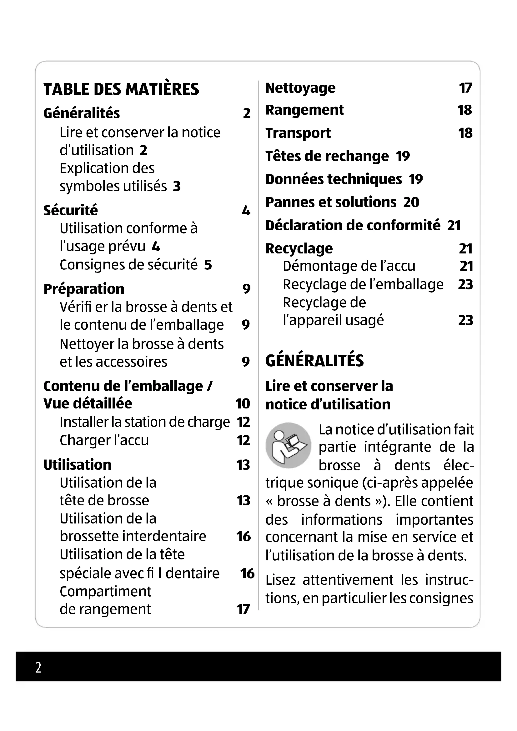 de sécurité, avant d'utiliser la Brosse à dents. Le non-respect de la notice d'utilisation risque de provoquer des blessures graves ou d'endommager la Brosse à dents.