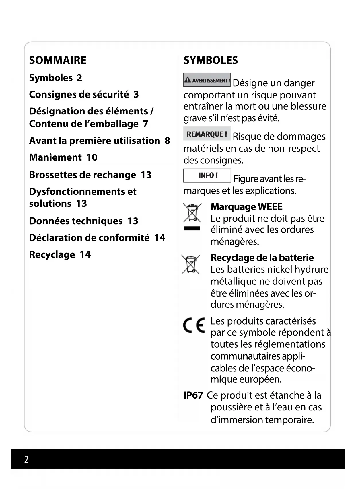 Veuillez lire et suivre intégrale- ment le présent mode d’emploi avant d’utiliser le produit et conservez-le au cas où vous vou- driez le relire ultérieurement. Si vous transmettez le produit à une autre personne, veuillez lui remettre également ce mode d’emploi. Usage du produit conforme à sa destination Le produit sert au brossage des dents et est destiné exclusive- ment à l’usage privé. Il ne convient pas à un usage commercial. Le produit ne doit être employé qu’avec les accessoires compris dans l’emballage et les têtes de brosse à dents adéquates. Danger pour les en- fants et un cercle de personnes élargi Ce produit peut être utili- sé par des enfants et des personnes aux capacités physiques, sensorielles ou mentales réduites ou bien manquant d’expé- rience et/ou de connais- sances à la condition que ces personnes soient sur- veillées ou qu’elles aient reçu les instructions né- cessaires pour se servir du produit en toute sé- curité et aient compris les dangers que comporte son utilisation. Le net- toyage et la maintenance utilisateur ne doivent pas être e ectués par des en- fants, à moins que ceux-ci soient sous surveillance.4 Tenez les enfants éloignés du ma- tériel d’emballage. En cas d’inges- tion, il y a risque d’étou ement. Veillez également à ce que per- sonne n’introduise la tête dans le sachet d’emballage. Les enfants ne doivent pas jouer avec le produit. Danger lié à l’électricité AVERTISSEMENT ! Risque d’électrocu- tion ! Le produit fonctionne avec une tension dangereuse. L’ u t il i s a t io n d e l i q ui d e s c o m b in é e à celle d’appareils électriques re- quiert la plus grande attention ! Une cause fréquente d’accidents domestiques est le manque d’at- tention lors de processus de rou- tine. Veillez à avoir toujours les mains sèches lorsque vous bran- chez ou débranchez l’appareil. La station de recharge ne doit pas être exposée aux gouttes d’eau ni aux éclaboussures. La station de recharge ne doit pas être plongée dans l’eau ou dans d’autres liquides. Danger d’électrocution ! N’utilisez pas la station de recharge à proximité de sources d’humidité comme par exemple un lavabo, une bai- gnoire ou une douche. Raccordez la station de recharge à une prise correctement instal- lée dont la tension correspond aux données techniques. En cas d’utilisation d’un connec- teur intermédiaire ou d’une rallonge, ceux-ci doivent cor- respondre aux dispositions de sécurité en vigueur. L’intensité maximale du courant indiquée ne doit pas être dépassée. Veillez à ce que la prise soit facile- ment accessible pour pouvoir en en cas de nécessité débrancher rapidement l’appareil. N’utilisez pas le produit : - s’il est endommagé, - si le câble de raccordement ou la che réseau sont endomma- gés, - s’il est tombé par terre. Déroulez entièrement le câble de raccordement avant chaque utili- sation.5 Veillez ce faisant à ce que le câble de raccordement ne soit pas coincé, comprimé ou endomma- gé par des arêtes tranchantes ou des objets brûlants. Retirez la che réseau de la prise : - lorsque vous n’utilisez pas la station de recharge, - après le processus de charge, - avant de nettoyer ou de ranger l’appareil, - lorsqu’un dysfonctionnement intervient clairement pendant l’utilisation, - en cas d’orage. Pour débrancher, tirez toujours sur la che réseau et non sur le câble de raccordement. N’e ectuez aucune modi cation sur le produit ou sur le câble de raccordement. Faites e ectuer les répa- rations uniquement par un atelier spécialisé. Tenez également compte des conditions de garantie. Le câble de raccordement de la station de recharge ne peut être remplacé. S’il est endommagé, l’appareil doit être mis au rebut. Le manche ne doit être chargé qu’au moyen de la station de recharge fai- sant partie de l’emballage. L’appareil ne doit pas être raccor- dé à une minuterie ou à un sys- tème de commande à distance séparé, comme par exemple un interrupteur crépusculaire ou une prise radio. Risque de blessures ayant une cause di érente Disposez le câble de raccorde- ment de manière à ce qu’il ne vous fasse pas trébucher. Remplacez immédiate- ment les têtes de brosse usagées ou endomma- gées pour éviter les bles- sures dans la zone buc- cale ou dentaire.6 Dommages matériels Posez l’appareil sur une surface stable, plane et résistante à la cha- leur. Veillez ce faisant à assurer une distance su sante par rapport aux sources de forte chaleur telles que les plaques chau antes, les tuyaux de chau age, etc. Évitez une accumulation de cha- leur et installez l’appareil de ma- nière que la chaleur du boîtier générée par l’utilisation puisse facilement s’évacuer tout autour. Ne déposez aucun objet, comme par exemple des chi ons ou des revues, sur la station de recharge. Il y a risque d’incendie ! Sur la face inférieure de l’appareil se trouve une surface caoutchou- tée. Comme les meubles et les surfaces du sol sont composés de matériaux très di érents et sont traités avec des produits d’entre- tien très divers, on ne peut pas ex- clure totalement que beaucoup de ces substances contiennent des composants susceptibles d’attaquer et de ramollir la sur- face caoutchoutée. Placez le cas échéant une semelle antidéra- pante sous l’appareil. N’utilisez pour le nettoyage ni produit chimique agres- sif, ni produit de récurage, ni éponge dure, etc. Indications concernant la bat- terie Ne pas exposer la batterie (par- tie manche) à des conditions ex- trêmes, par exemple sur des ra- diateurs, sous un rayonnement solaire direct. Ceci augmente le risque de fuite !7