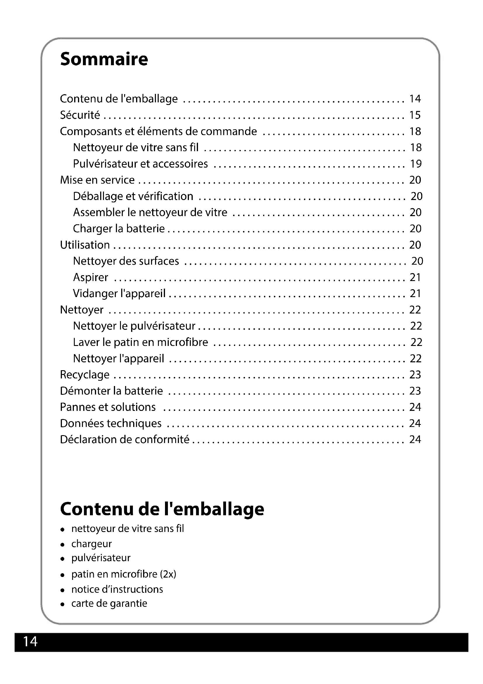 - Déclaration de conformité Contenu de l'emballage z nettoyeur de vitre sans filz chargeurz pulvérisateurz patin en microfibre (2x)z notice d’instructionsz carte de garantie Druckbuch Fensterreiniger BEL QUIGG.book Seite 14 Dienstag, 15. November 2016 3:11 1515 Sécurité Lire et conserver la notice d'instructions Lisez les instructions suivantes avec atten- tion et conservez la notice afin de pouvoir la relire ultérieurement si nécessaire. Joignez la notice d'instruc- tions si vous remettez le net- toyeur de vitre à une autre personne. Instructions importantes z Cet appareil peut être utili- sé par des enfants âgés de 8 ans et plus, ainsi que par des personnes dont les ca- pacités physiques, senso- rielles ou mentales sont ré- duites ou manquant d’ex- périence et/ou de connaissances, à condition qu’elles soient surveillées ou qu’elles aient reçu des instructions concernant la bonne utilisation de l’appa- reil et aient compris les risques en découlant. z L’appareil et le chargeur doivent être conservés hors de portée des enfants âgés de moins de 8 ans. z Le nettoyage et les travaux de maintenance qui sont la charge de l’utilisateur ne doivent pas être réalisés par des enfants, sauf s’ils sont âgés de 8 ans et plus et sont surveillés. z Les enfants doivent être surveillés afin d’être sûr qu’ils ne jouent pas avec l’appareil. z Le nettoyeur de vitre et le chargeur ne doivent pas être plongés dans de l’eau ou dans d’autres liquides. Risque de choc électrique ! z Utilisez exclusivement le chargeur fourni avec l’ap- pareil. Celui-ci doit être uti- lisé à l’intérieur, dans des locaux secs, et doit être protégé contre l’humidité. z Le câble du chargeur n'est pas réparable. Si le câble ou le chargeur est endomma- gé, il doit être éliminé et remplacé par un chargeur du même type. z Ne laissez pas l'appareil sans surveillance lorsqu'il est connecté au réseau. Druckbuch Fensterreiniger BEL QUIGG.book Seite 15 Dienstag, 15. November 2016 3:11 1516 z N'utilisez pas l'appareil -s'il est tombé, - s'il présente des dom- mages apparents ou - s'il n'est pas étanche. z Tenez l'appareil hors de portée des enfants, lorsqu'il est en marche ou qu'il re- froidit. Usage réglementaire z Cet appareil est conçu pour le net- toyage humide des fenêtres et d’autres surfaces lisses adaptées. z L’appareil est prévu pour être utilisé à l’intérieur et à des fins privées. Il n’est pas adapté pour être utilisé à l’extérieur et à des fins commer- ciales. Danger pour les enfants z Conservez l’emballage et les films de protection hors de portée des bébés et des enfants en bas âge, risque d’étouffement ! Assurez- vous que les enfants ne glissent pas la tête dans le sachet d’emballage. Risques liés à l’électricité z Attention ! Vos mains doivent être sèches, n’utilisez pas l’appareil dans un environnement humide ou avec un taux d’humidité élevé. z Branchez le chargeur sur une prise de courant installée de façon régle- mentaire, dont la tension doit être conforme aux « Caractéristiques techniques ». z Utilisez exclusivement le chargeur fourni avec l’appareil pour rechar- ger la batterie. z Assurez-vous que la prise de cou- rant est facilement accessible, afin de pouvoir débrancher rapidement le chargeur si nécessaire. z Déroulez entièrement le câble du chargeur avant de charger l’appa- reil. Assurez-vous que le câble ne risque pas d’être endommagé par des bords tranchants ou des objets chauds. z Déconnectez le chargeur et le net- toyeur de vitre et débranchez le chargeur de la prise de courant : – lorsque la batterie est chargée, – si une panne se produit manifes- tement pendant l’opération de charge (par ex. fumée, odeur etc.), – avant de nettoyer ou de ranger l’appareil, –en cas d’orage. Tenez toujours le chargeur et non le câble pour débrancher le chargeur. z N'entreprenez aucun changement sur l'appareil. Si l'appareil est endommagé, veuillez vous adresser à un atelier spécialisé pour le faire réparer afin d'éviter toute mise en danger. Respectez également les modalités de garantie. z Effectuez un contrôle visuel avant chaque utilisation. Si vous consta- tez que l'appareil est endommagé, celui-ci ne pourra être utilisé à nou- veau qu'après avoir été réparé par un atelier qualifié. z Ne déposez pas l'appareil dans des flaques d'eau ou d'autres accumula- tions de liquide. Druckbuch Fensterreiniger BEL QUIGG.book Seite 16 Dienstag, 15. November 2016 3:11 1517 Risque d’incendie z N’utilisez pas l’appareil pour aspirer des objets enflammés ou incandes- cents, par ex. des cigarettes, des allumettes ou des cendres incan- descentes. z N’utilisez pas l’appareil pour aspirer des liquides inflammables, par ex. de l’essence. N’utilisez pas l’appareil dans des endroits où ces liquides pourraient être présents. Risque de blessures z Ne faites pas fonctionner l’appareil s’il est manifestement endommagé, si des composants sont détachés ou manquants, ou si des dispositifs de sécurité ou d’autres composants ne fonctionnent pas correctement. z Ne modifiez pas l’appareil. Les répa- rations doivent impérativement être réalisées par un atelier qualifié, afin d’éviter tout risque éventuel. z En cas d’utilisation non conforme, de l’acide peut s’échapper de la bat- terie. Évitez tout contact avec l’acide. En cas de contact acciden- tel, rincer avec de l’eau. Si de l’acide pénètre dans les yeux, consultez également un médecin. L’acide qui s’est échappé de la batterie peut provoquer des irritations de la peau ou des brûlures. z Rangez l’appareil après utilisation, pour éviter tout risque d’accident. Attention - Dommages matériels z N’utilisez pas d’accessoires d’un autre fabricant. Utilisez le nettoyeur de vitre exclusivement comme il est décrit dans la notice d’inst