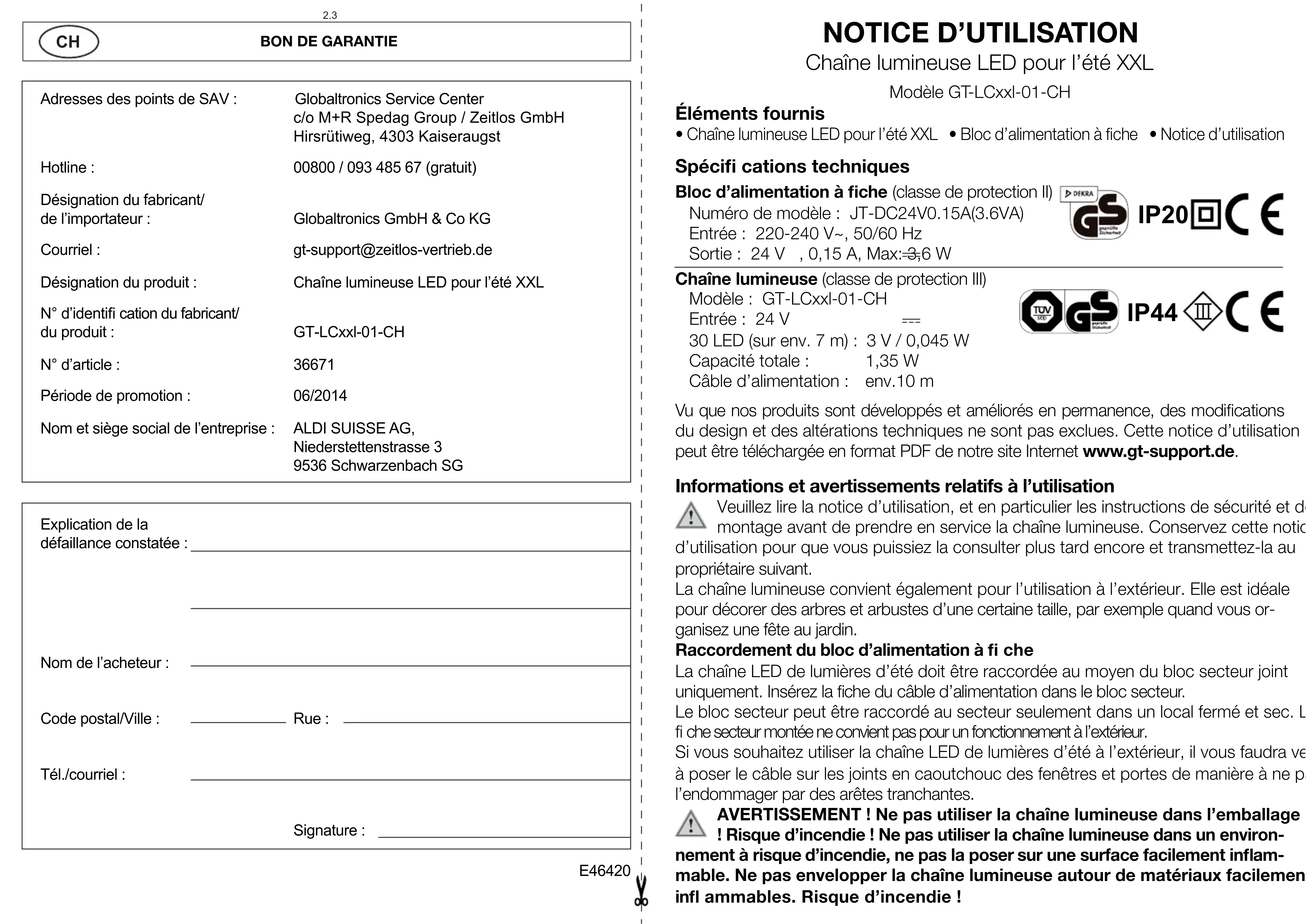 Chaîne lumineuse LED pour l’été XXL Modèle GT-LCxxl-01-CH Adresses des points de SAV : Globaltronics Service Center c/o M+R Spedag Group / Zeitlos GmbH Hirsrütiweg, 4303 KaiseraugstHotline : 00800 / 093 485 67 (gratuit) Désignation du fabricant/ de l’importateur : Globaltronics GmbH & Co KGCourriel : gt-support@zeitlos-vertrieb.deDésignation du produit : Chaîne lumineuse LED pour l’été XXLN° d’identifi cation du fabricant/du produit : GT-LCxxl-01-CHN° d’article : 36671Période de promotion : 06/2014 Nom et siège social de l’entreprise : ALDI SUISSE AG, Niederstettenstrasse 3 9536 Schwarzenbach SG Explication de la défaillance constatée :Nom de l’acheteur :Code postal/Ville : Rue :Tél./courriel : Signature : E46420