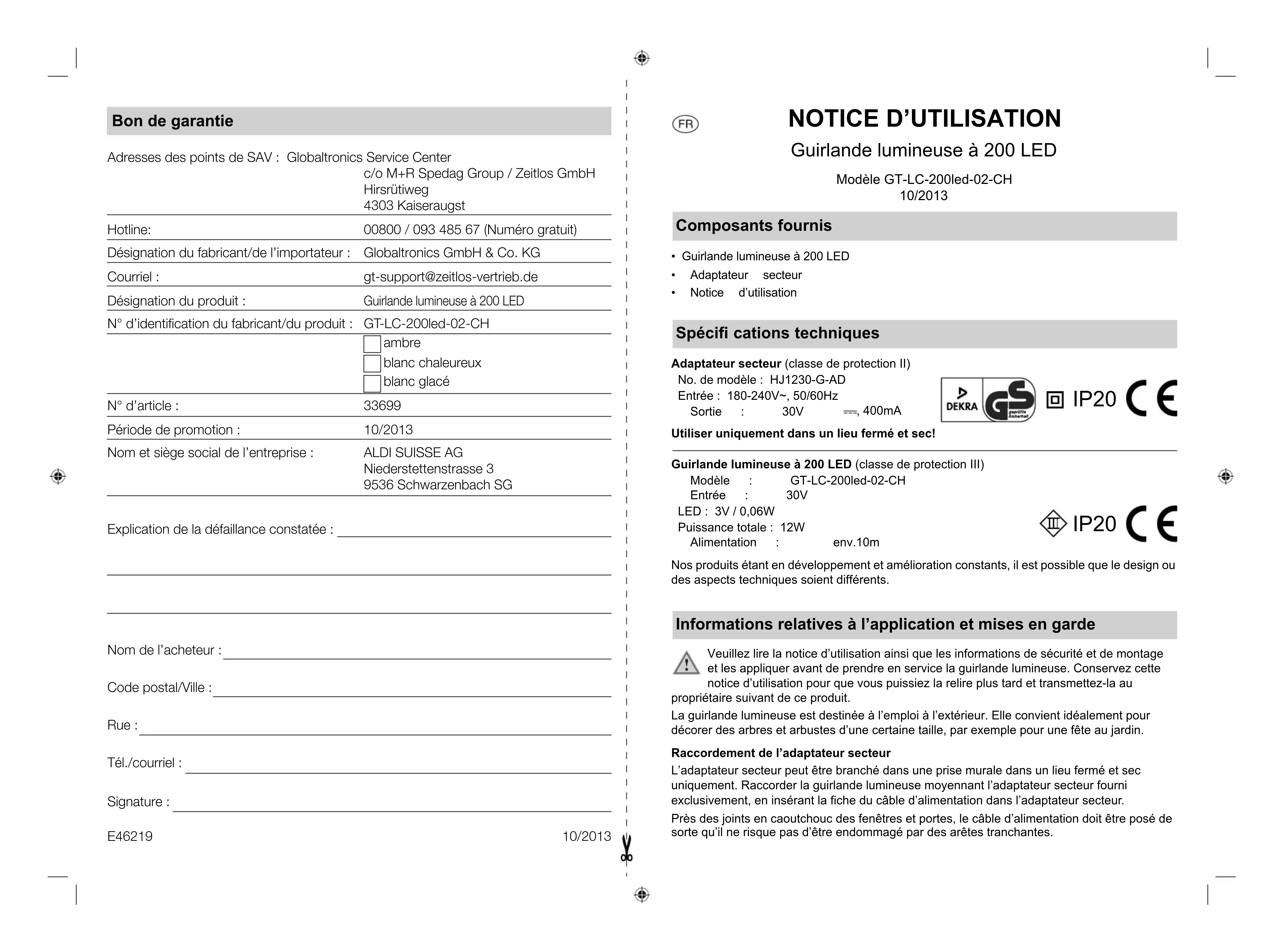 - Guirlande lumineuse à 200 LED• Adaptateur secteur• Notice d’utilisation Spécifi cations techniques Adaptateur secteur (classe de protection II) No. de modèle : HJ1230-G-AD Entrée : 180-240V~, 50/60Hz Sortie : 30V , 400mAUtiliser uniquement dans un lieu fermé et sec!Guirlande lumineuse à 200 LED (classe de protection III) Modèle : GT-LC-200led-02-CH Entrée : 30V LED : 3V / 0,06W Puissance totale : 12W Alimentation : env.10mNos produits étant en développement et amélioration constants, il est possible que le design ou des aspects techniques soient différents. Bon de garantie Adresses des points de SAV : Globaltronics Service Center c/o M+R Spedag Group / Zeitlos GmbH Hirsrü tiweg 4303 Kaiseraugst Hotline: 00800 / 093 485 67 (Numéro gratuit) Désignation du fabricant/de l’importateur : Globaltronics GmbH & Co. KG Courriel : gt-support@zeitlos-vertrieb.de Désignation du produit : Guirlande lumineuse à 200 LED N° d’identifi cation du fabricant/du produit : GT-LC-200led-02-CH ambre blanc chaleureux blanc glacé N° d’article : 33699 Période de promotion : 10/2013 Nom et siège social de l’entreprise : ALDI SUISSE AG Niederstettenstrasse 3 9536 Schwarzenbach SG Explication de la défaillance constatée : Nom de l’acheteur : Code postal/Ville : Rue : Tél./courriel : Signature : E46219 10/2013 IP20 IP20Bon de garantie La garantie est valable pour une durée de trois ans à dater du jour de l’achat ou de la livraison effective des articles. Elle ne peut être reconnue valable que sur production du bon de caisse et du bon de garantie dûment renseigné. Il est donc indispensable de conserver ces deux documents. Le fabricant s’engage à traiter gratuitement toute réclamation relative à un problème de maté- riel ou à un défaut de fabrication, en se réservant le droit d’opter à sa convenance entre une réparation, un échange, ou un remboursement en espèces. La garantie ne s’applique pas aux dommages survenus à l’occasion d’un accident, d’un événement imprévu (foudre, inondation, incendie, etc. ), d’une utilisation inappropriée ou d’un transport sans précaution, d’un refus d’observer les recommandations de sécurité ou d’entretien, ou de toute forme de modifi cation ou de transformation inappropriée. La garantie pour les pièces d’usures et consommables (comme par exemple les ampoules, les batteries ou les pneus) est valable 6 mois dans le cadre d’une utilisation normale et conforme. Les traces d’usures causées par une utilisation quotidienne (rayures, bosses) ne sont pas considérées comme des problèmes couverts par la garantie. L’obligation légale de garantie du fournisseur n’est pas limitée par la présente garantie. La durée de validité de la garantie ne peut être prolongée que si cette prolongation est prévue par des dispositions légales. Dans les pays où les textes en vigueur prévoient une garantie (obli- gatoire) et/ou une obligation de tenue de stock de pièces détachées, et/ou une réglementation des dédommagements, ce sont les obligations minimum prévues par la loi qui seront prises en considération. L’entreprise de service après-vente et le vendeur déclinent toute responsabilité relative aux données contenues et aux réglages effectués par le déposant sur le produit lors de l’envoi en réparation. Après l’expiration de la durée de garantie, il vous est toujours possible d’adresser les appareils défectueux aux services après-vente à des fi ns de réparation. Mais en dehors de la période de garantie, les éventuelles réparations seront effectuées à titre onéreux. Au cas où les répara- tions seraient payantes, vous serez avertis auparavant. MISE EN GARDE ! N’utilisez jamais la guirlande lumineuse dans son emballage ! Risque d’incendie ! N’employez jamais la guirlande lumineuse dans un environnement infl ammable ou sur une surface combustible Evitez d’envelopper la guirlande lumineuse de matériaux facilement infl ammables. Risque d’incendie ! Il est interdit d’établir une connexion électrique entre la guirlande lumineuse et d’autres guirlandes ou fi lets lumineux ! MISE EN GARDE ! Lorsque l’adaptateur secteur ou le câble d’alimentation présente des dommages visibles, la guirlande ne doit plus être utilisée afi n d’écarter le risque de blessures ou dommages. Il n’est pas possible de remplacer les LED défectueuses Conservez cette notice et transmettez-la à tous les autres utilisateurs. Mise au rebut Déclaration de conformité Nettoyage et stockage MISE EN GARDE ! Séparez la guirlande lumineuse du secteur avant le nettoyage ! Risque d’électrocution ! Nettoyez la guirlande lumineuse à l’aide d’un chiffon humide et d’un détergeant non agressif. Laissez sécher la guirlande lumineuse avant de la ranger dans l’emballage d’origine. Veuillez éliminer l’appareil de manière conforme quand vous ne l’utilisez plus. Déposez l’appareil à un point de ramassage pour déchets électriques et électroniques. Ne les jetez pas avec les ordures ménagères ! Eliminez le matériel d’emballage correctement et écologiquement. Il s’agit de matières premières réutilisables. Renseignez-vous auprès de l’administration locale à propos du règlement actuel de mise au rebut et des heures d’ouverture des points de ramassage. La conformité de ce produit avec les normes prévues par la loi est garantie. Vous trouverez la déclaration de conformité complète sur Internet sous www.gt-support.de. Commercialisé par (ce n’est pas l’adresse du service !) : Globaltronics GmbH & Co. KG D-20095 Hamburg Domstr. 19