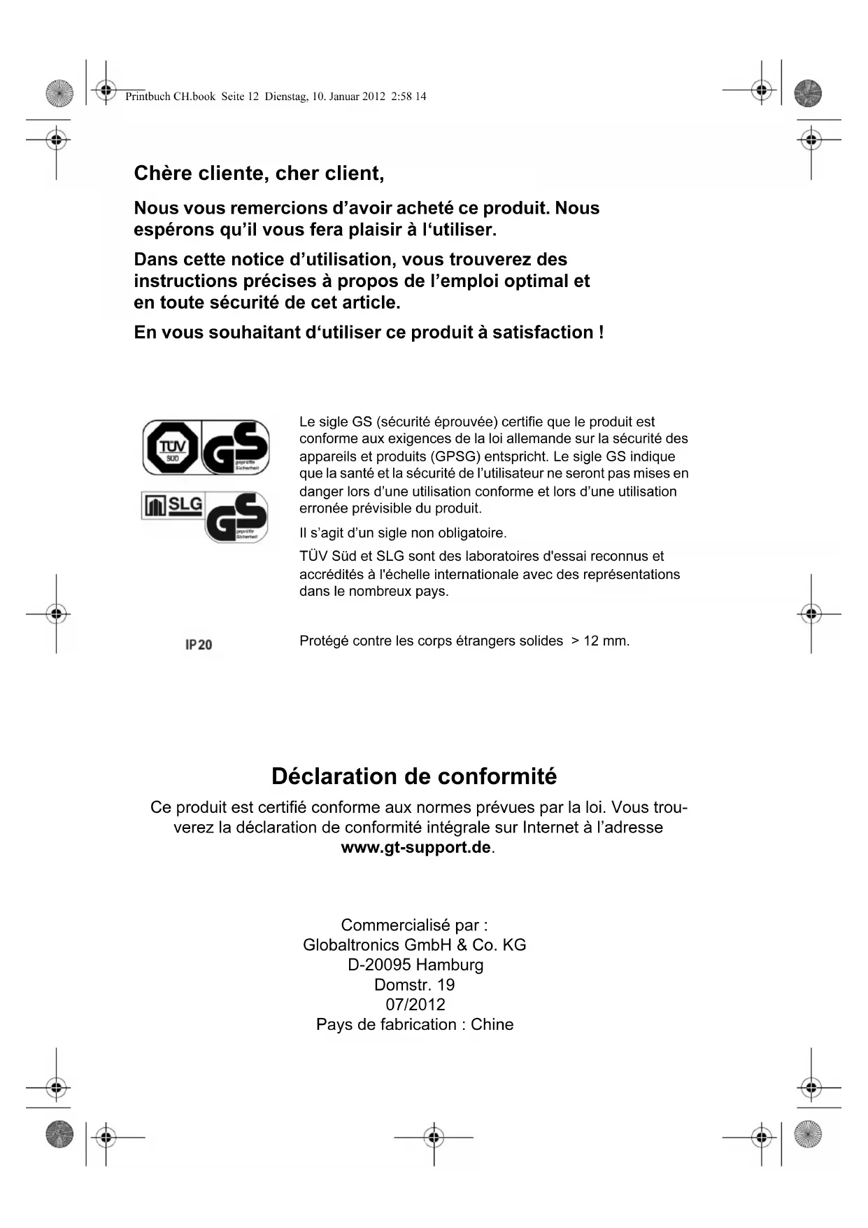 Printbuch CH.book Seite 10 Dienstag, 10. Januar 2012 2:58 14Utilisation Guirlande lumineuse d’été LED Période de promotion : 07/2012, Type : GT-PLC-led-01CH Notice d´utilisation originale Printbuch CH.book Seite 11 Dienstag, 10. Januar 2012 2:58 14Commercialisé par : Globaltronics GmbH & Co. KG D-20095 Hamburg Domstr. 19 07/2012 Pays de fabrication : Chine Chère cliente, cher client, Nous vous remercions d’avoir acheté ce produit. Nous espérons qu’il vous fera plaisir à l‘utiliser. Dans cette notice d’utilisation, vous trouverez des instructions précises à propos de l’emploi optimal et en toute sécurité de cet article. En vous souhaitant d‘utiliser ce produit à satisfaction ! Déclaration de conformité Ce produit est certifié conforme aux normes prévues par la loi. Vous trou- verez la déclaration de conformité intégrale sur Internet à l’adresse www.gt-support.de. Le sigle GS (sécurité éprouvée) certifie que le produit est conforme aux exigences de la loi allemande sur la sécurité des appareils et produits (GPSG) entspricht. Le sigle GS indique que la santé et la sécurité de l’utilisateur ne seront pas mises en danger lors d’une utilisation conforme et lors d’une utilisation erronée prévisible du produit. Il s’agit d’un sigle non obligatoire. TÜV Süd et SLG sont des laboratoires d'essai reconnus et accrédités à l'échelle internationale avec des représentations dans le nombreux pays. Protégé contre les corps étrangers solides > 12 mm. Printbuch CH.book Seite 12 Dienstag, 10. Januar 2012 2:58 1413 Guirlande lumineuse d’été LED Composants fournis