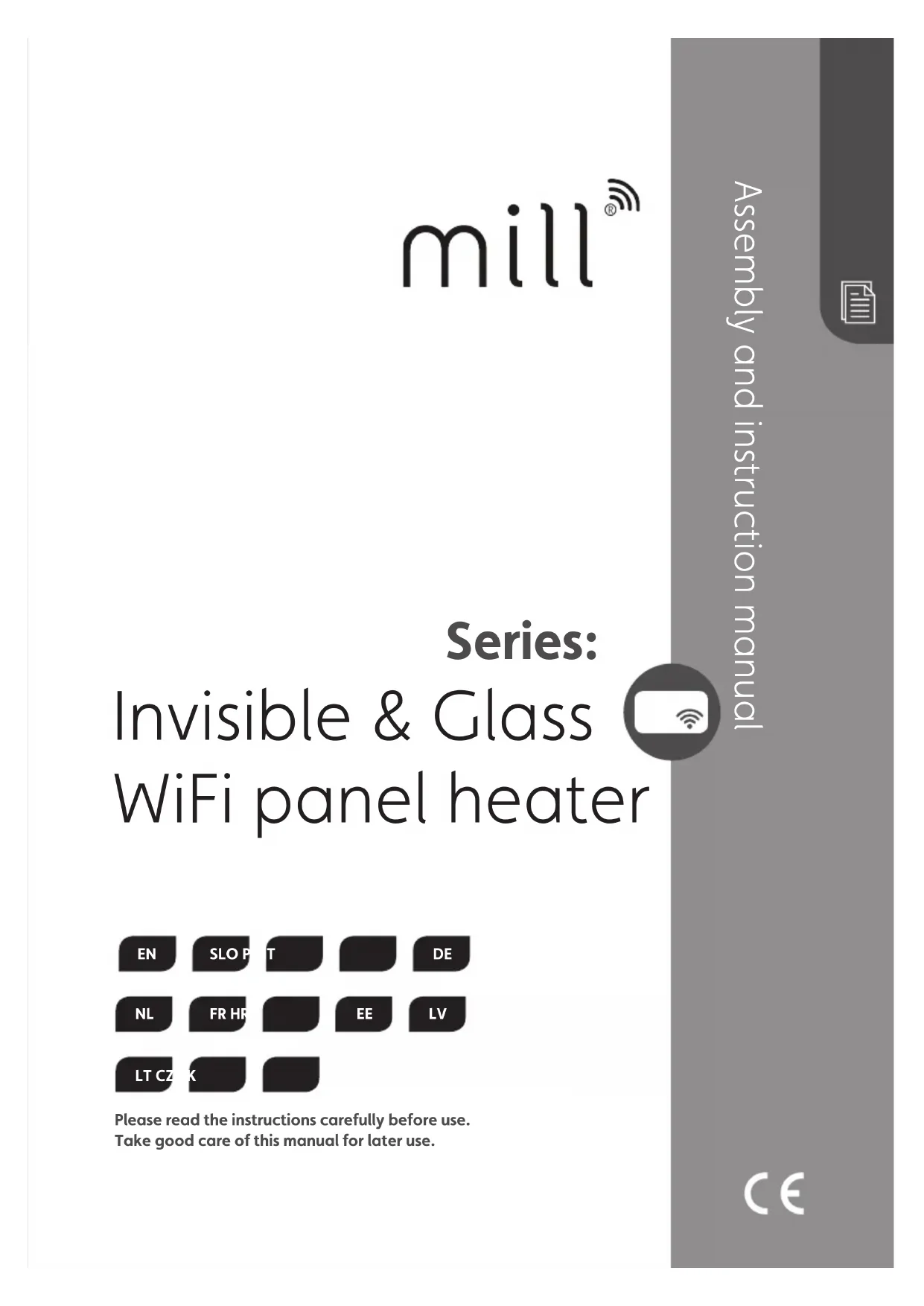 millheat.com Spècifications Utilisable dans les zones de catégorie 2 des salles d’eau. IMPORTANT : Ces chauffages se connectent directement au routeur WiFi du domicile. Il est donc important de veiller à disposer d’un routeur assez puissant pour gérer simu- ltanément tous les appareils qui y sont connectés. Avant la première utilisation Après avoir déballé le radiateur, assurez-vous que le produit n’a pas été endommagé pendant le transport. Contactez le distributeur ou l’importateur si vous découvrez des dommages visibles sur le produit. Conservez l’emballage externe pour transporter le radiateur ultérieurement. Si vous souhaitez mettre l’emballage au rebut, assurez-vous de le faire correctement. Éloignez les sacs en plastique des enfants. Première utilisation Après avoir allumé le radiateur pour la première fois ou après une longue période sans utilisation, l’appareil peut dégager une odeur de brûlé pendant une courte période. Ceci est normal. Veuillez lire attentivement ce mode d’emploi avant l’utilisation. Conservez-le pour une utilisation ultérieure. Il est également normal que le radiateur émette un bruit lorsqu’il chauffe ou se refroidit. Distances minimales à respecter ≥50 mmModèle ThermostatCouleur HauteurLongueur AmpéragePuissanceactive(W)Indice IP WiFi Puissance d’émission maximale: ≤20 dBm Gamme de frèquence: 2400-2483.5 MHz