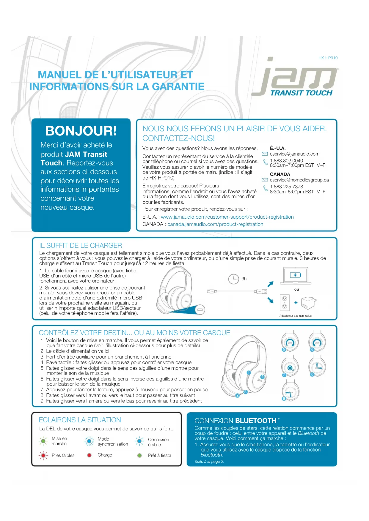 BONJOUR! Merci d’avoir acheté le produit JAM Transit Touch. Reportez-vous aux sections ci-dessous pour découvrir toutes les informations importantes concernant votre nouveau casque. Vous avez des questions? Nous avons les réponses. Contactez un représentant du service à la clientèle par téléphone ou courriel si vous avez des questions. Veuillez vous assurer d'avoir le numéro de modèle de votre produit à portée de main. (Indice : il s’agit de HX-HP910)Enregistrez votre casque! Plusieurs informations, comme l'endroit où vous l’avez acheté ou la façon dont vous l’utilisez, sont des mines d’or pour les fabricants. Pour enregistrer votre produit, rendez-vous sur :É.-U.A. : www.jamaudio.com/customer-support/product-registrationCANADA : canada.jamaudio.com/product-registrationÉ.-U.A.cservice@jamaudio.com1.888.802.00408:30am–7:00pm EST M–Fcservice@homedicsgroup.ca1.888.225.73788:30am–5:00pm EST M–FCANADA NOUS NOUS FERONS UN PLAISIR DE VOUS AIDER. CONTACTEZ-NOUS!
