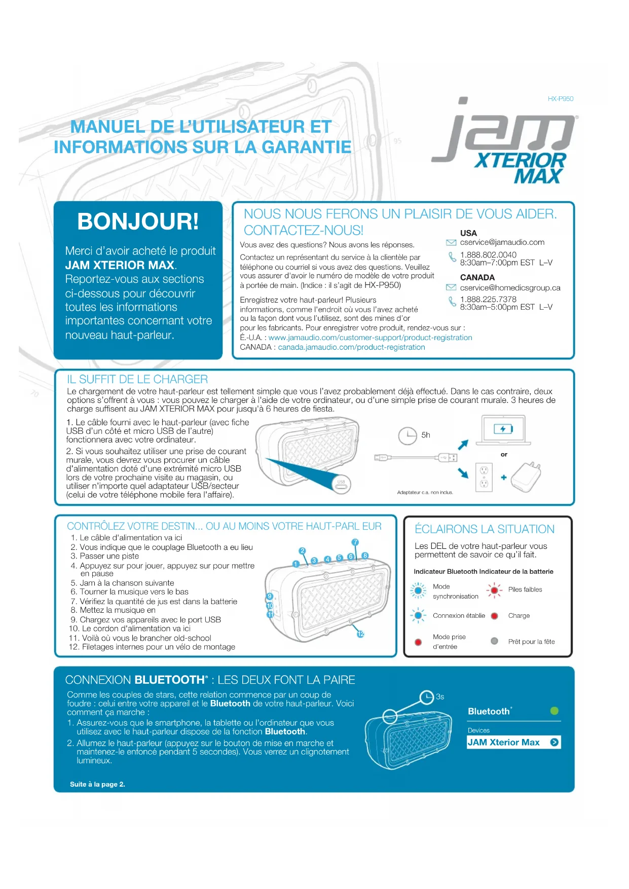 BONJOUR! Merci d’avoir acheté le produit JAM XTERIOR MAX. Reportez-vous aux sections ci-dessous pour découvrir toutes les informations importantes concernant votre nouveau haut-parleur. NOUS NOUS FERONS UN PLAISIR DE VOUS AIDER. CONTACTEZ-NOUS! Vous avez des questions? Nous avons les réponses. Contactez un représentant du service à la clientèle par téléphone ou courriel si vous avez des questions. Veuillez vous assurer d'avoir le numéro de modèle de votre produit à portée de main. (Indice : il s’agit de HX-P950) Enregistrez votre haut-parleur! Plusieurs informations, comme l'endroit où vous l’avez acheté ou la façon dont vous l’utilisez, sont des mines d’or pour les fabricants. Pour enregistrer votre produit, rendez-vous sur :É.-U.A. : www.jamaudio.com/customer-support/product-registrationCANADA : canada.jamaudio.com/product-registration