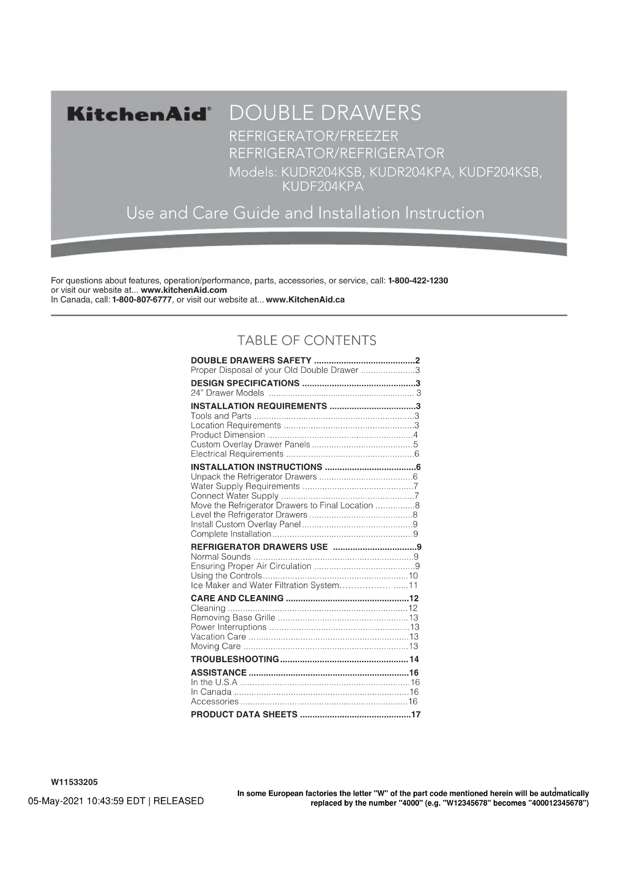 Modèles: KUDR204KSB, KUDR204KPA, KUDF204KSB, KUDF204KPA Guide d’Utilisation et d’Entretien et Instructions d’Installation 05-May-2021 10:43:59 EDT | RELEASED In some European factories the letter "W" of the part code mentioned herein will be automaticallyreplaced by the number "4000" (e.g. "W12345678" becomes "400012345678")SECURITÉ DU DOUBLE TIROIR Votre sécurité et celle des autres est très importante. Nous donnons de nombreux messages de sécurité importants dans ce manuel et sur votre appareil ménager. Assurez-vous de toujours lire tous les messages de sécurité et de vous y conformer. Risque possible de décès ou de blessure grave si vous ne suivez pas immédiatement les instructions. Risque possible de décès ou de blessure grave si vous ne suivez pas les instructions. Tous les messages de sécurité vous diront quel est le danger potentiel et vous disent comment réduire le risque de blessure et ce qui peut se produire en cas de non-respect des instructions.