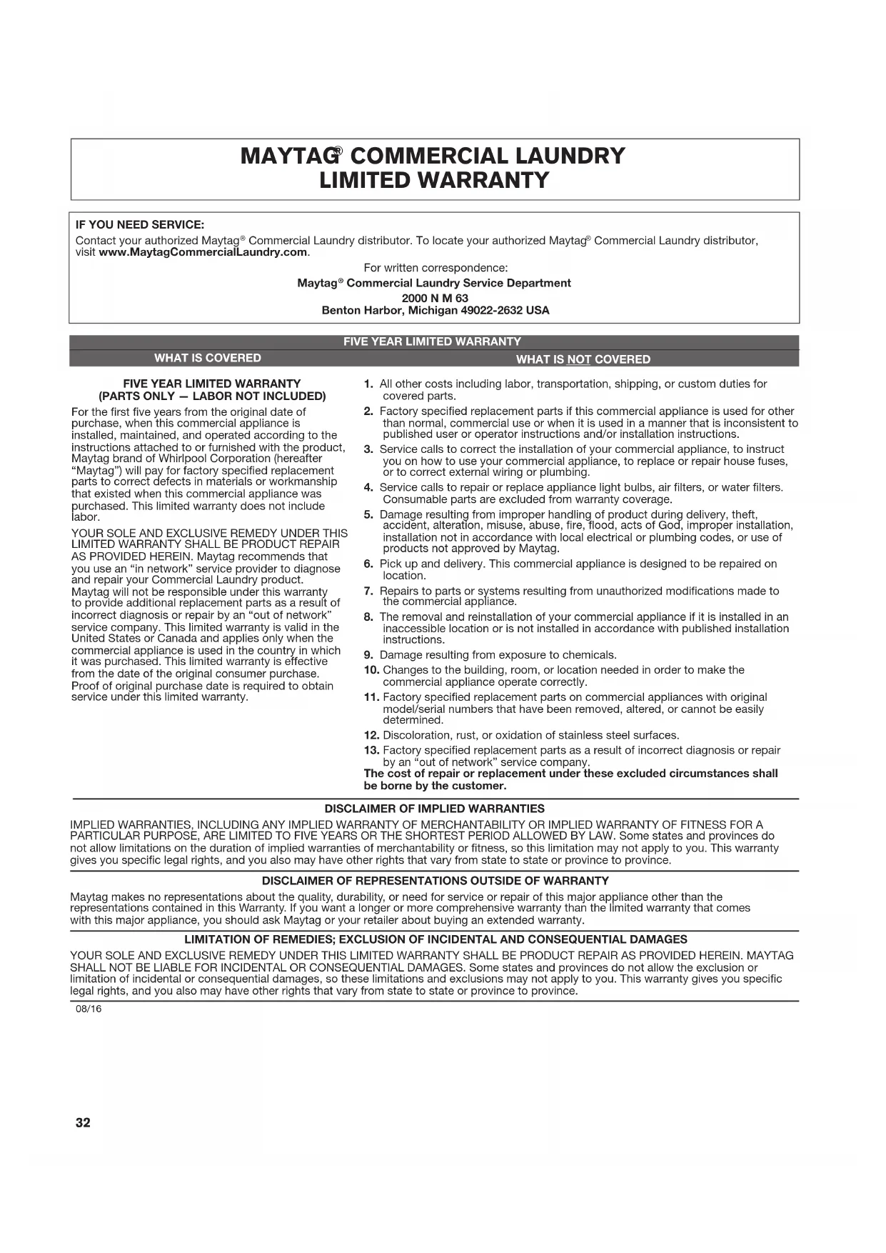 LE CADRE DE LA PRÉSENTE GARANTIE LIMITÉE CONSISTE EN LA RÉPARATION PRÉVUE CI-DESSUS. Maytag recommande que l’utilisateur emploie les services d’un dépanneur “intra-réseau” pour diagnostiquer la panne et réparer le produit de buanderie à usage commercial concerné. Dans le cadre de la présente garantie, Maytag ne sera pas responsable de l’octroi de pièces de rechange supplémentaires suite à un diagnostic erroné ou à une réparation effectuée par un dépanneur “hors réseau”. Cette garantie limitée est valide aux États-Unis ou au Canada et s’applique exclusivement lorsque l’appareil commercial est utilisé dans le pays où il a été acheté. La présente garantie limitée est valable à compter de la date d’achat initial par le consommateur. Une preuve de la date d’achat initial est exigée pour obtenir un dépannage dans le cadre de la présente garantie limitée. CLAUSE D’EXONÉRATION DE RESPONSABILITÉ AU TITRE DES GARANTIES IMPLICITES LES GARANTIES IMPLICITES, Y COMPRIS LES GARANTIES IMPLICITES DE QUALITÉ MARCHANDE OU D’APTITUDE À UN USAGE PARTICULIER, SONT LIMITÉES À CINQ ANS OU À LA PLUS COURTE PÉRIODE AUTORISÉE PAR LA LOI. Certains États et certaines provinces ne permettent pas de limitation sur la durée des garanties implicites, de qualité marchande ou d’aptitude à un usage particulier, de sorte que la limitation ci-dessus peut ne pas être applicable dans votre cas. Cette garantie vous confère des droits juridiques spécifiques et vous pouvez également jouir d’autres droits qui peuvent varier d’une juridiction à l’autre. LIMITATION DES RECOURS; EXCLUSION DES DOMMAGES FORTUITS OU INDIRECTS VOTRE SEUL ET EXCLUSIF RECOURS DANS LE CADRE DE LA PRÉSENTE GARANTIE LIMITÉE CONSISTE EN LA RÉPARATION PRÉVUE CI-DESSUS. MAYTAG NE SERA PAS TENUE RESPONSABLE DES DOMMAGES DIRECTS OU INDIRECTS. Certains États et certaines provinces ne permettent pas l’exclusion ou la limitation des dommages fortuits ou indirects de sorte que ces limitations et exclusions peuvent ne pas être applicables dans votre cas. Cette garantie vous confère des droits juridiques spécifiques et vous pouvez également jouir d’autres droits qui peuvent varier d’une juridiction à l’autre. EXONÉRATION DE RESPONSABILITÉ DANS LES DOMAINES NON COUVERTS PAR LA GARANTIE Maytag décline toute responsabilité au titre de la qualité, de la durabilité ou en cas de dépannage ou de réparation nécessaire sur cet appareil ménager autre que les responsabilités énoncées dans la présente garantie. Si vous souhaitez une garantie plus étendue ou plus complète que la garantie limitée fournie avec ce gros appareil ménager, adressez-vous à Maytag ou à votre détaillant pour obtenir les modalités d’achat d’une garantie étendue. 08/16 SI VOUS AVEZ BESOIN DE SERVICE : Communiquer avec votre distributeur de produits de buanderie commerciaux Maytag