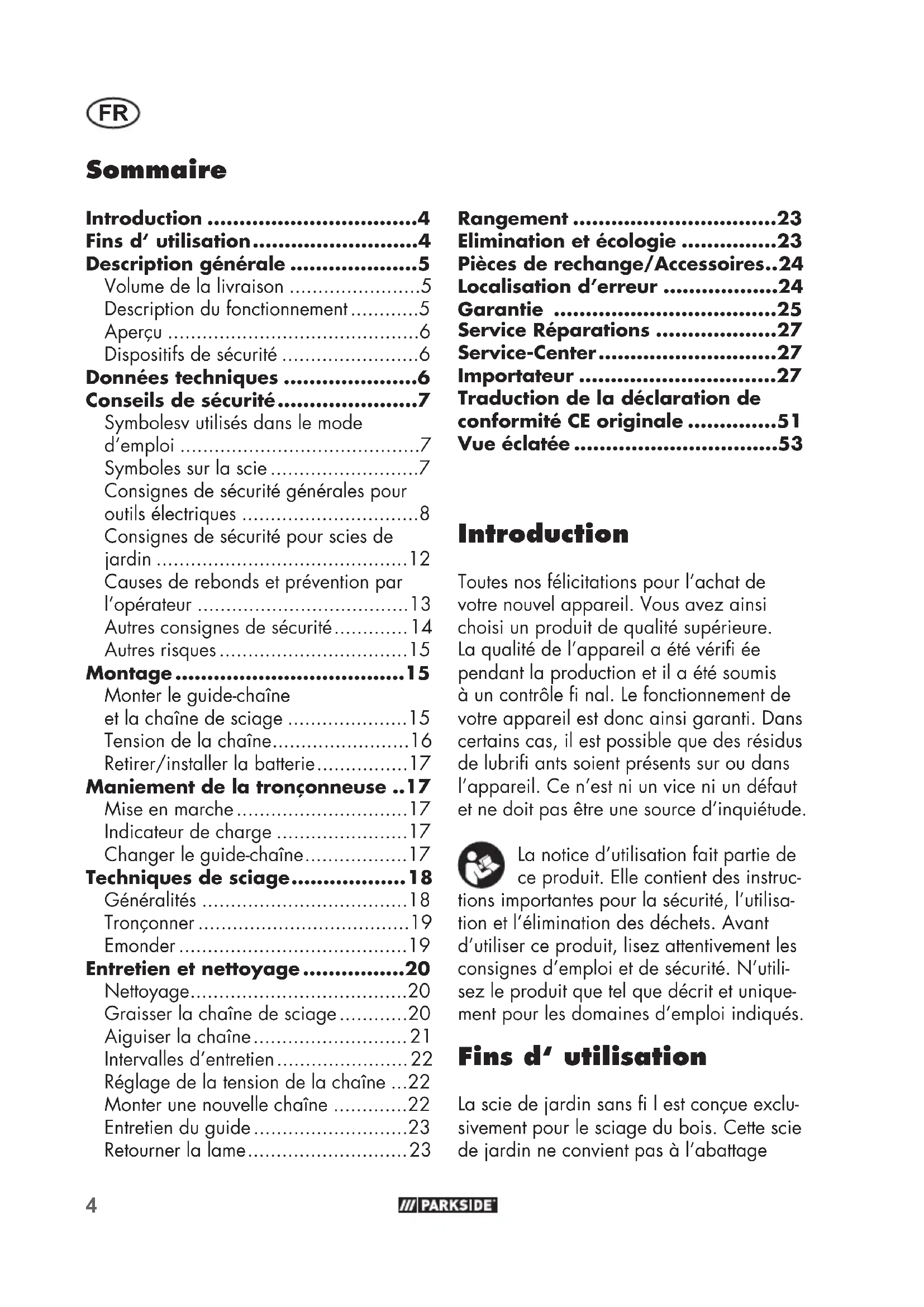 - Vue éclatée Introduction Toutes nos félicitations pour l’achat de votre nouvel appareil. Vous avez ainsi choisi un produit de qualité supérieure. La qualité de l’appareil a été vérifi ée pendant la production et il a été soumis à un contrôle fi nal. Le fonctionnement de votre appareil est donc ainsi garanti. Dans certains cas, il est possible que des résidus de lubrifi ants soient présents sur ou dans l’appareil. Ce n’est ni un vice ni un défaut et ne doit pas être une source d’inquiétude. La notice d’utilisation fait partie de ce produit. Elle contient des instruc- tions importantes pour la sécurité, l’utilisa- tion et l’élimination des déchets. Avant d’utiliser ce produit, lisez attentivement les consignes d’emploi et de sécurité. N’utili- sez le produit que tel que décrit et unique- ment pour les domaines d’emploi indiqués. Fins d‘ utilisation La scie de jardin sans fi l est conçue exclu- sivement pour le sciage du bois. Cette scie de jardin ne convient pas à l’abattageFR p. 53